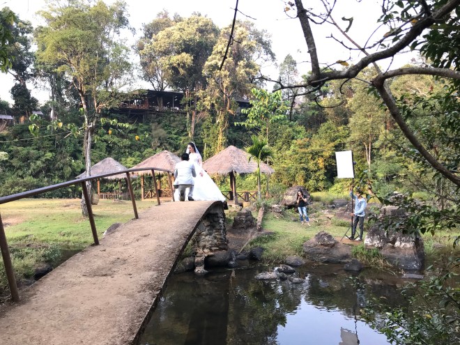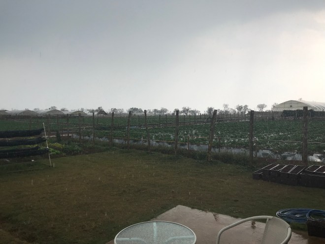 Petite halte pour déjeuner à l’exploitation de fraises du pays tenue par un Japonais, Yamamoto, ça ne s’invente pas…À Paksong, il fait plutôt frais, presque comme en Normandie, la plupart des légumes et des fruits de la moitié sud du pays viennent de ce plateau qui culmine à 1300 m. Et puisque c’est comme chez nous, on s’est pris une belle averse…