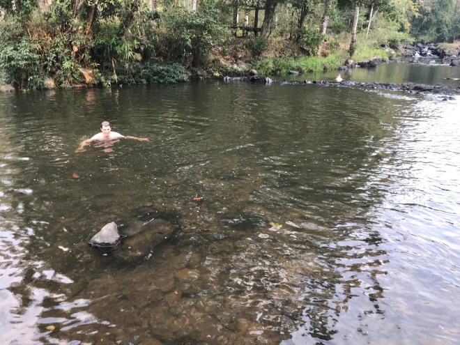 C’est trop bien de flotter sur le dos, dans une eau à la température du corps, les oreilles dans l’eau pour se couper du bruit, et de regarder les feuilles qui bougent au gré de la petite bise, avec un ciel bleu magnifique en arrière-plan, sans penser à rien, juste profiter du moment présent. On y a passé une heure sans s’en rendre compte 🙂