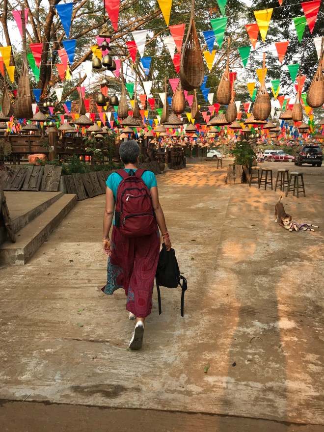 Départ de Chiang Maï pour Paï, petite ville dans la montagne distante de 130 km, 3h de route, avec une pause officielle de 15 min…je vous laisse imaginer la forme de la route…non, je vous aide, des tournants, des tournants et des tournants…heureusement on est dans un van qui a exactement le nombre de passagers pour lequel il est prévu (ce qui est rare), il n’y a que des occidentaux sauf un couple de japonais dont le mari va nous obliger à un arrêt non prévu, les virages étants vraiment serrés et rapprochés. Cet arrêt nous permet de discuter avec les autres voyageurs, 3 allemands, 2 anglais et 1 américain, j’adore ce genre de moment où on discute sans se connaître, comme dans les grèves de métro, ou les moments où on doit attendre et que ce n’est pas prévu, les gens se parlent et on apprend plein de choses.