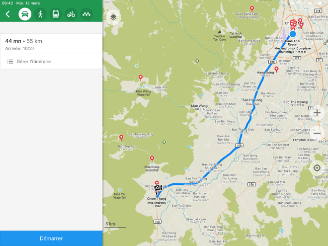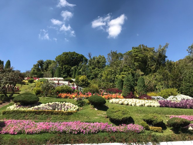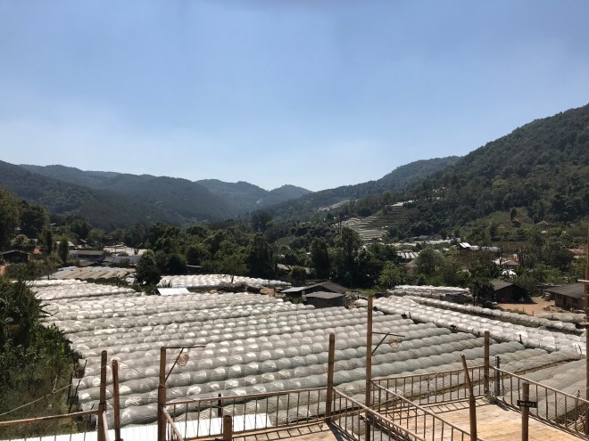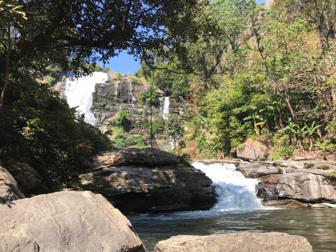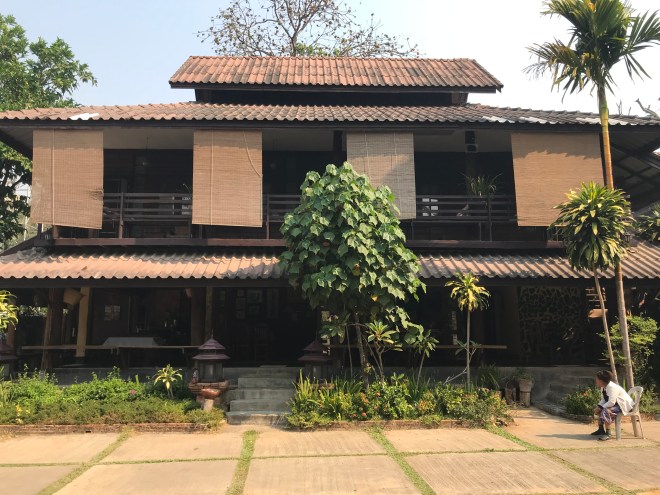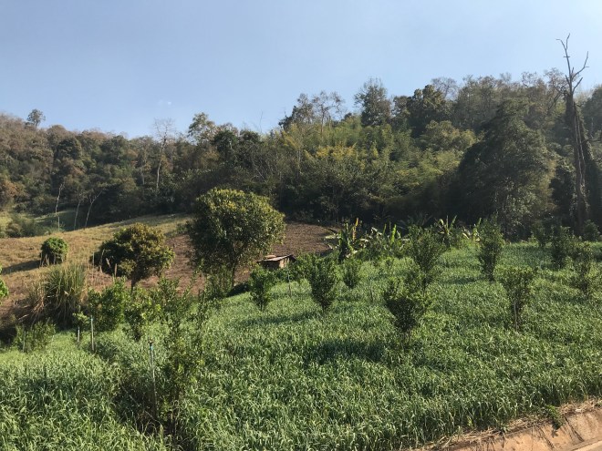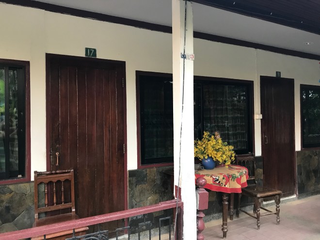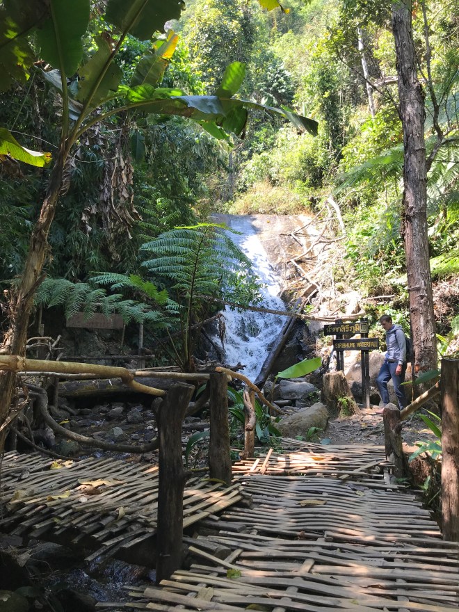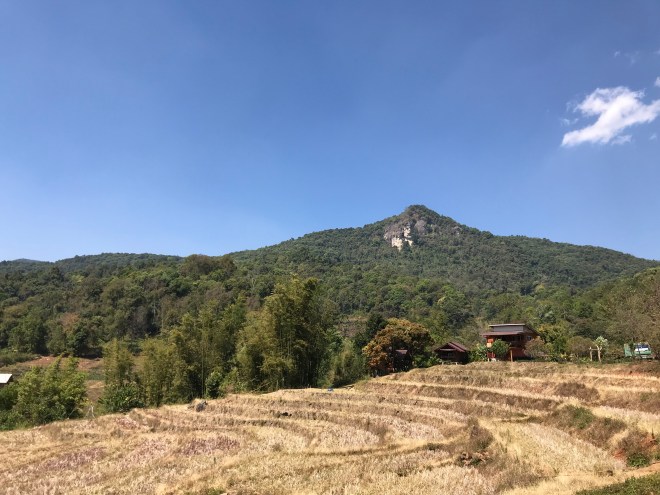 Arrivés à Chiang Maï, nous récupérons les valises laissés à l’hôtel pour aller les déposer dans le nouvel hôtel proche de ma formation le Baan Thaï Resort où je vais séjourner pour la fin de mon séjour ici ( Resort, ça fait class mais c’est un endroit assez simple en réalité !). Ça fait du bien de savoir que je vais pouvoir enfin me poser un peu 😉 Déjeuner puis petite baignade vite fait dans la piscine de l’hôtel, préparation des sacs pour 2 nuits et c’est reparti pour 1h30 de bus public vers Chom Thong pour se rapprocher de Doï Inthanon, la montagne qu’on doit « escalader » demain.