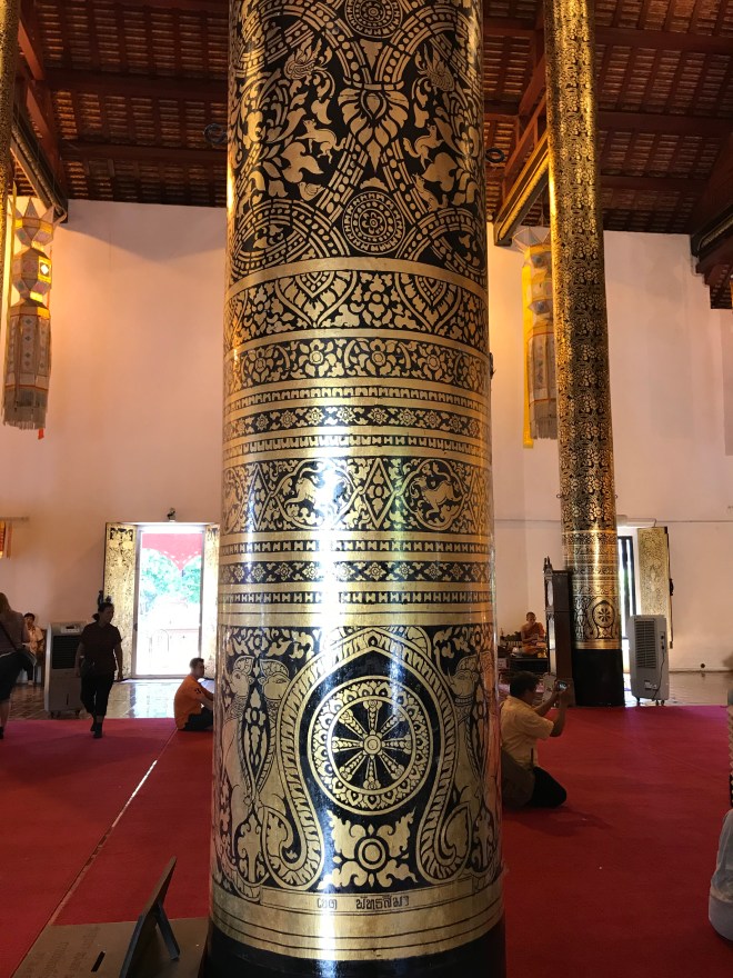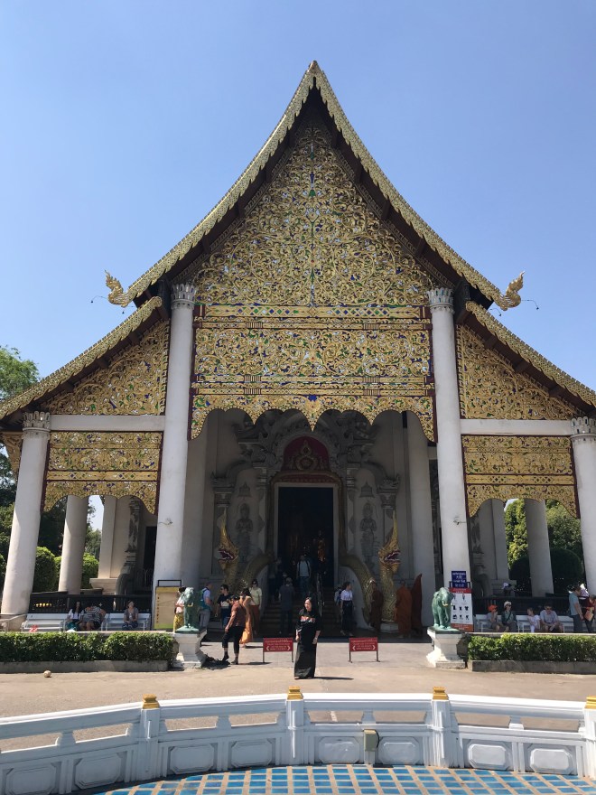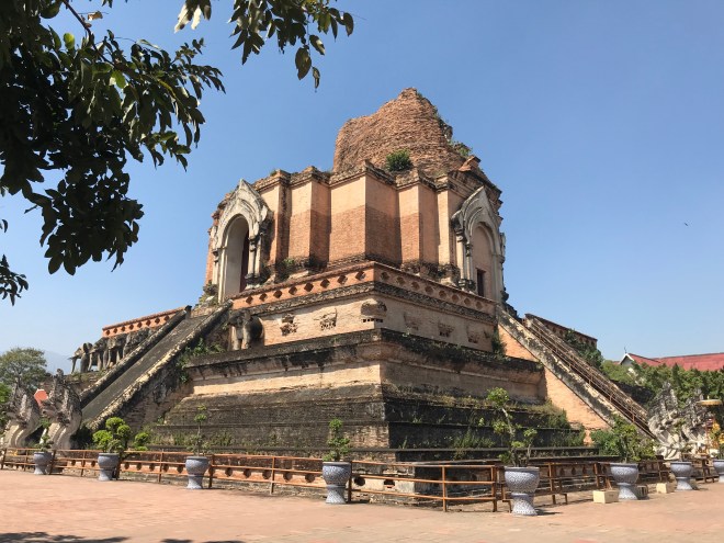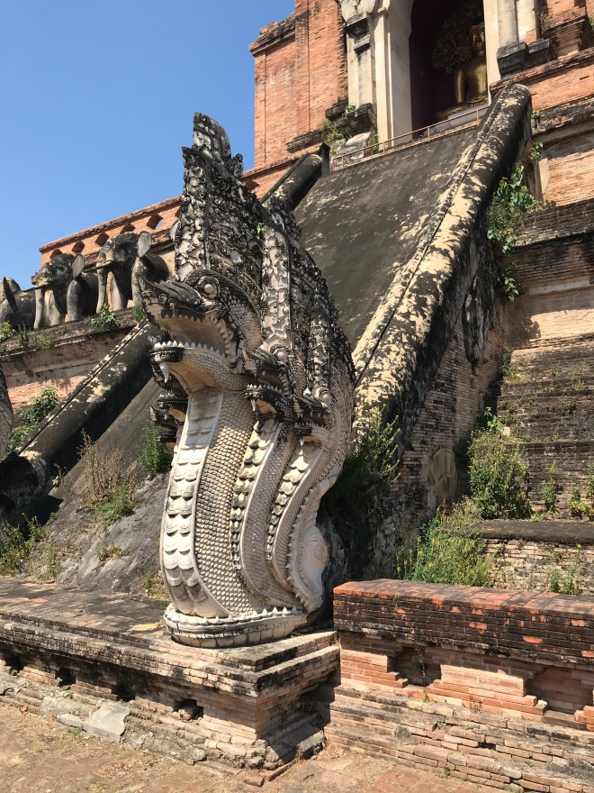 Chiang Maï, deuxième province du pays, plus d’1 million d’habitants, la ville en elle-même est plutôt à taille humaine, 250 000 habitants, l’agglomération tourne autour de 700 000 habitants. L’hyper centre est carrément touristique, entouré par une muraille dont il reste de beaux vestiges ( elle date du 13ème siècle quand même…), 300 temples, vous verrez pas mal de photos mais j’espère que ça ne vous barbera pas, on n’en visitera pas tant que ça 😉