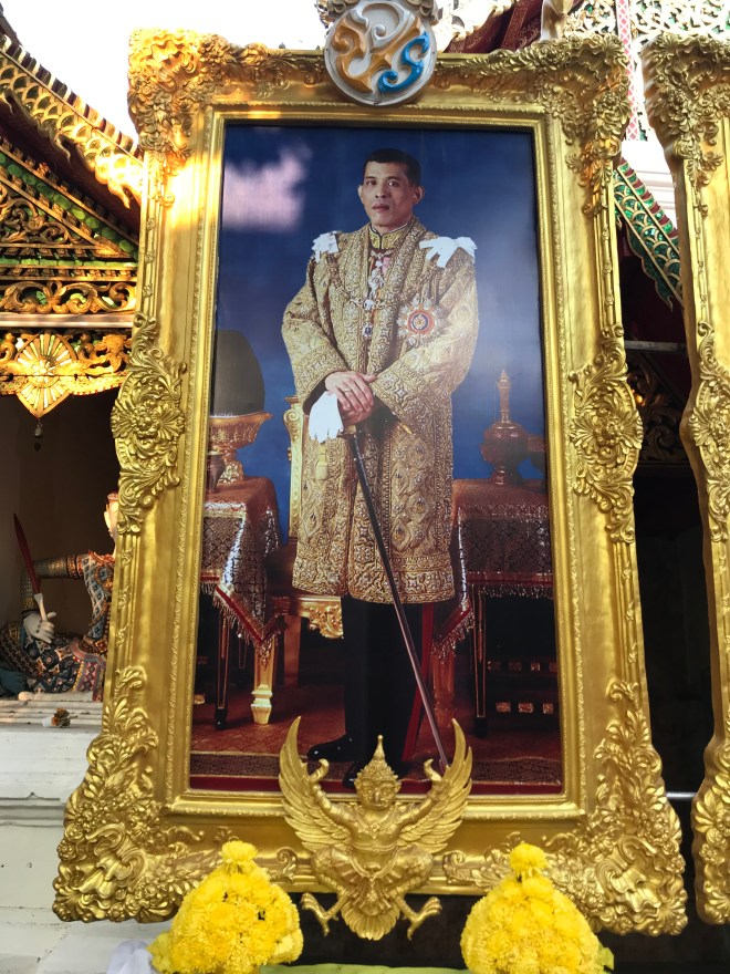 Je ne vous ai pas parlé du roi de Thaïlande, ne me demandez pas son nom, il y a Wikipedia… Ici, il est vénéré, son portrait est présent à chaque carrefour important des villes et dans chaque commerce voire maison. L’année dernière c’était son père qui était partout, mais il est mort et après presque 1 an de deuil national, ils ont changé toutes les représentations, y compris sur les billets qui commencent à avoir le nouveau roi en effigie. Paul trouve qu’il ressemble à Stromaé, moi au prince Charles…je vous laisse voir 😉