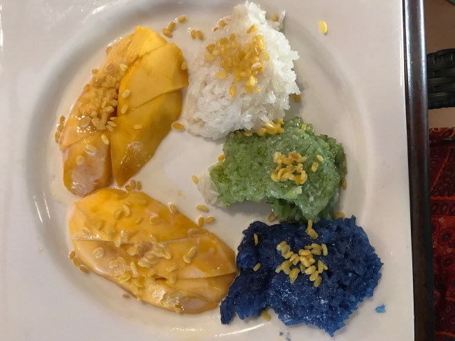 Mon petit déjeuner, mangue et riz gluant, butterfly peas (bleu) et macha (vert), tout naturel vraiment !Enseigne d’un barC’est réellement de l’essence dans les bouteilles, tout se recycle ici 😉Notre première guesthouse, hyper bruyante, près d’un bar de nuit 😦