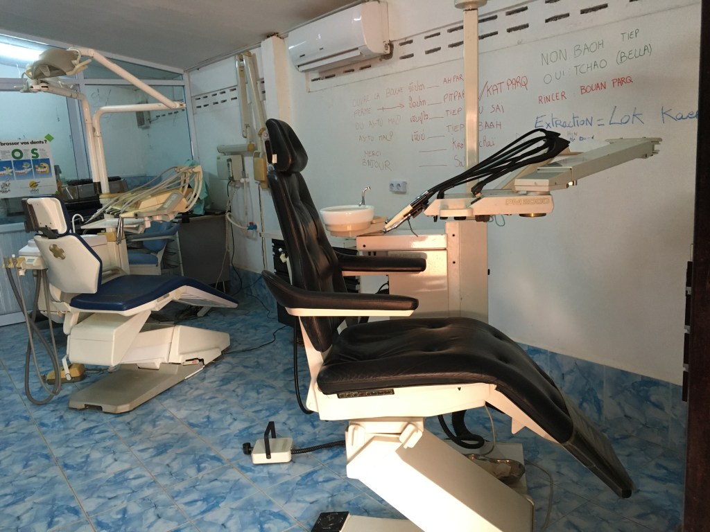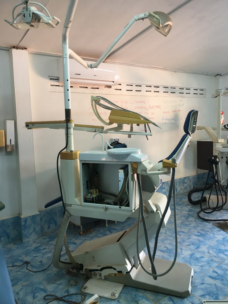 Petit arrêt rapide chez le chef du district.Il va falloir virer les motos et nettoyer un peu le mur, c’est l’hôpital qui s’en occupe 😅.Le cabinet dentaire. Oui, c’est bien de la moisissure sur le fauteuil, il y a du taf 😱.Meeting au sommet 😉 de gauche à droite : Sina, Inpong (le directeur), les « sisters », l’intendante, ?, et moi 😃