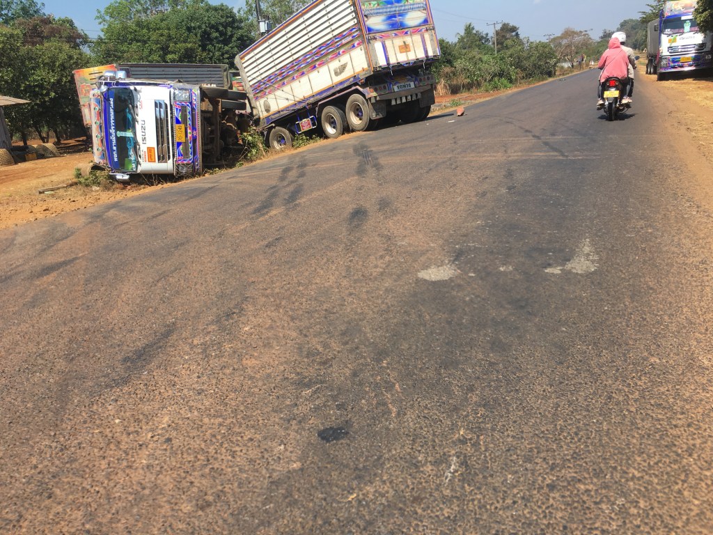 Je décide de commencer par Tad Vang Yang située à 34 km au nord-est de Paksé, sur la route qui mène au fameux plateau. Les 20 premiers kms sont sans intérêt, je roule sur une sorte de 4 voies sans véritablement quoique ce soit à voir à part à un moment où il y a plein de stands de vanneries en tous genres à vendre sur 500m des deux côtés de la route. Je retrouve sans réel plaisir les camions thaïs, qui ont beau être très jolis, roulent comme des tarés y compris sur les routes plus petites. D’ailleurs voilà ce que j’ai vu peu de temps après avoir quitté la 4 voies…