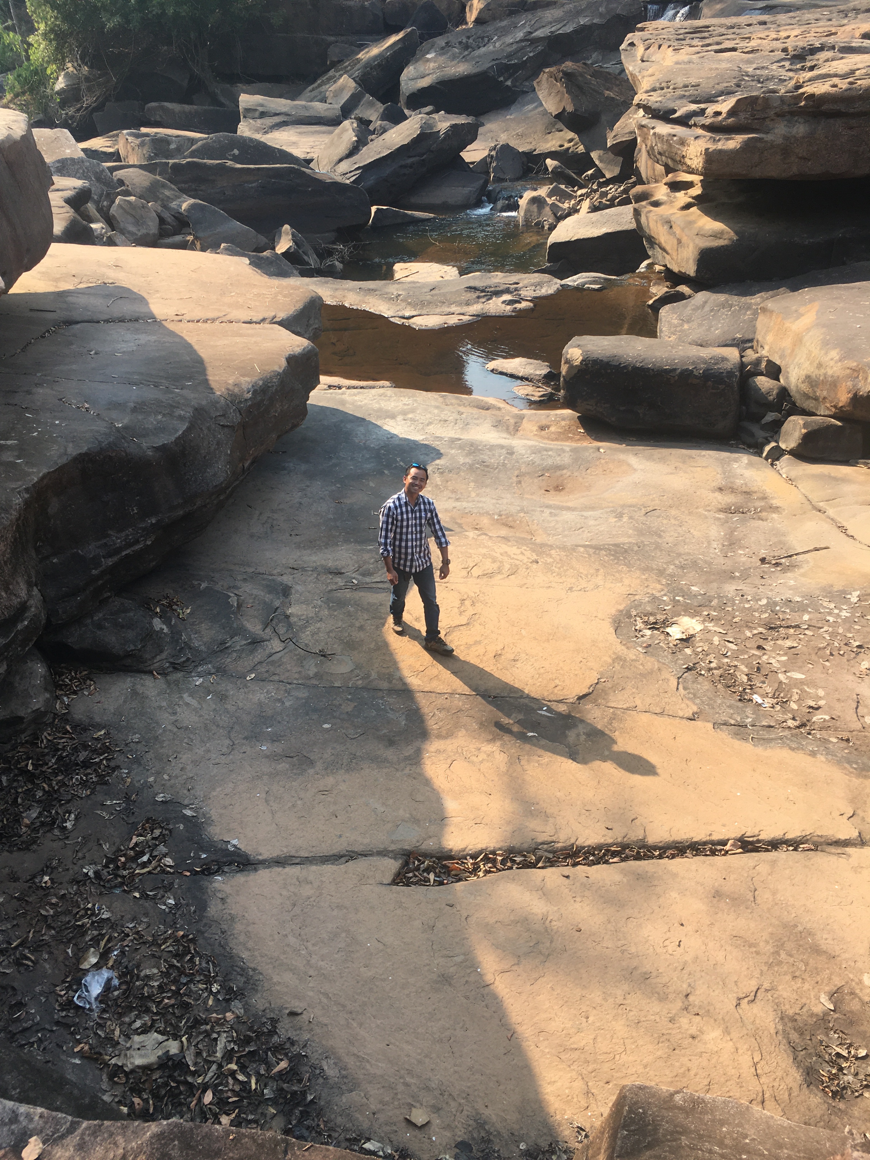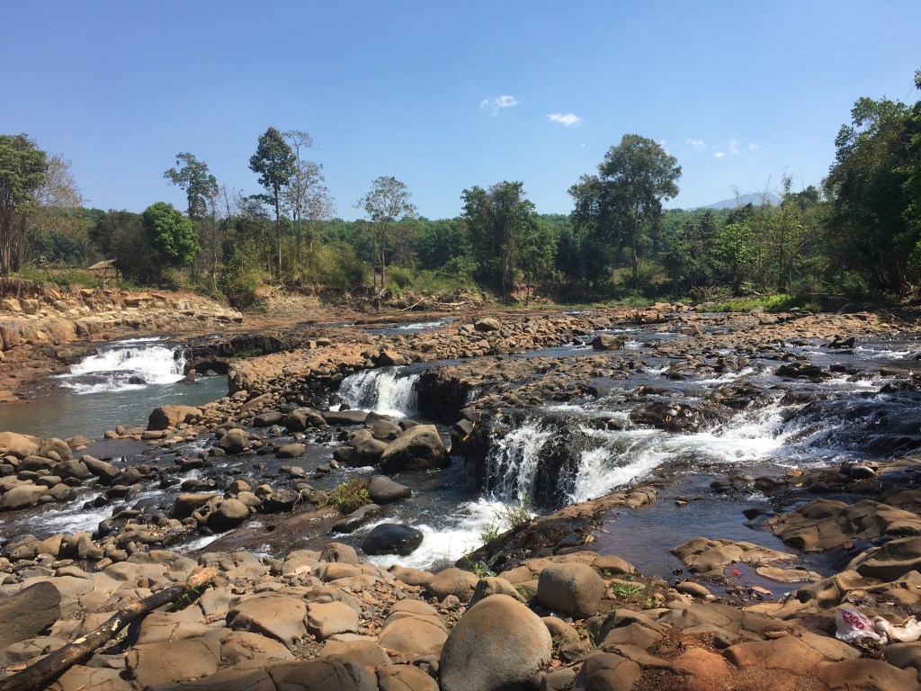 Et voilà Tad Vang Yang, il m’a quand même fallu faire deux km de piste pour la rejoindre mais celle-ci était un peu plus praticable et je n’ai croisé qu’une moto. A la cascade, il n’y a personne, mais vraiment personne, ni enfants, ni pêcheur…bon, en même temps, il est midi et le soleil cogne bien, d’ailleurs, je sens que je vais me chopper des coups de soleil sur les bras et dans le cou, mais pas sur le visage, j’ai un casque à visière 😅. Il n’y a pas une habitation à moins de 500m alors je me contente de tremper les pieds parce que je me dis que si je glisse et que je me tords une cheville ou que je me fracasse sur un rocher, je risque d’attendre un moment de l’aide 😕. C’est dommage parce que l’eau est bonne, avec de la profondeur pour nager et le site est magnifique. Si Philippe et les enfants avaient été là, ils se seraient bien amusés, il faudra que j’y revienne avec eux 😃.