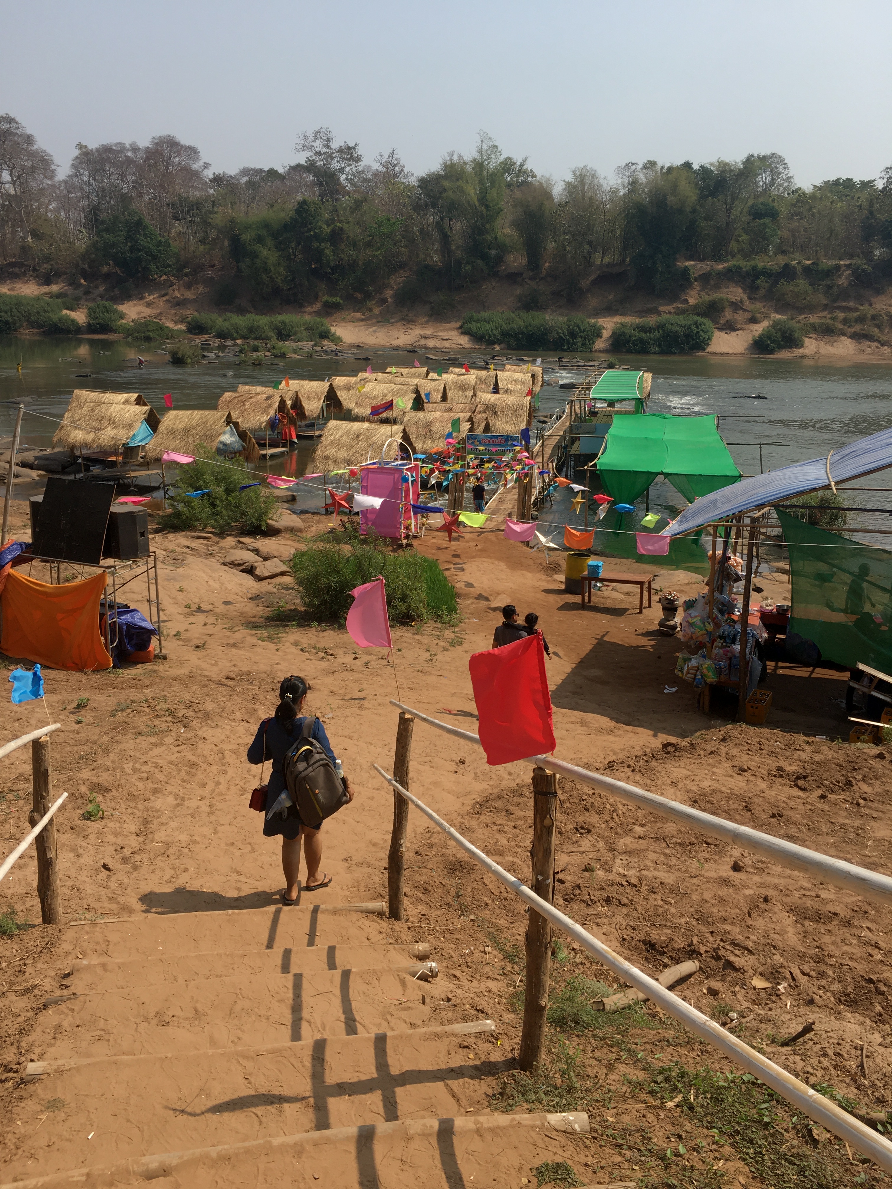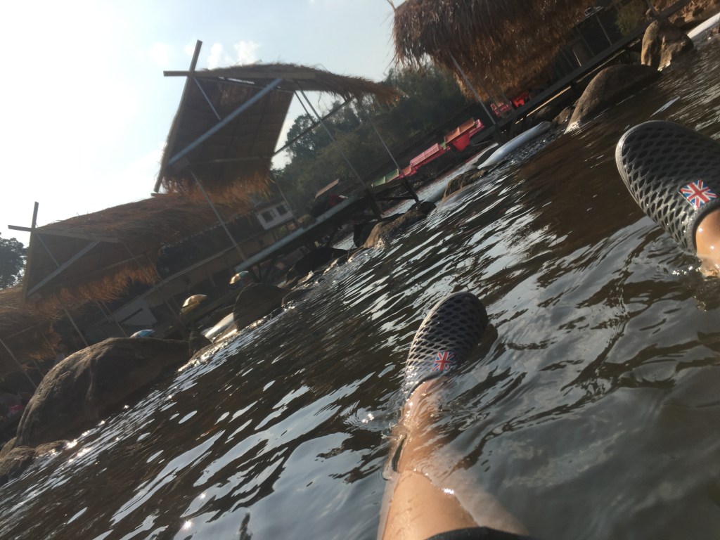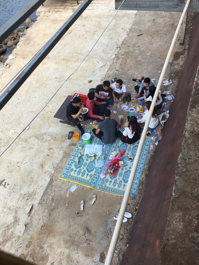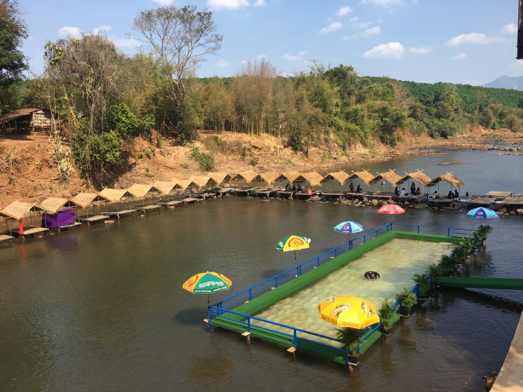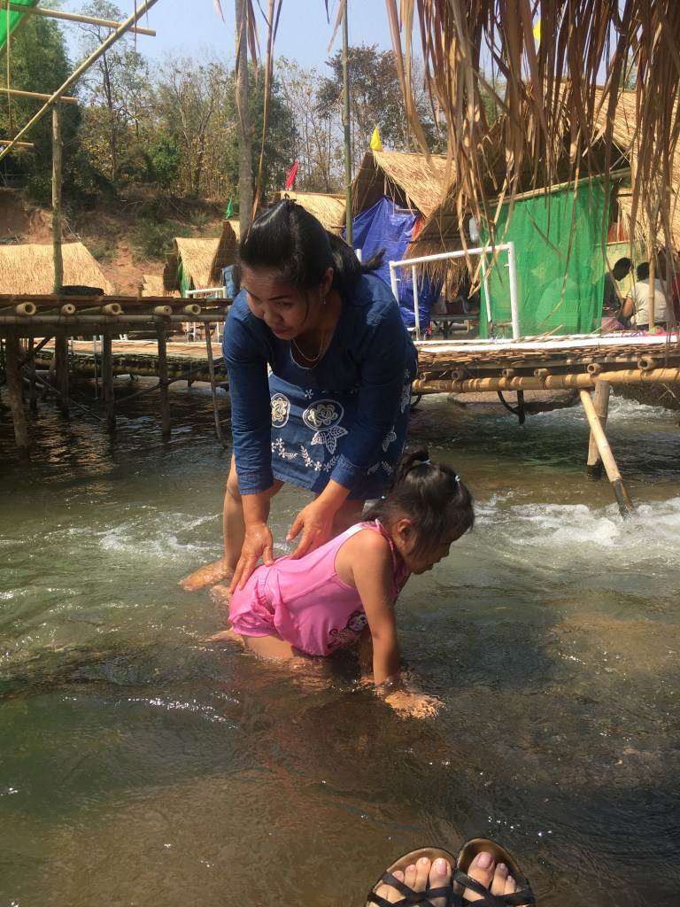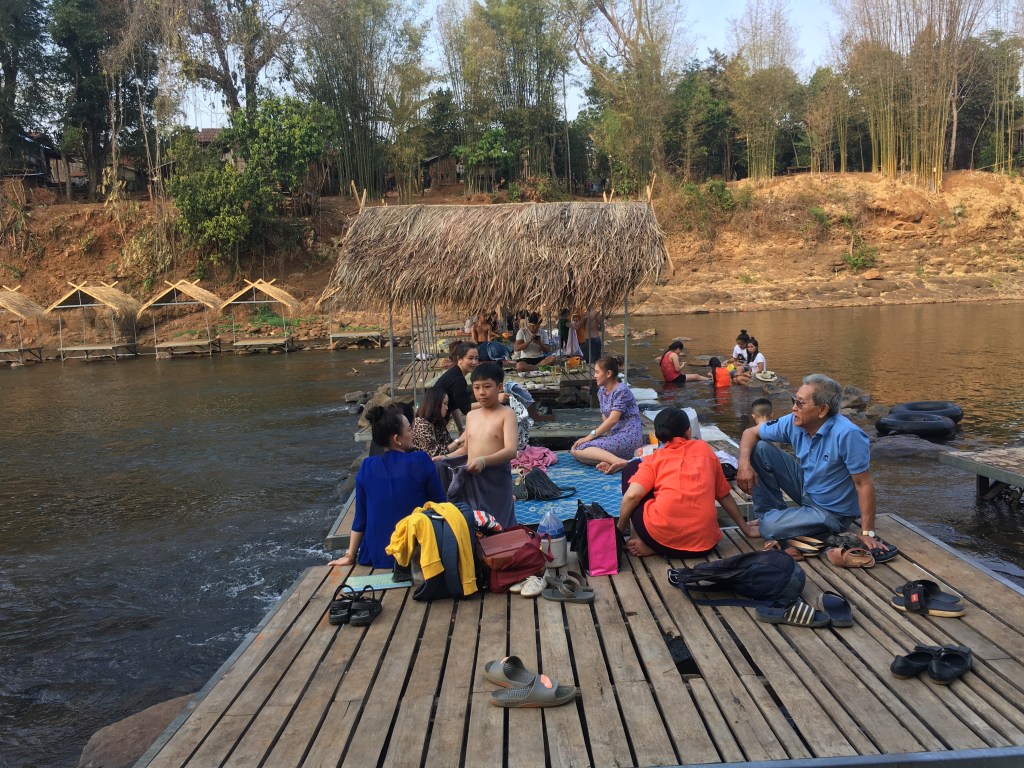 C’est un lieu de détente pour les laotiens plutôt aisés, on est samedi, les gens décompressent. Ils se regroupent par famille ou amis. Ils mangent toute la journée et la bière coule à flot. Les laotiens se baignent toujours tout habillés, tout comme moi d’ailleurs, déjà que je suis la seule blanche, je ne vais pas, en plus, me mettre en maillot 😇.