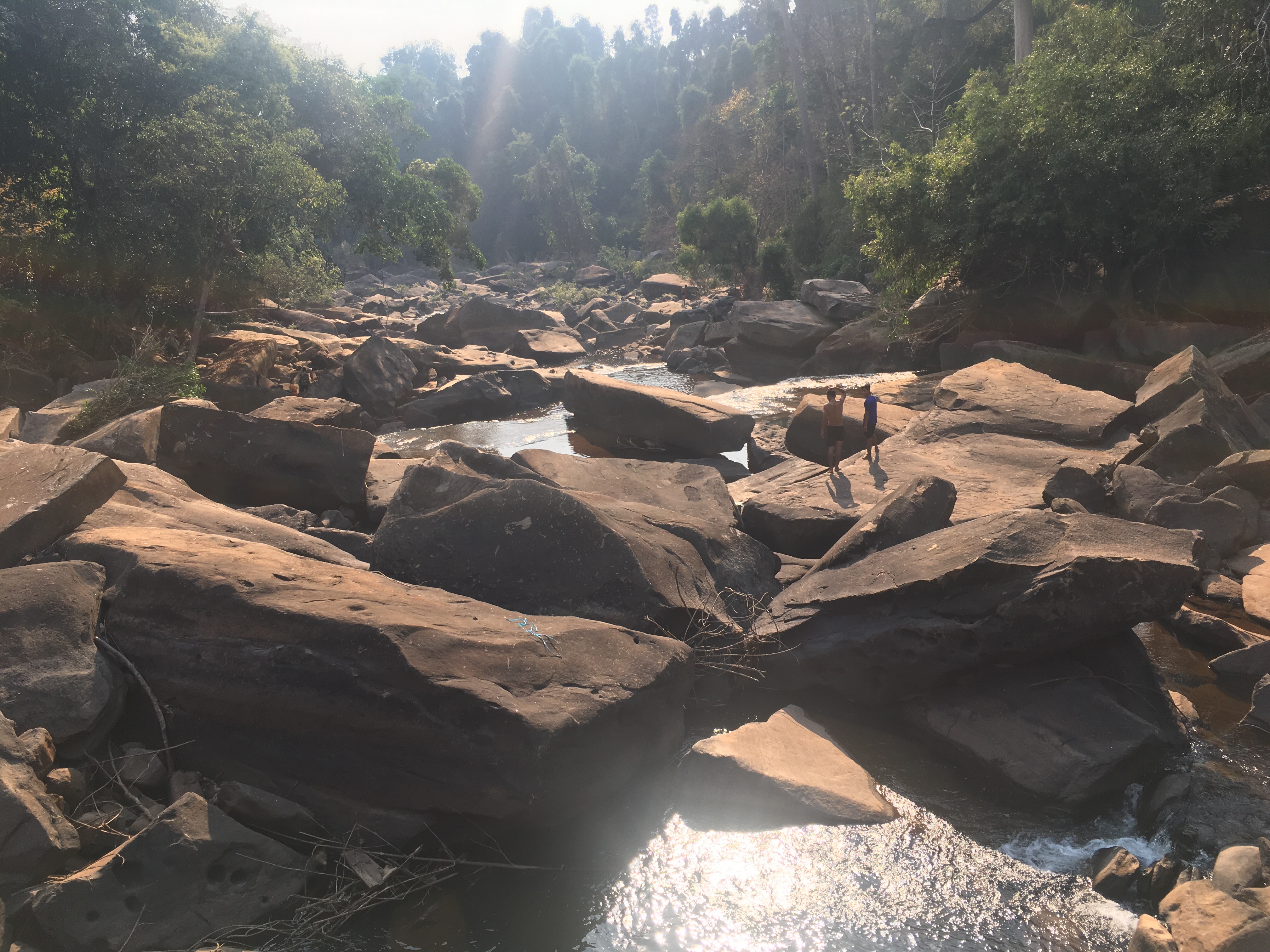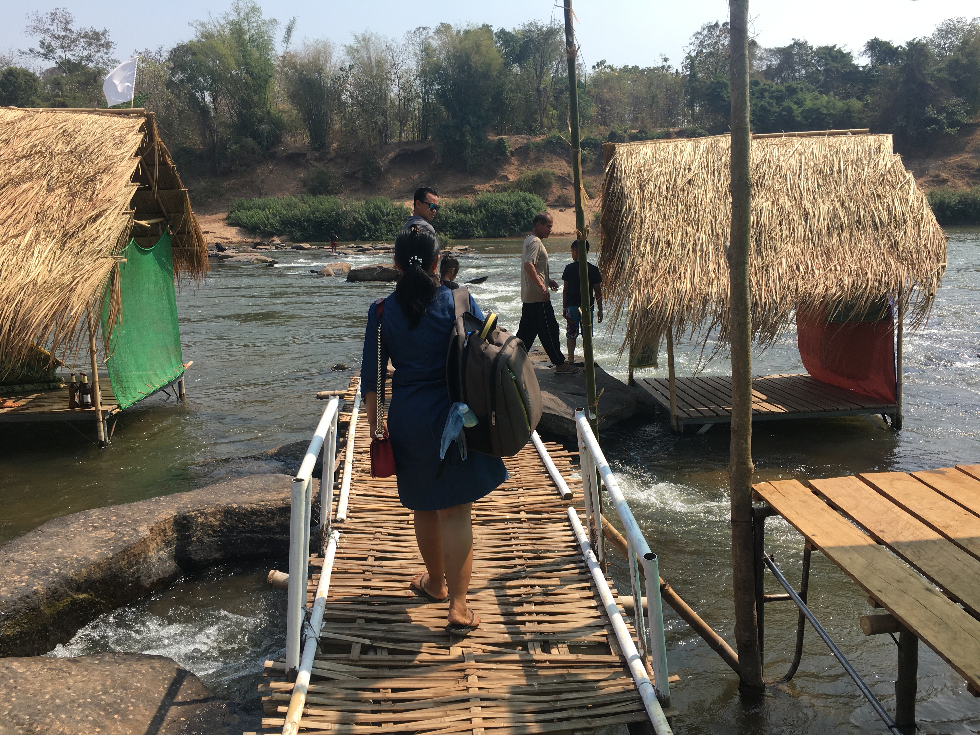 Puisque je n’ai pas pu me baigner, je décide de prendre une valeur sûre, Tad Phasuam et Maak Ngaew, deux cascades à 50m l’une de l’autre mais sur deux rivières différentes. La première, qu’on approche en passant un gros pont construit par des japonais si mes souvenirs sont exacts, est inaccessible au-delà d’un certain point et l’autre, dans laquelle on peut se baigner, on y accède par un petit chemin et un pont en bois. On a eu l’occasion de les faire avec Philippe, Marie, Laurent et Flavie et j’y étais retournée avec Paul, Phonesavanh et sa famille l’année dernière. Malheureusement, la grosse crue du Mékong début septembre 2019 a fait d’énormes dégâts sur ce site, le gros pont s’est effondré, on ne peut plus accéder à la première cascade, quand à la deuxième, même chose, on peut la voir d’en haut mais plus y descendre pour se baigner et il n’y a plus de petit resto pour déjeuner non plus 😩.