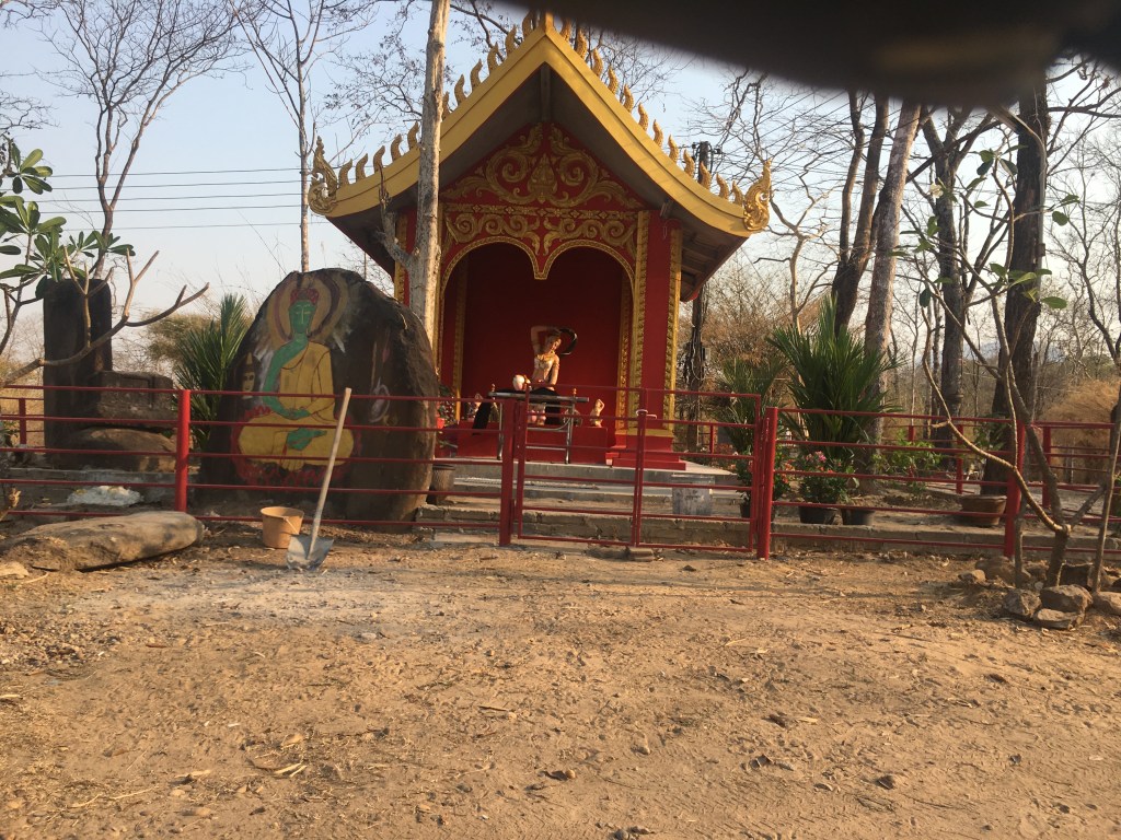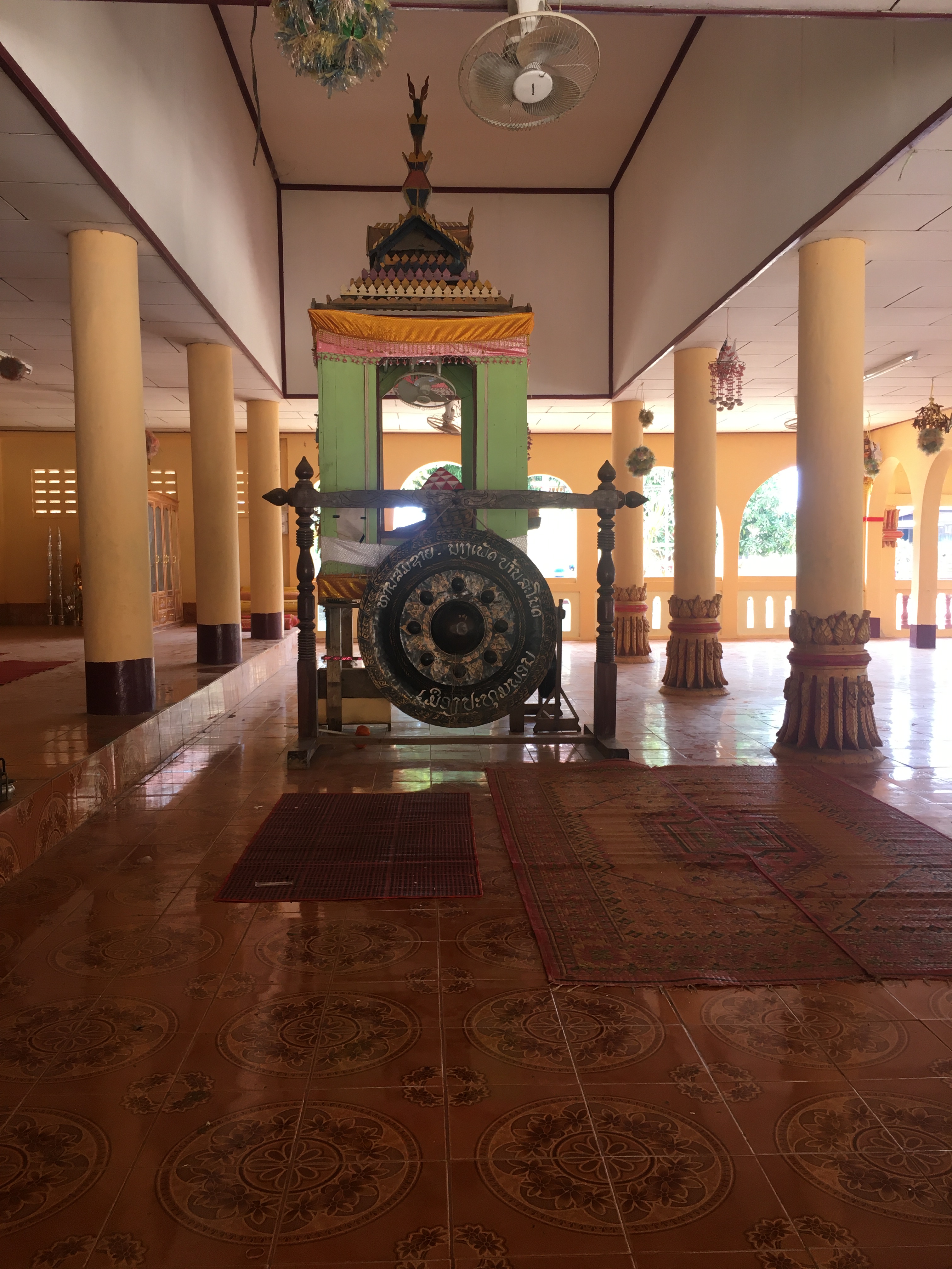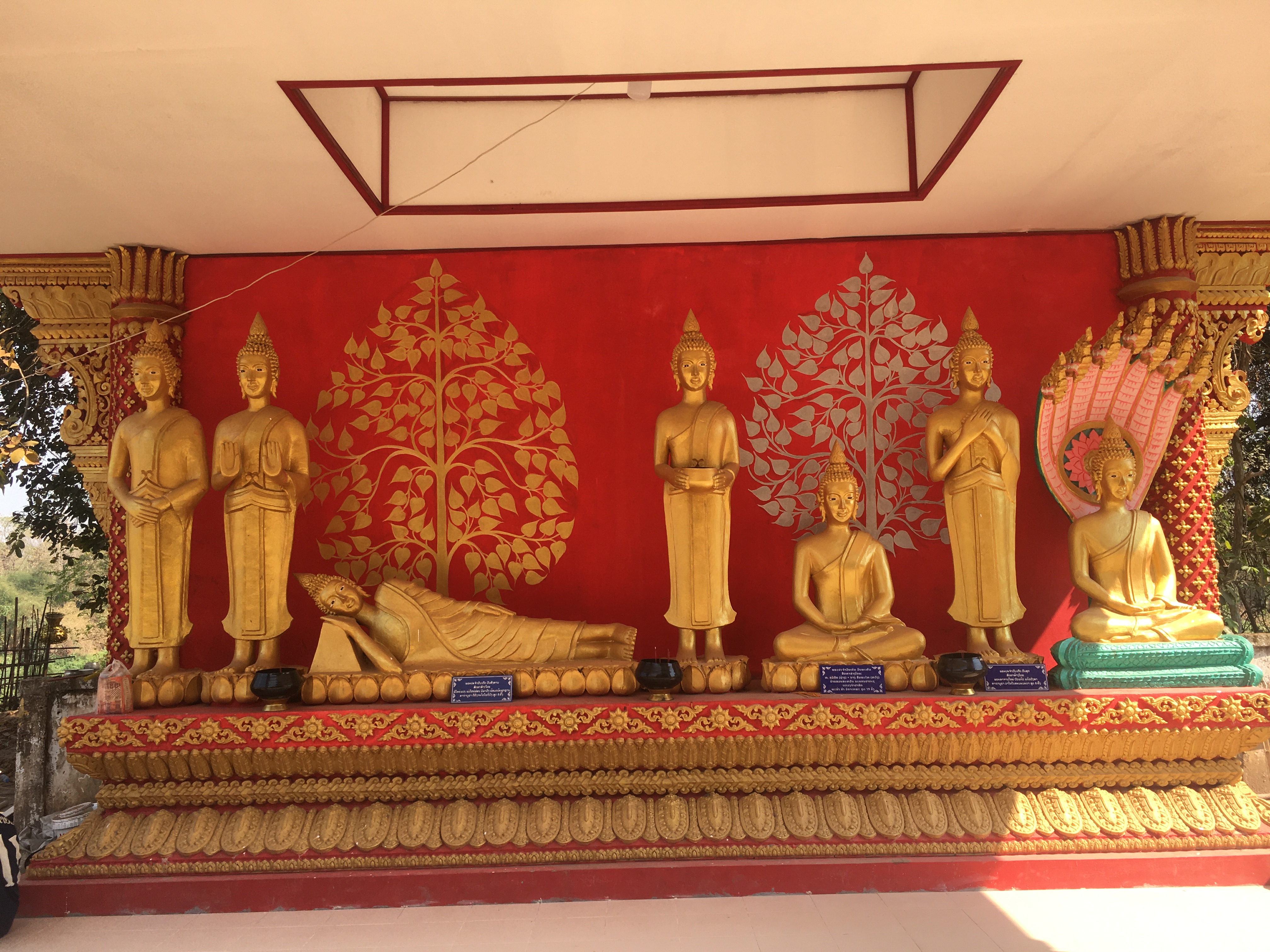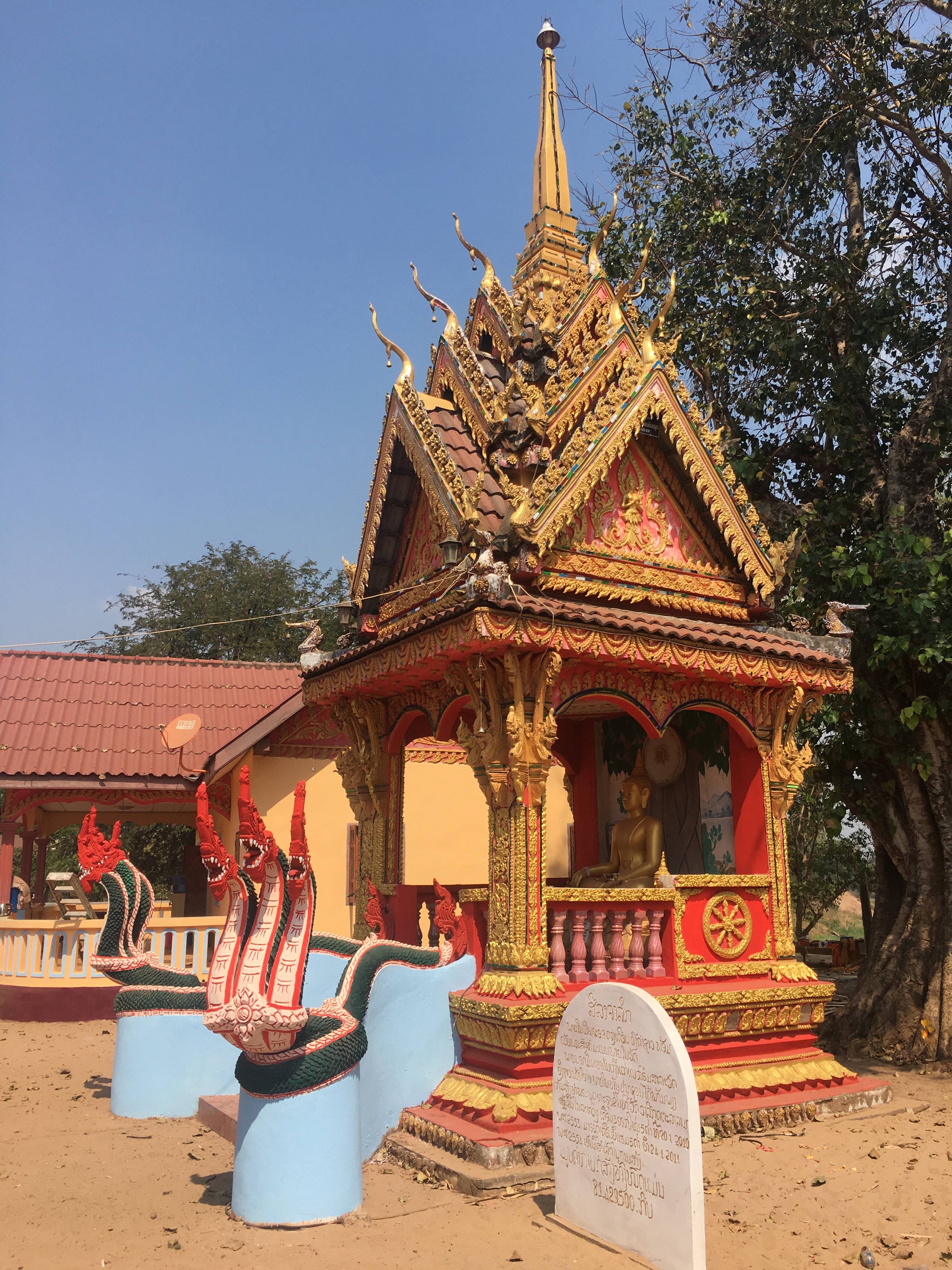 Après ça, nous reprenons la route pour aller dans un petit village de pêcheurs dans lequel Phonesavanh allait avec sa copine quand elle était ado, je n’ai pas compris pourquoi elle faisait ça, mais bon, le challenge était sûrement de faire les 6 kms qui la séparait de sa maison en vélo, juste pour le fun…j’ai bien fait ce genre de choses, les ados sont bizarre des fois 🙃. Il s’y tient un tout petit marché, typiquement local et il y a, comme dans tous les villages, un temple, celui-là s’appelle celui de la vache rouge.