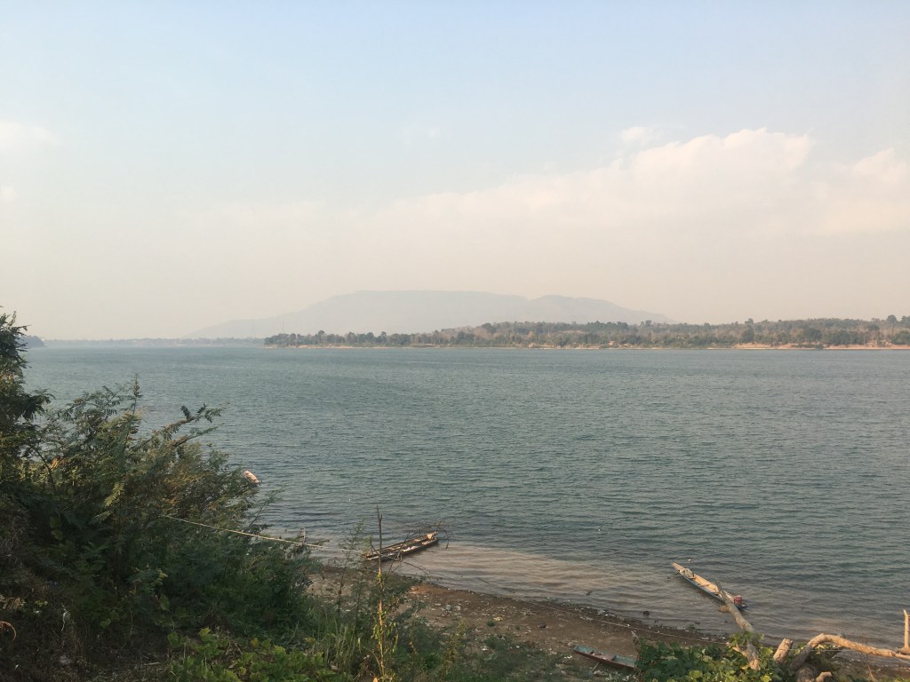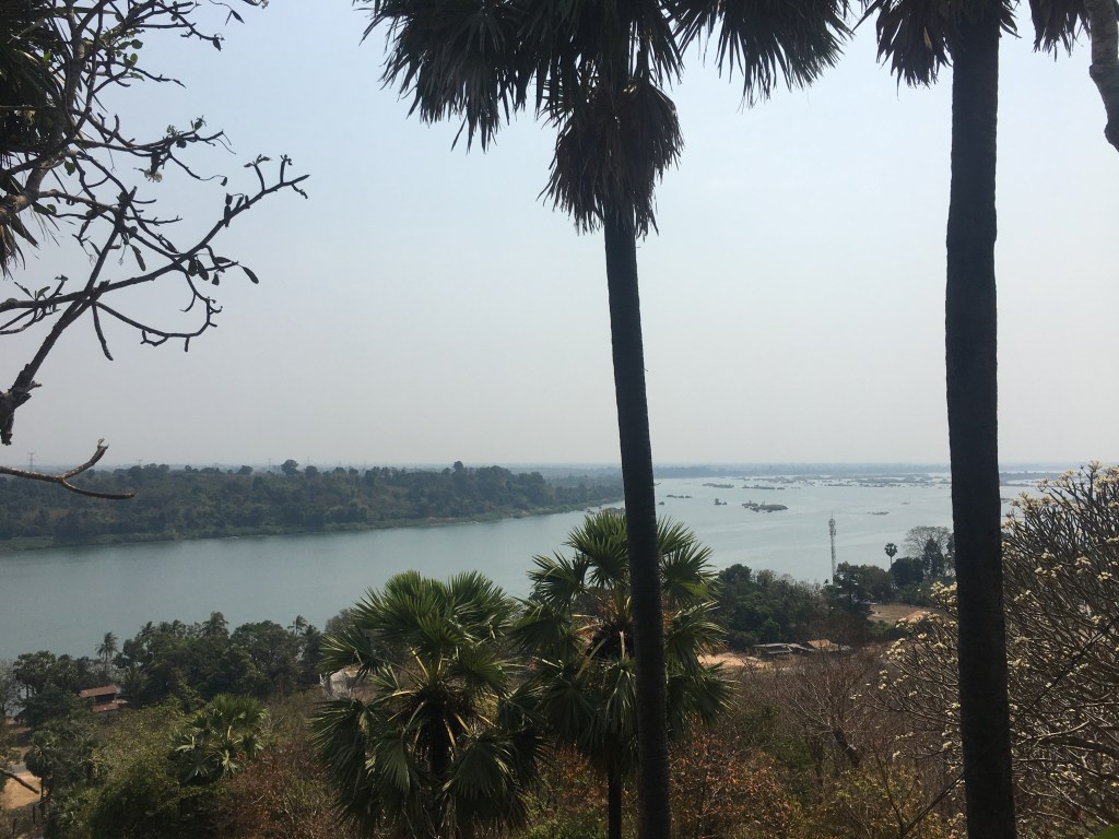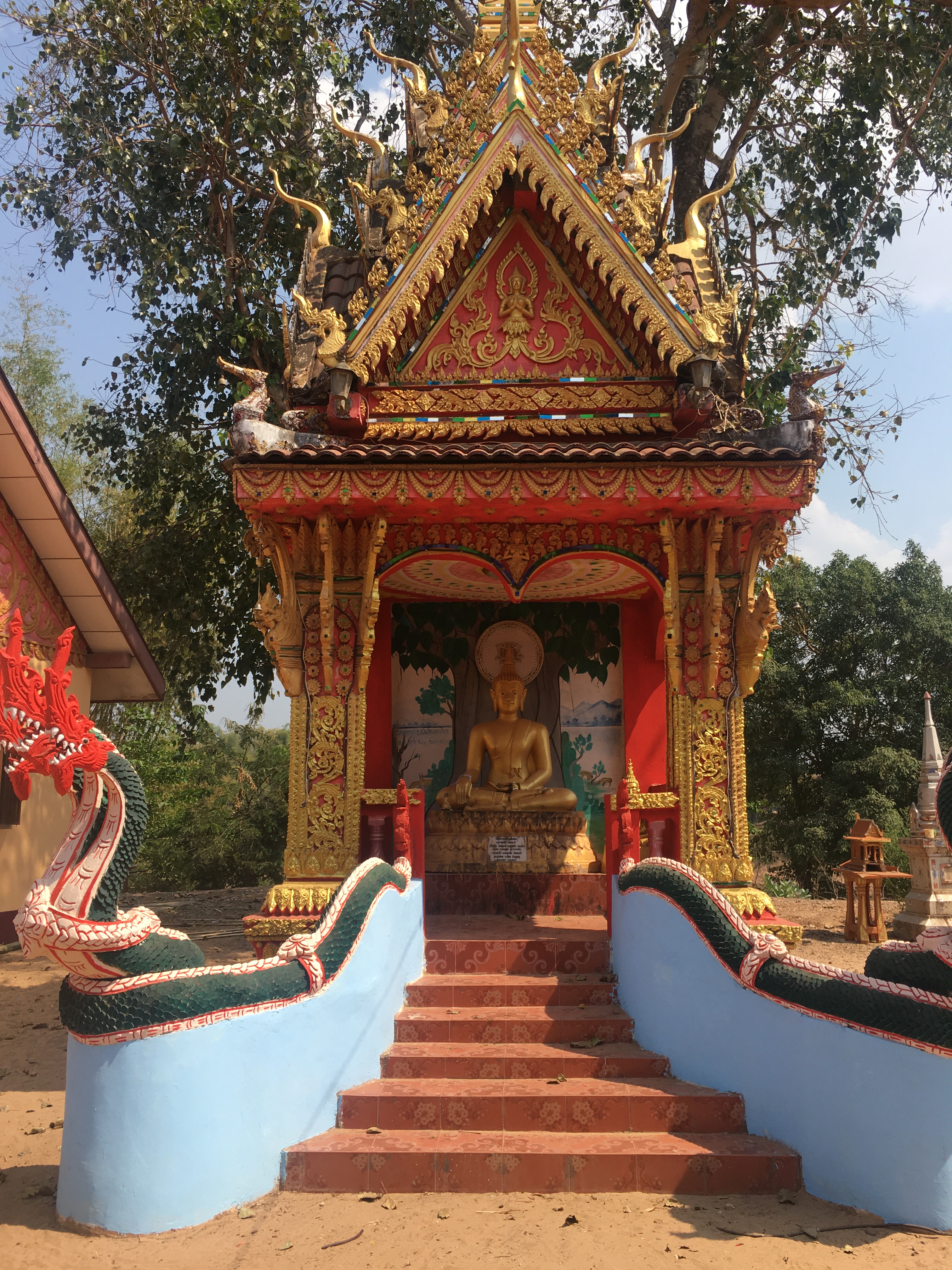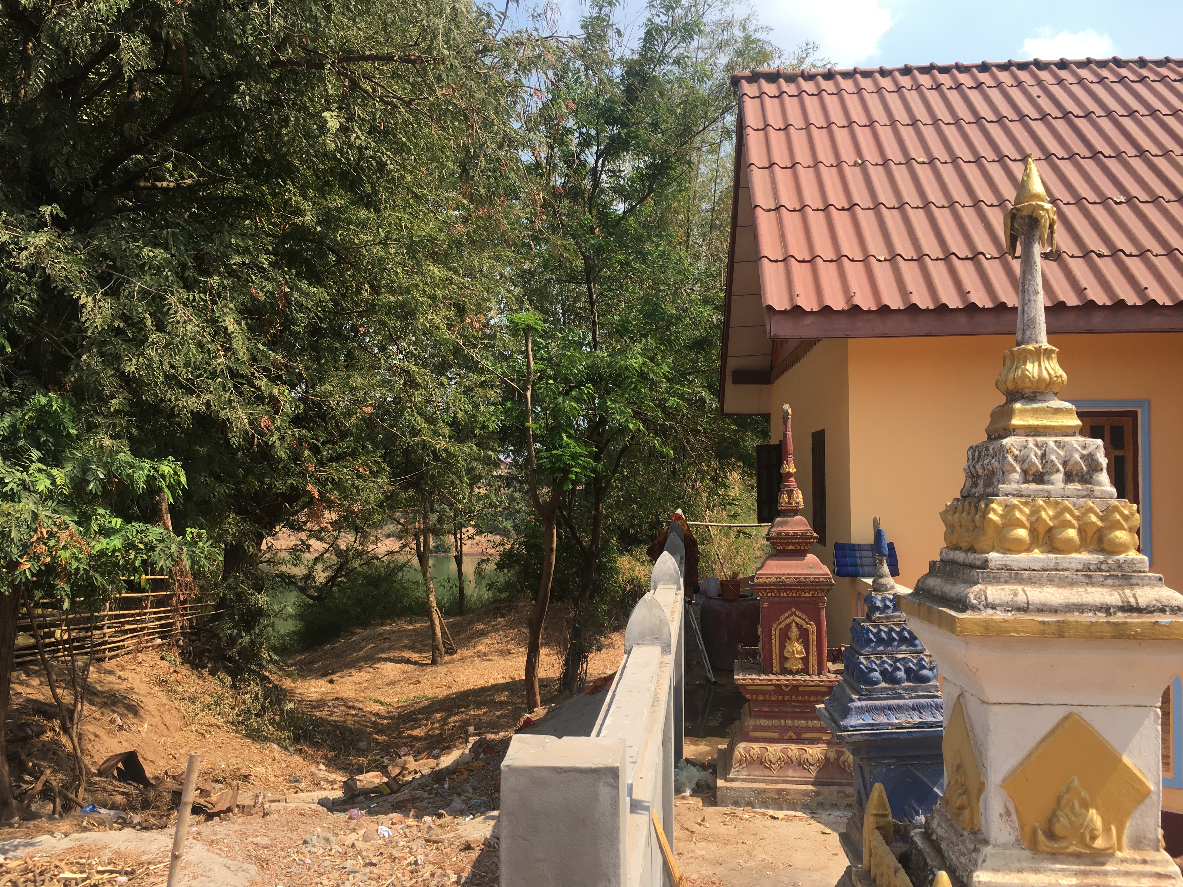 Il est grand temps que j’aille voir mes amis Nilavanh et Claude à Champasak. Après m’être assurée qu’ils étaient bien là et m’être faite invitée à déjeuner, je prends la route tranquillement. Je me permets des arrêts quand ça me chante parce qu’il y a encore pleins d’endroits que je n’ai pas explorés sur cette route. Comme ce temple par exemple, situé sur les hauteurs, qui a une vue plongeante sur le Mékong…