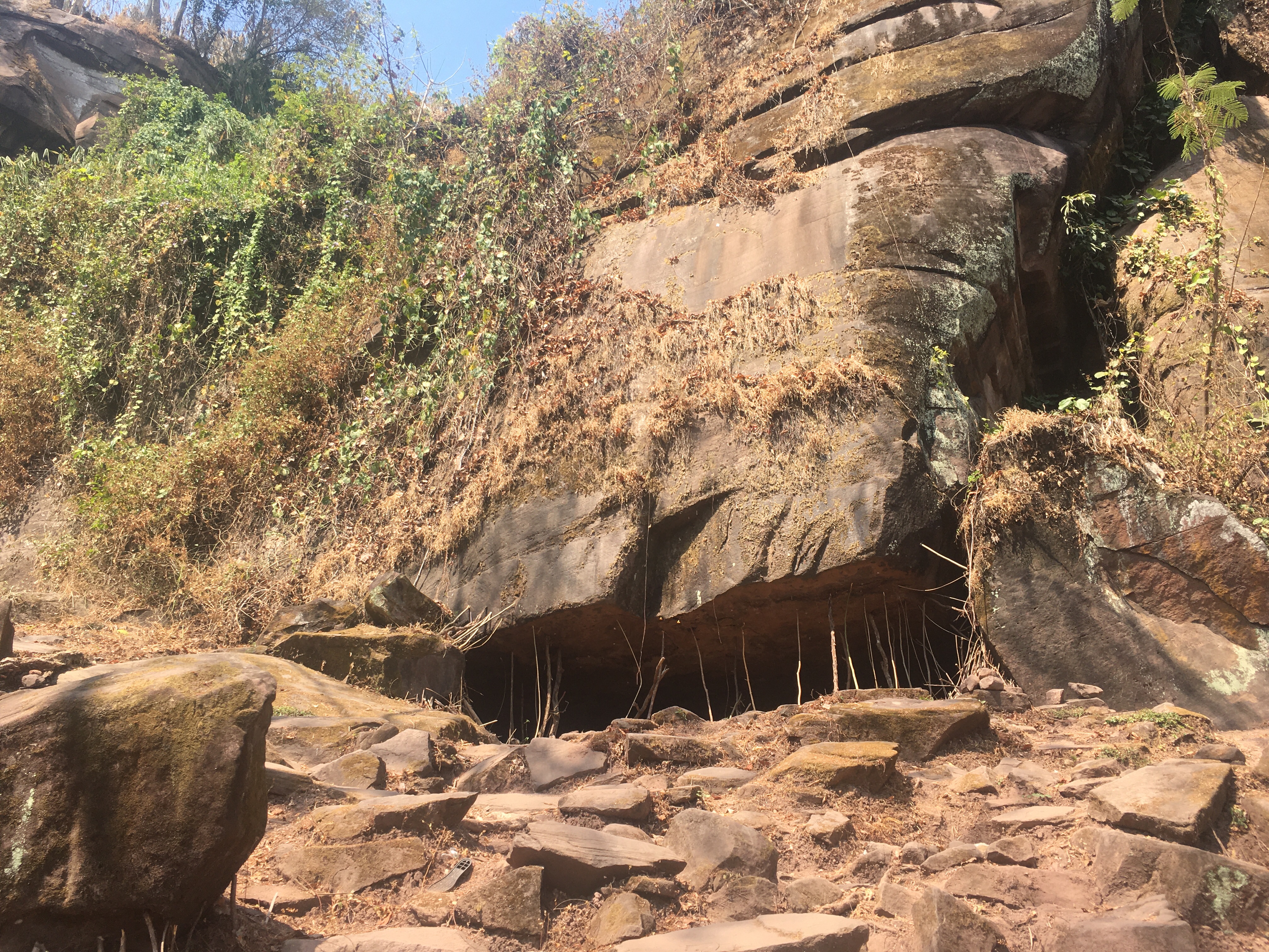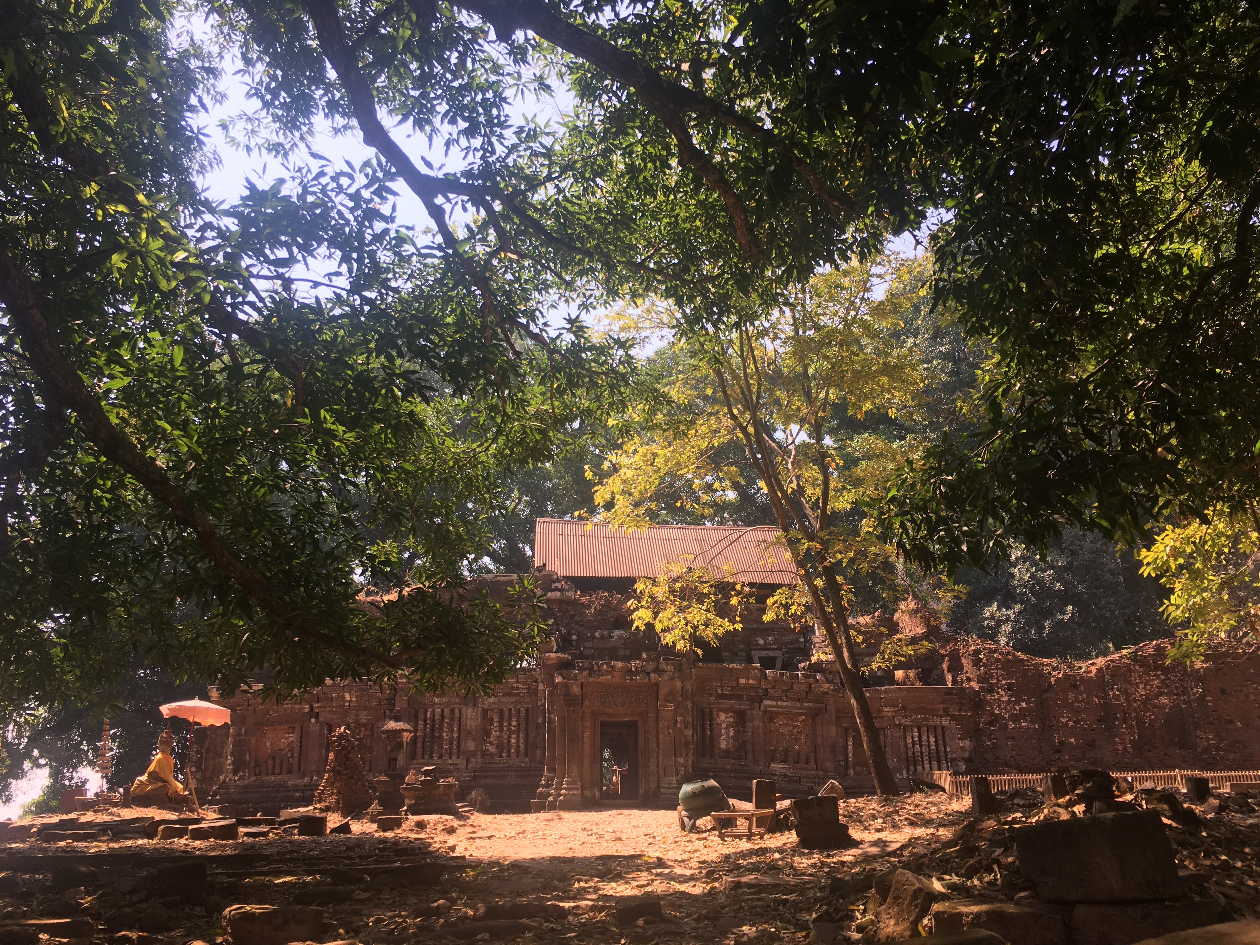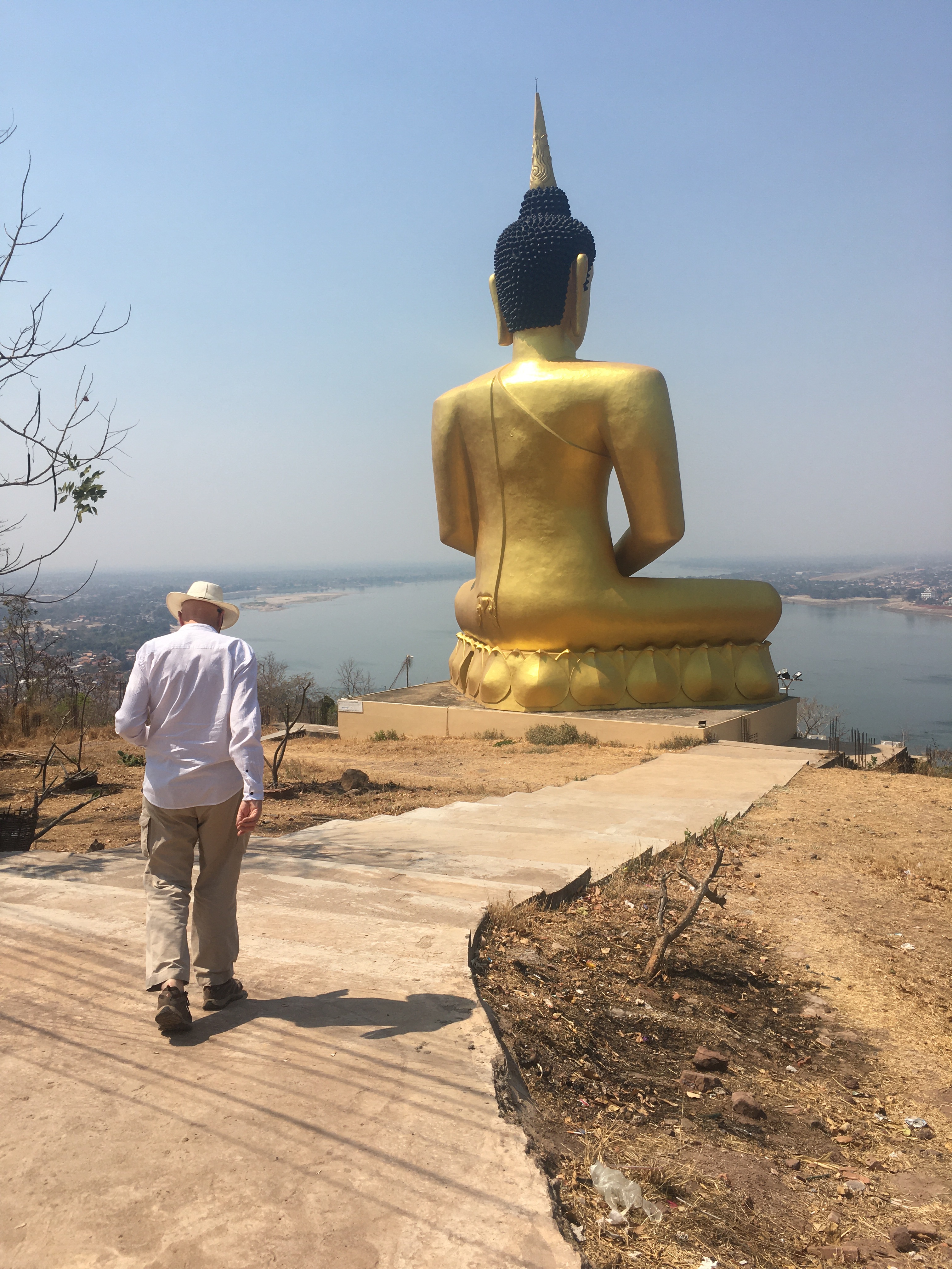Il est grand temps que j’aille voir mes amis Nilavanh et Claude à Champasak. Après m’être assurée qu’ils étaient bien là et m’être faite invitée à déjeuner, je prends la route tranquillement. Je me permets des arrêts quand ça me chante parce qu’il y a encore pleins d’endroits que je n’ai pas explorés sur cette route. Comme ce temple par exemple, situé sur les hauteurs, qui a une vue plongeante sur le Mékong…