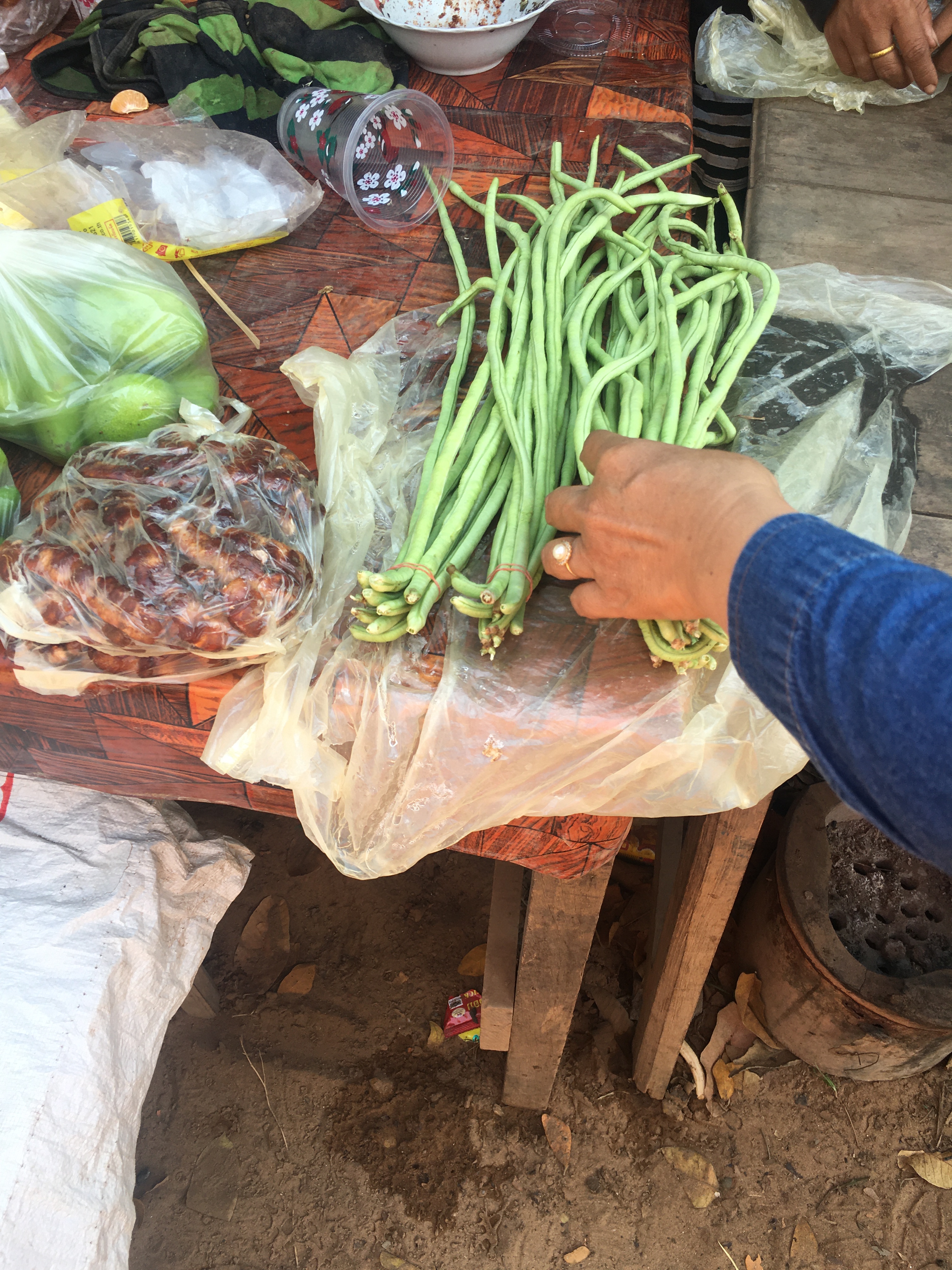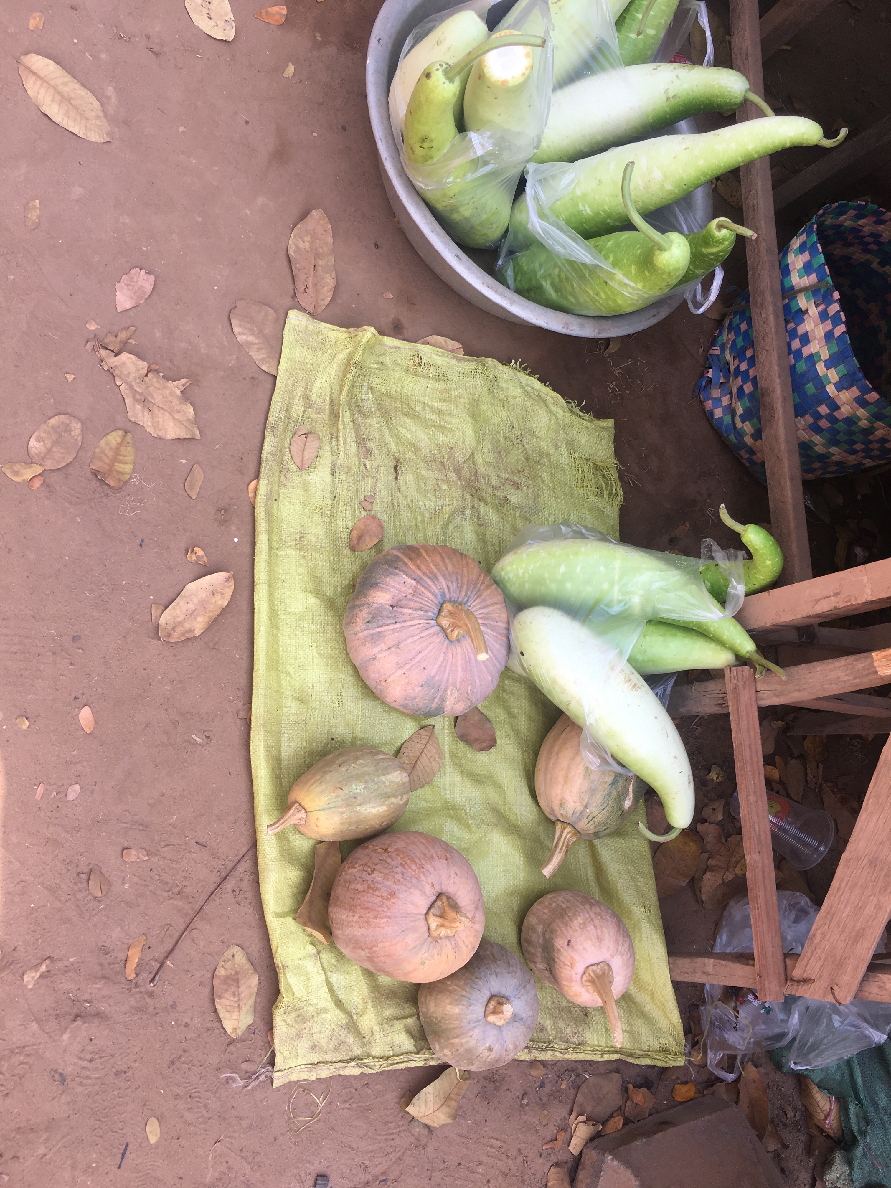 Regardez bien la taille des haricots par rapport à sa main 😜Des sortes de courgettes aussi grosses que les citrouilles 😅Les enfants sont également les vendeurs, c’est dimanche, il n’y a pas école…Par là, c’est un peu vert grâce à l’irrigation venant de la rivière toute proche