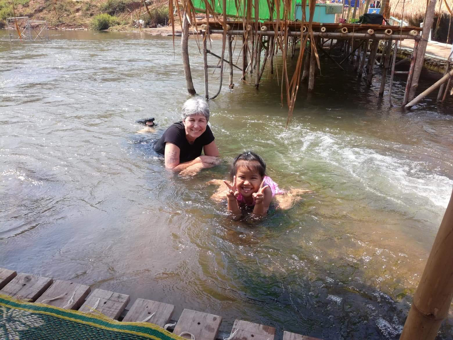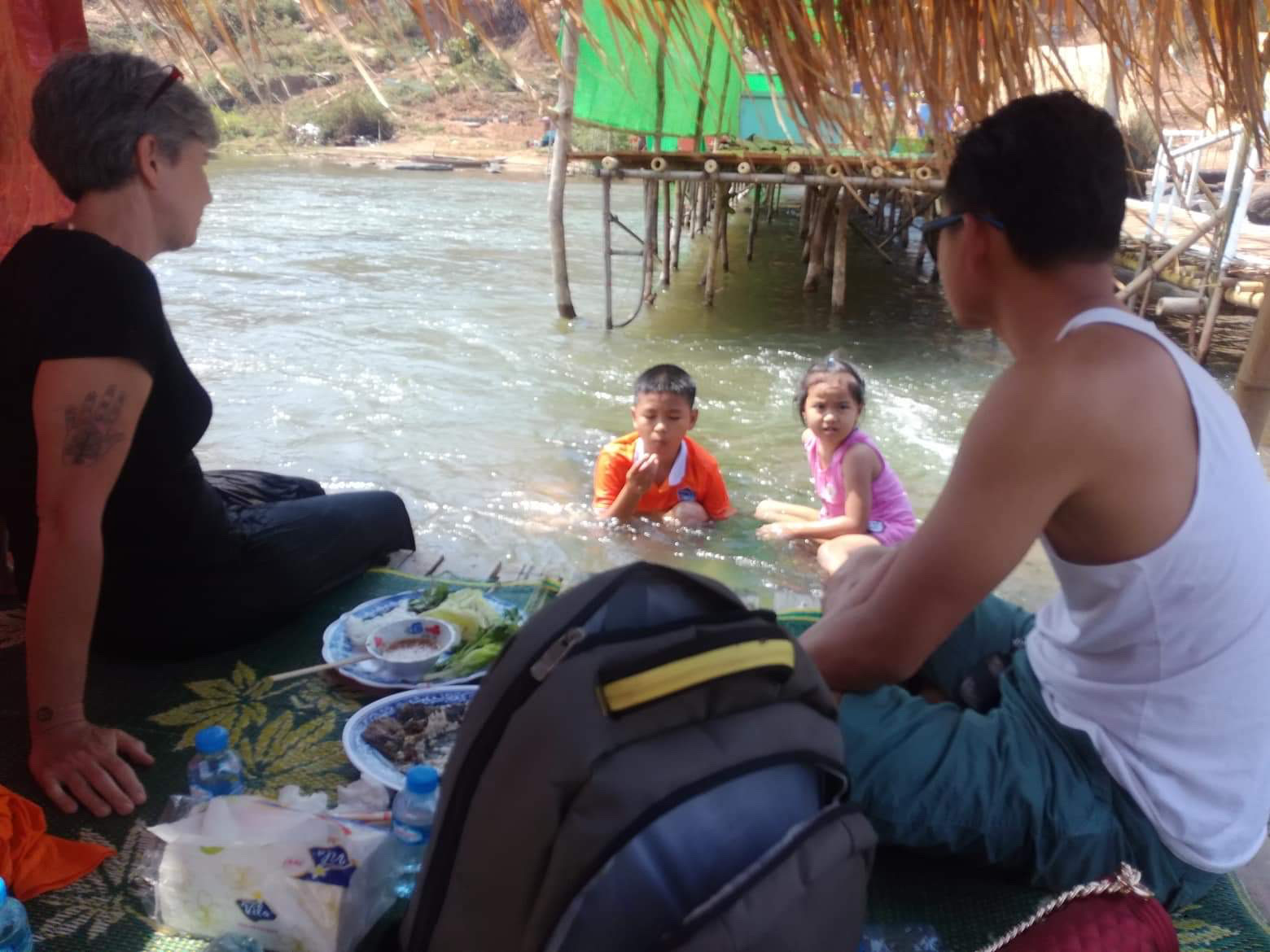 Personne ne semble vouloir aller dans l’eau…du coup, je me demande s’ils ne sont pas venus là que parce que je leur ai dit que j’aimais me baigner…mais heureusement Ngyod demande finalement à y aller. Je sens que Phonesavanh n’est pas à l’aise avec l’eau, elle a beau m’avoir répondu par l’affirmative quand je lui ai demandée si elle savait nager, j’ai un doute 😉. En fait, il s’avère qu’elle est terrorisée par tout ce qui pourrait arriver à ses enfants (noyade, renversé par une moto/voiture, chute sur les bords du Mékong…), c’est bizarre comme on a des points communs ( d’ailleurs, j’espère que mes enfants n’ont pas trop réalisés que j’étais comme ça 😇😇, je crois qu’ils s’en sortent bien parce que leur père était beaucoup moins flippé, ce qui est le cas dans cette famille aussi 😉). Sans compter qu’elle ne veut pas monter dans une pirogue, bien qu’elle ait fait une exception pour moi l’année dernière mais parce qu’on était sans les enfants je pense !