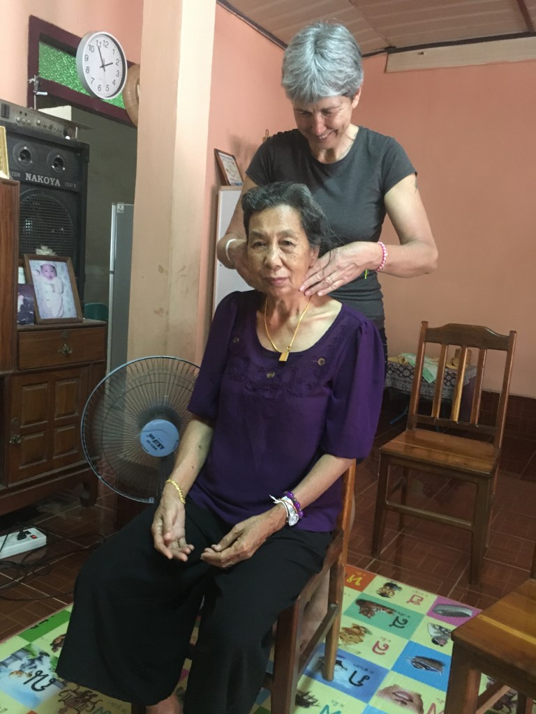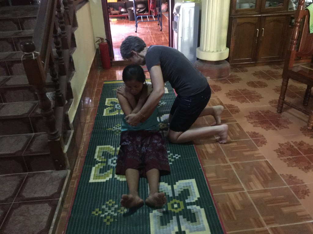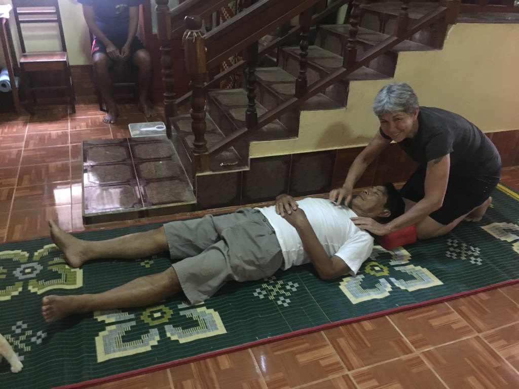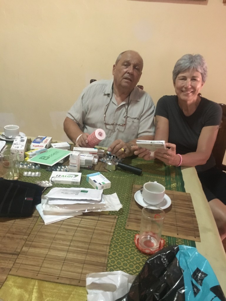 Après ce délicieux repas, je donne les médicaments et orthèses que j’avais amenés à Claude et mes premiers patients arrivent. J’avais oublié que Nilavanh me met à contribution aussi rapidement, mais j’adore ça ! Je soigne son frère, un jeune qu’ils aident et leur employée de maison.