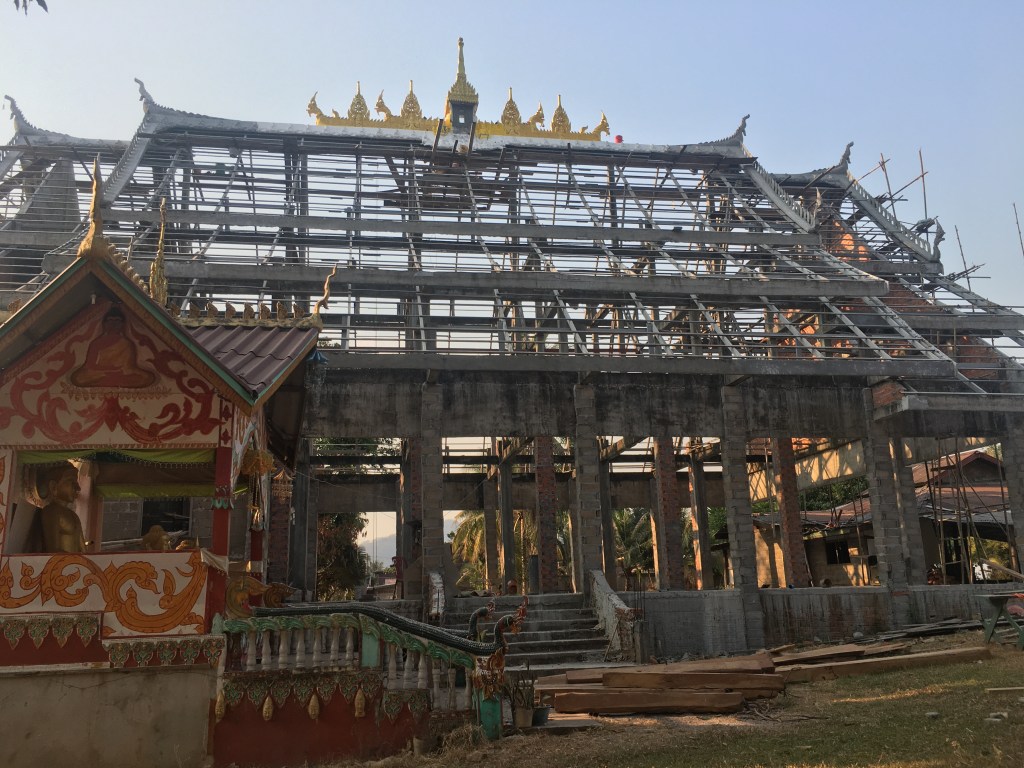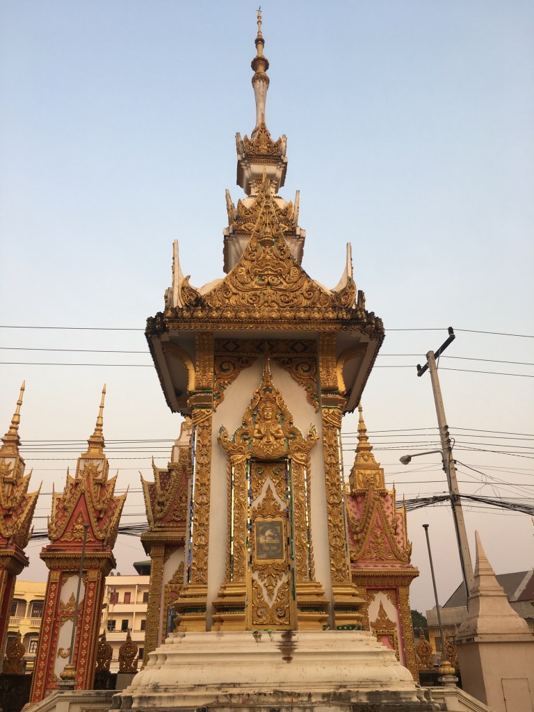 Puisqu’on termine tôt cette première journée de mise en jambe, on en profite pour visiter un peu Paksé en rentrant : le vieux temple chinois qui aurait besoin d’un bon coup de peinture et la pagode familiale de Sina qui elle est fraichement repeinte puisque le bras du Mékong qui la longe a débordé en septembre et a envahi le site.