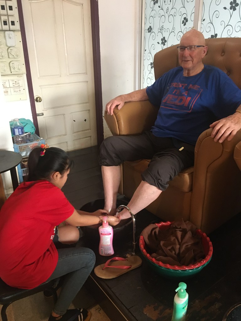 Lavage de pieds obligatoire avant un massage.Petit mojito à l’ananas à la terrasse de l’hôtel Paksé, même si la vue est plus jolie de jour, pour fêter les retrouvailles avant d’aller dîner avec Jean-Philippe.