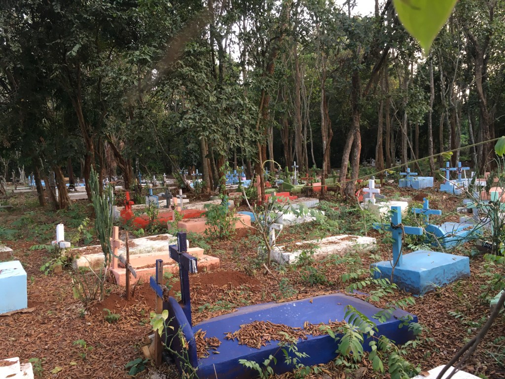 Dans le fond du jardin, les tombes des catholiques de la région, il paraît qu’il y a eu quelques martyrs tombés en 1975.Avec soeur Marie-Edouard.