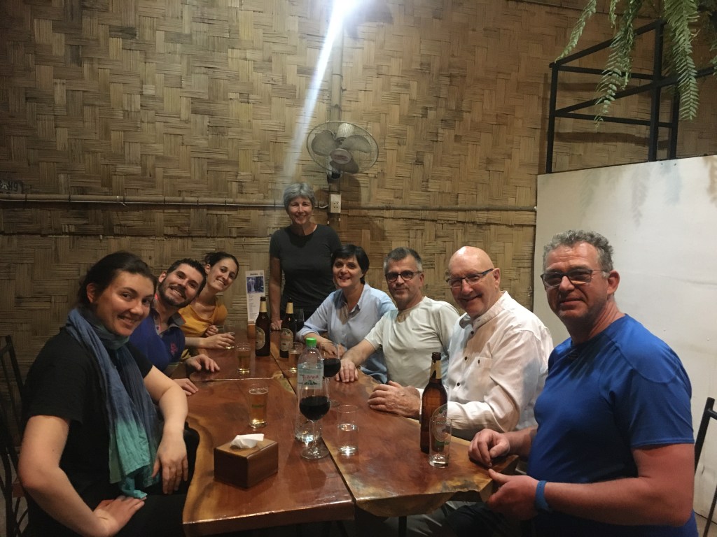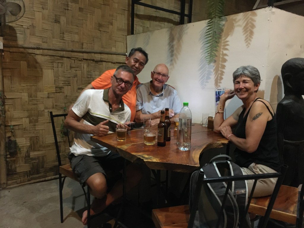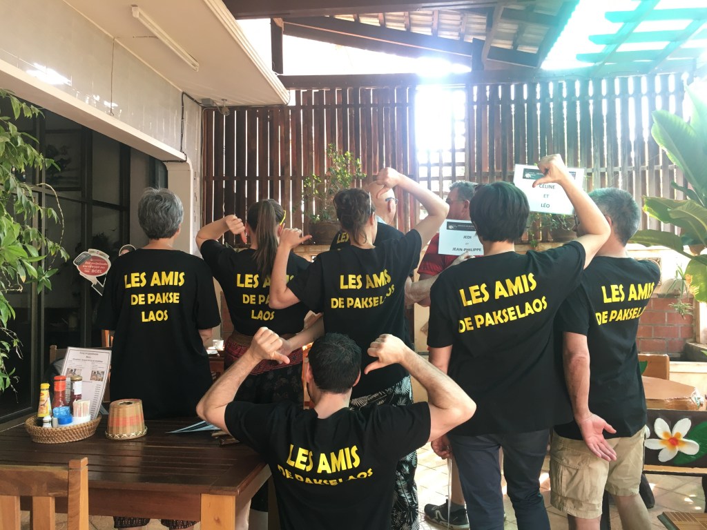 De retour à Paksé, + ou – 45 minutes, dans un minivan antique, de nuit, après avoir évité des dizaines de : camions thaï, vaches, chiens, motocyclistes sans phares (dont un étalé sur la chaussée 😱), après une bonne douche pour tous moi y compris, la journée finit comme dans « Astérix et Obélix », un bon gueuleton, autour d’une table, dans une ambiance chaleureuse :