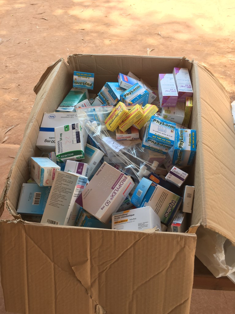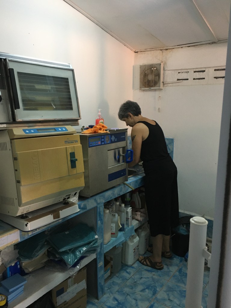 Aujourd’hui, grosse opération nettoyage du cabinet dentaire, installation des salles pour les chiros, tri des médicaments, récupération des tables et des orthèses arrivées l’année dernière par container. Nous partons à Don Talat avec le neveu de Williams, son mini-van est peu confortable, les amortisseurs auraient bien besoin d’être changés, et encore, la route s’est bien améliorée depuis l’année dernière, mais nous sommes quand même pas mal secouées 😬. Arrivés sur le site, on voit qu’ils ont déjà fait le ménage à l’extérieur 😃. Les « sisters » sont déjà sur place, elles viennent voir officiellement si on a besoin de rien, officieusement voir si on ne leur refourgue pas de vieux médocs….