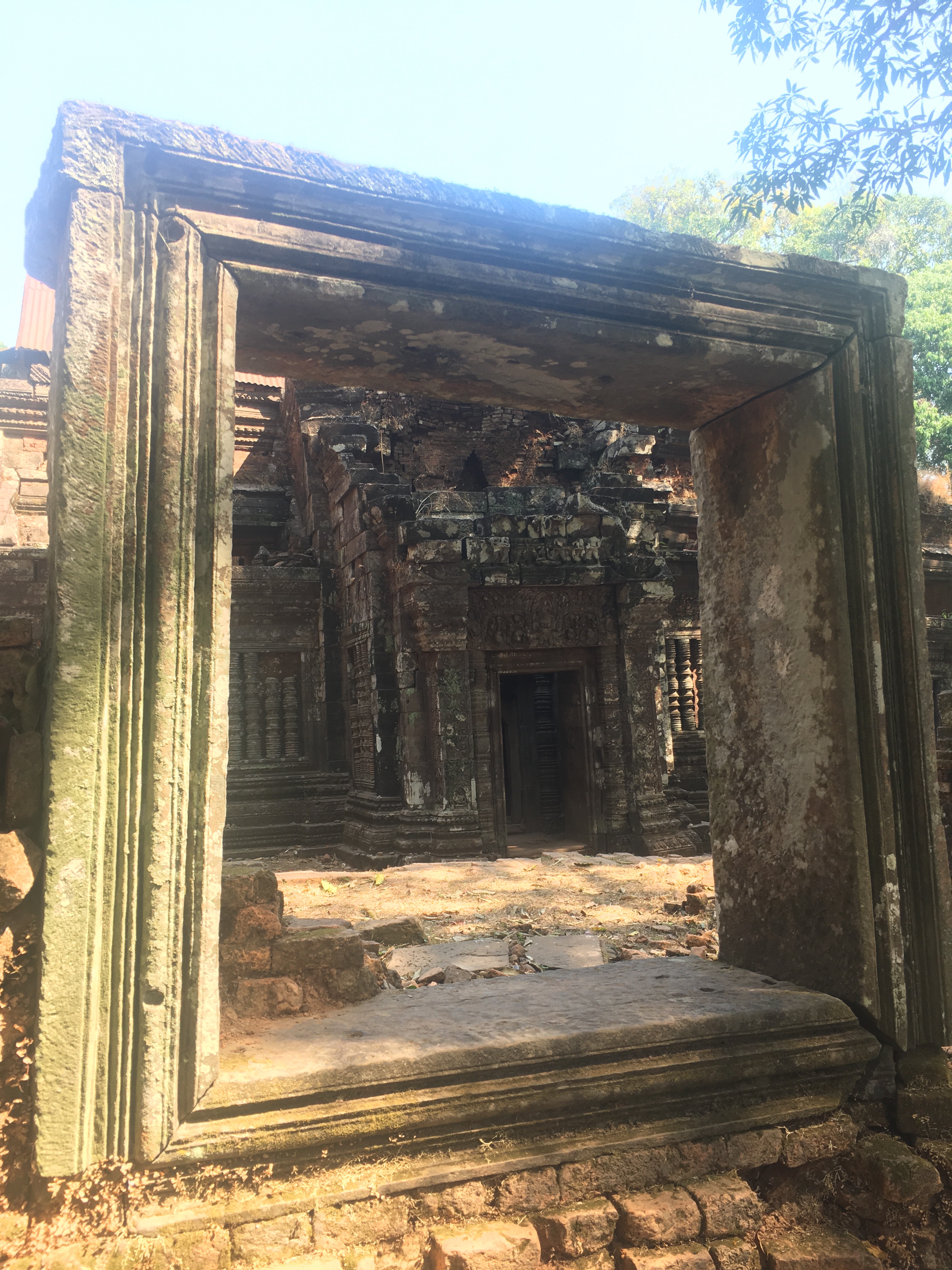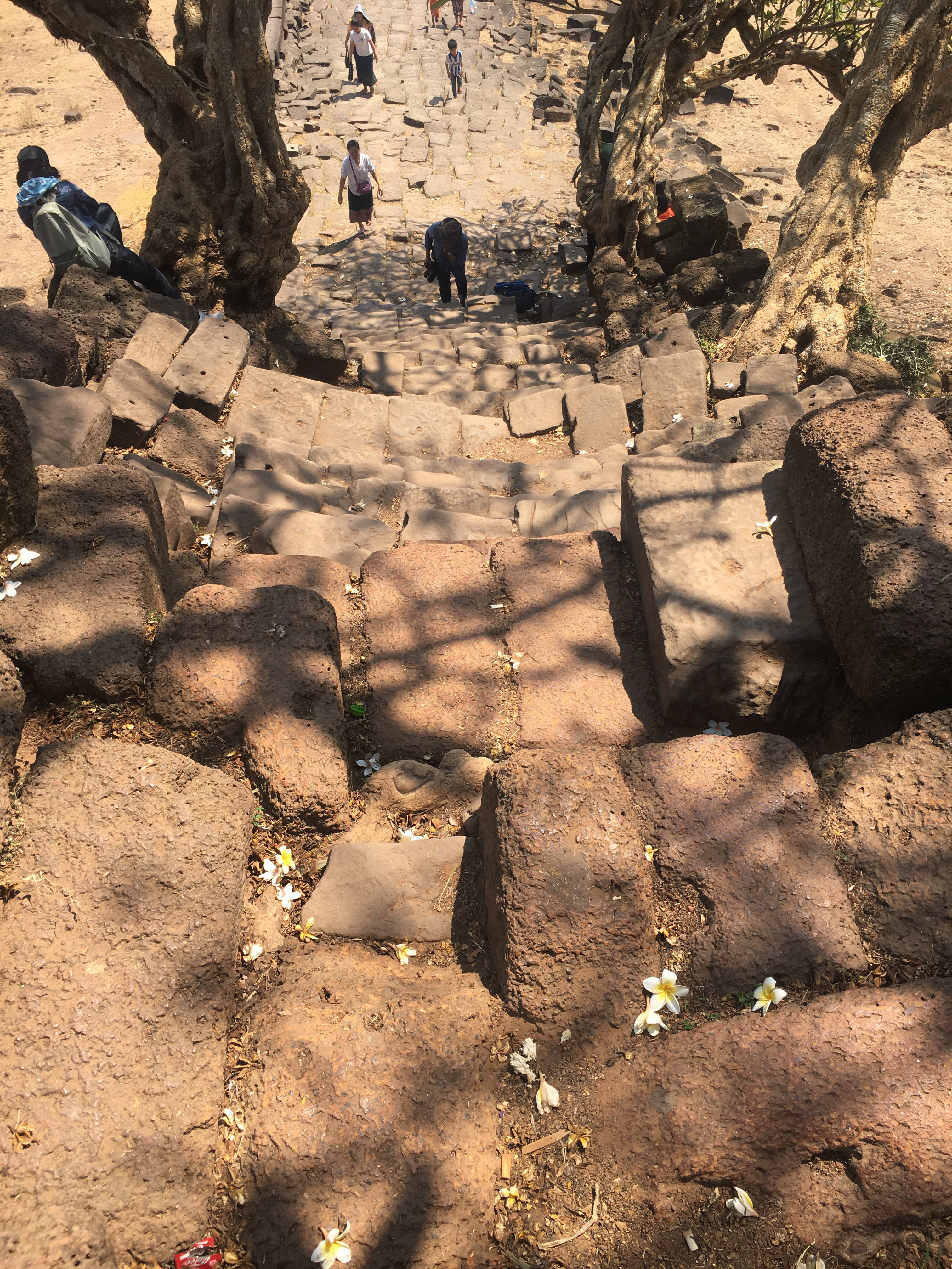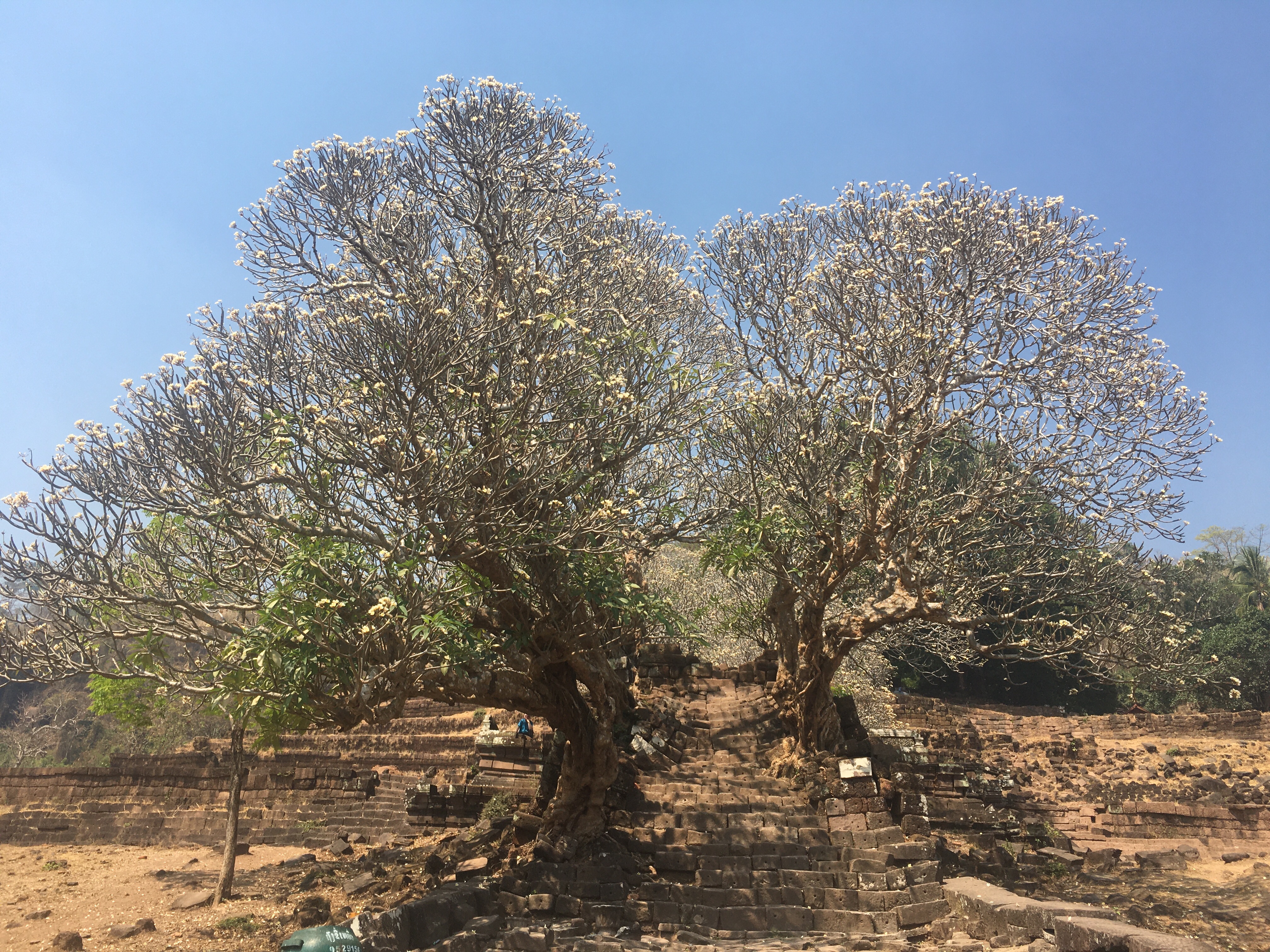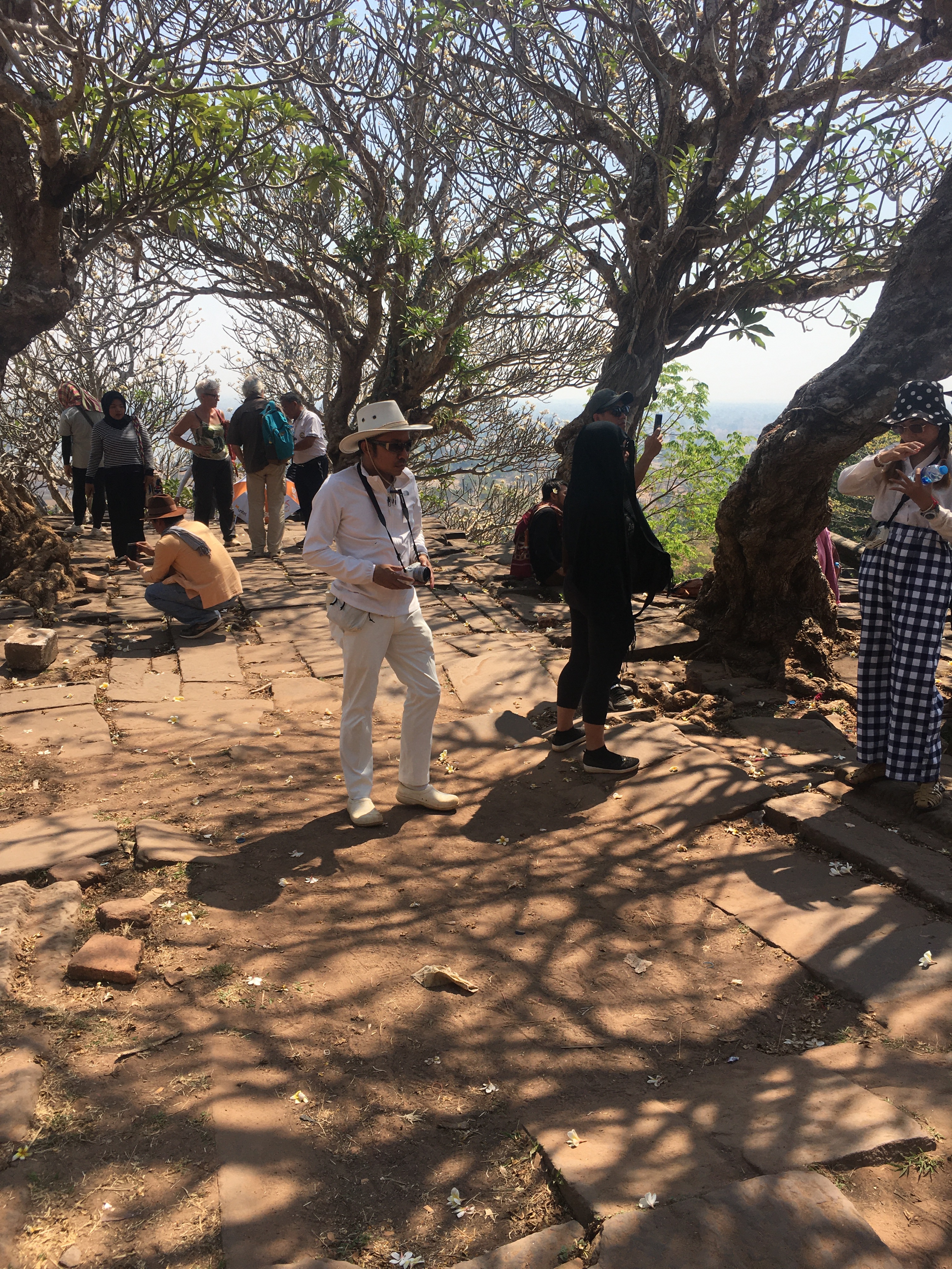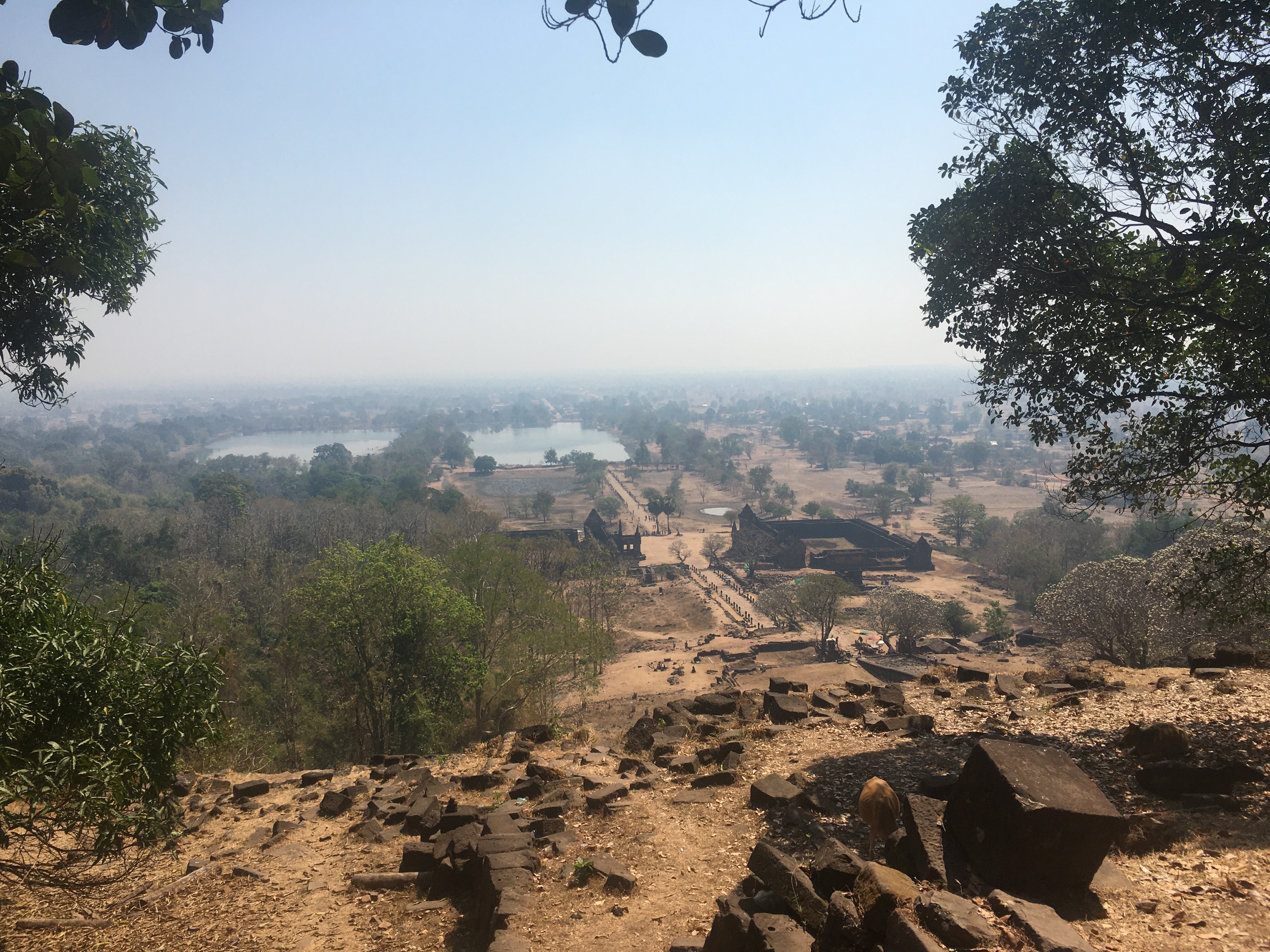Ce matin, Sina passe nous chercher, Laurent, Jean-Philippe, papa et moi, de bonne heure, pour nous emmener visiter Vat Phou, un temple dont les différentes constructions datent pour les plus vieilles du 5ème siècle et pour les plus récent du 15ème. Ce n’est pas aussi grand que les temples d’Ankor du Cambodge voisin mais c’est quand même un site imposant. Je n’avais jamais eu l’occasion de le faire en entier, la première année, j’en avais fait la moitié, en béquilles, et l’année dernière, on y est allé avec Paul (cf le blog de l’année dernière) et il y avait tellement de monde, puisque c’était la fête des lumières, qu’on n’était pas allé jusqu’en haut, d’autant plus qu’il faisait nuit et que c’était réservé aux bonzes. Alors cette année, je suis contente de découvrir la suite de la visite, notamment la vue incroyable sur le site tout entier.