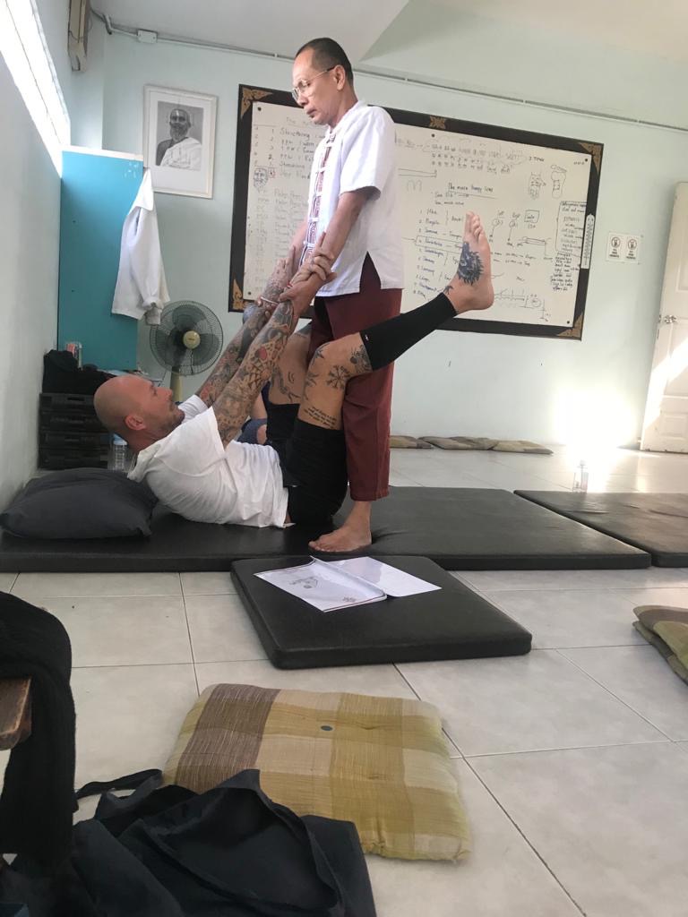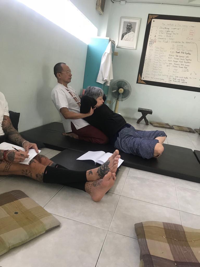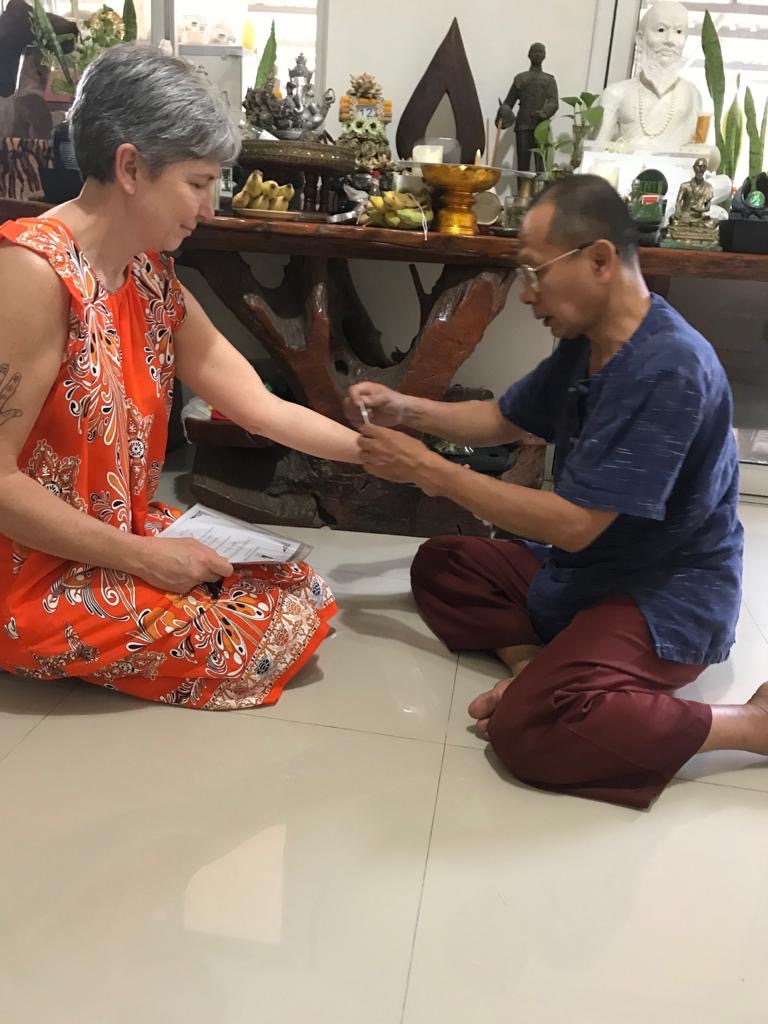 PP me donne un bracelet de fil de coton blanc qu’il m’accroche en faisant une petite prièreIl pose ensuite sur mon front une mixture magique de son cru tout en me souhaitant bonne chance et plein d’autres chosesEt voilà, j’ai mon niveau 2, plus que 2 niveaux à faire 😜le groupe 😃
