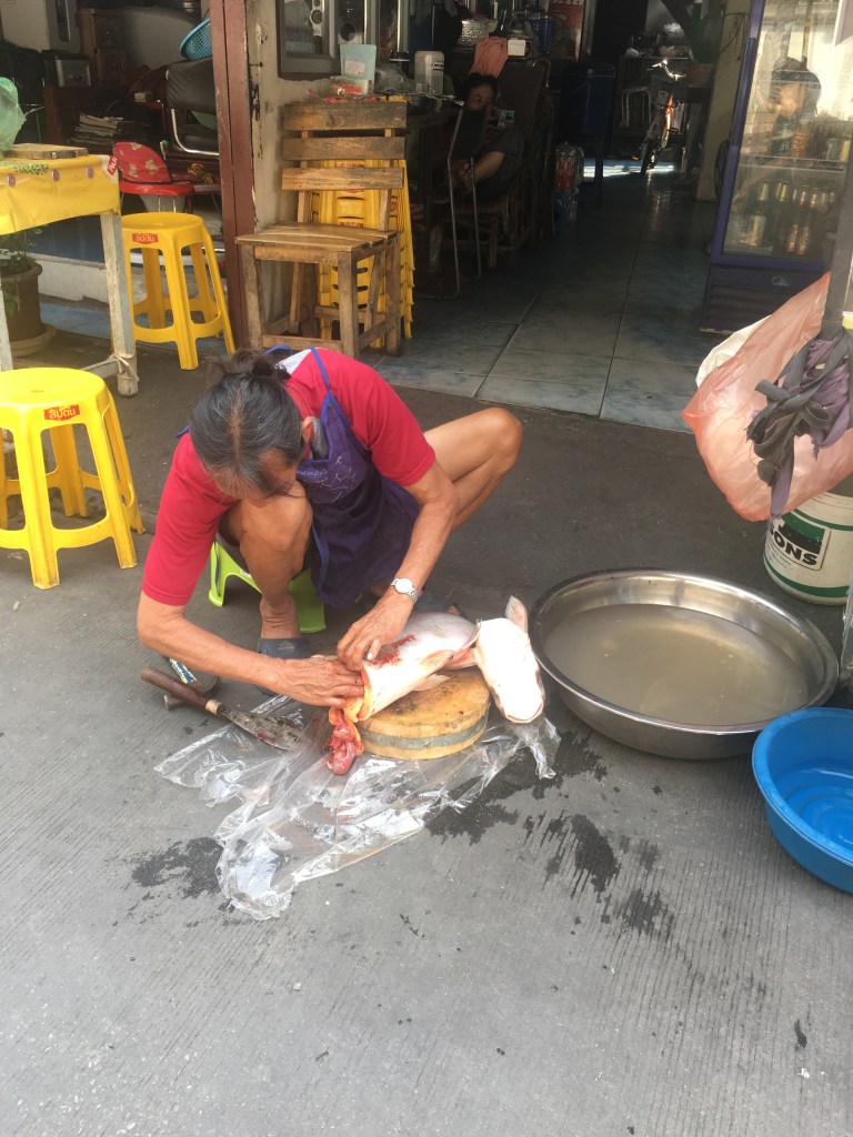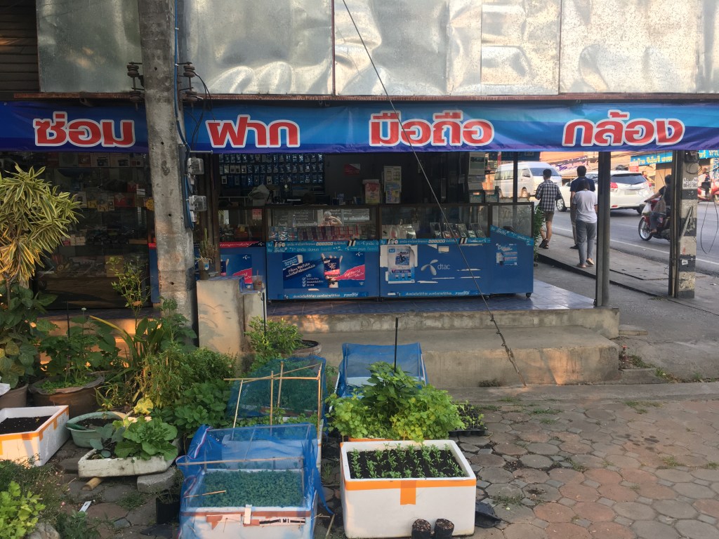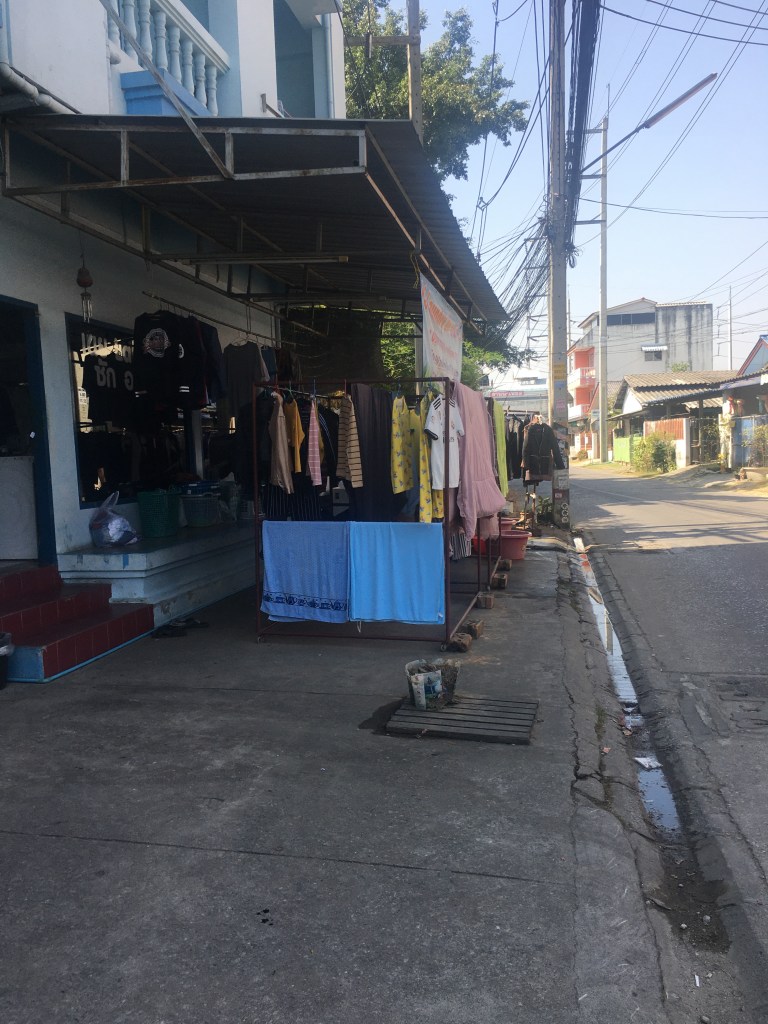 Ici, peu de gens ont une machine à laver chez eux. Il y a donc des lavomatiques ou des maisons particulières où la femme (je n’ai jamais vu d’homme le faire) fait les lessives, repasse et même recoud parfois, genre de pressing à domicile ouvert de 7h à 21h. Celle chez qui je vais est sur le chemin de l’école de massage. Quand je lui ai amené mon linge jeudi (et oui, j’ai amené de quoi tenir une semaine au moins 😜) nous avons papoté, elle parle un tout petit peu anglais. Quand je lui ai dit que je venais de Paris, elle était toute contente de m’expliquer, à ce que j’ai cru comprendre, que quelqu’un de sa famille (son mari ? son frère ?) est allé là-bas pour un championnat de boxe Muay Thaï et que c’était un grand honneur. Au moins elle savait où était la France, elle Ce n’est pas comme ce chauffeur de taxi que j’ai eu à l’aéroport en arivant à Chiang Maï, qui, après que je lui ais répondu à la traditionnelle question « where are you from » : Paris, France, m’a dit « Oh, where ?? It’s in America ? » 😭😭. Bref revenons à mes lingères, voici quelques photos pour illustrer.