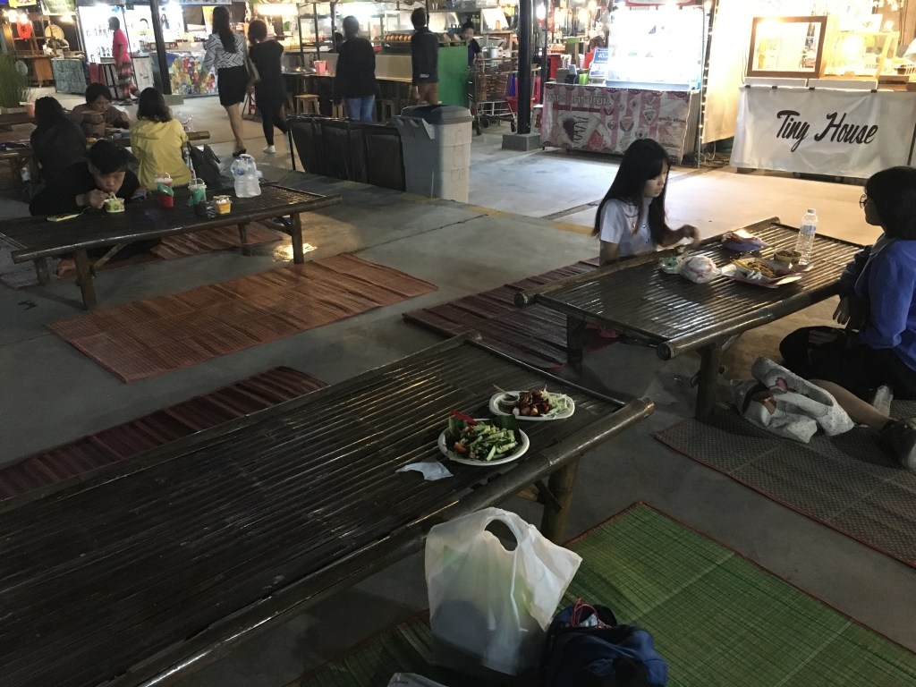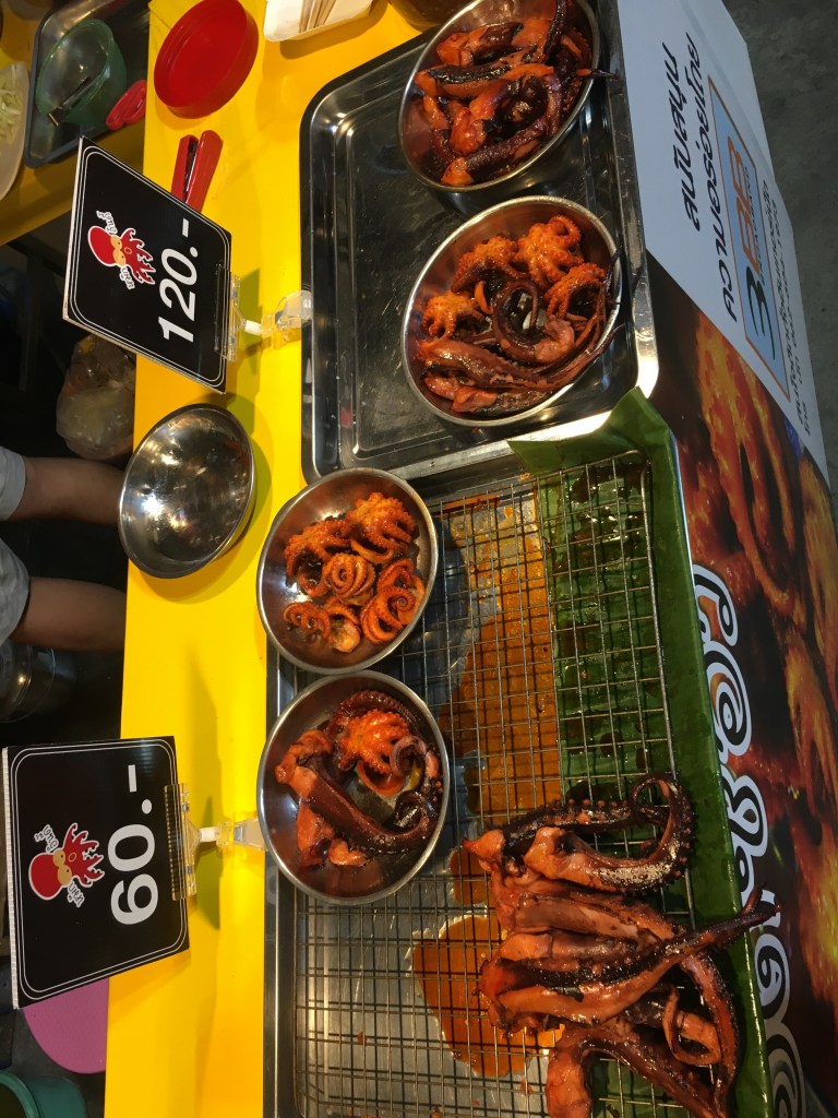 60 Bath c’est environ 1,76€ma salade de concombre commandée « non épicée » mais qui arrache quand même 🥵 et les tentacules de calamars de la photos du dessus revenus au wok, mais ce n’était pas très bon alors je n’en ai mangé que la moitié ☹️ce ne sont que des stands de nourriture salée ou sucrée et de boissons en tous genreslà, c’est ma place, on reconnait mon sac de soldes 😜