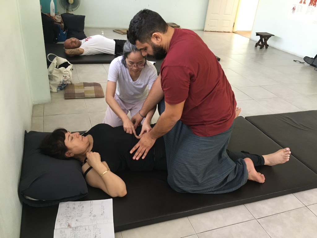 Bon, reprenons à hier, on a bien bossé. J’ai de bonnes courbatures à force de passer autant de temps accroupie ou à genoux, je n’ai pas l’habitude de travailler autant avec le bas du corps puisque le patient est allongé sur ma table, nous autres européens aimons bien notre petit confort 😜 A la pause de midi, je suis rentrée manger à l’hôtel et piquer une petite tête, trop besoin de voir un peu le soleil, de me rafraichir et de délasser mes cuisses et mes mollets. Une heure pour la pause déjeuner, c’est court, heureusement que l’hôtel est juste à côté.