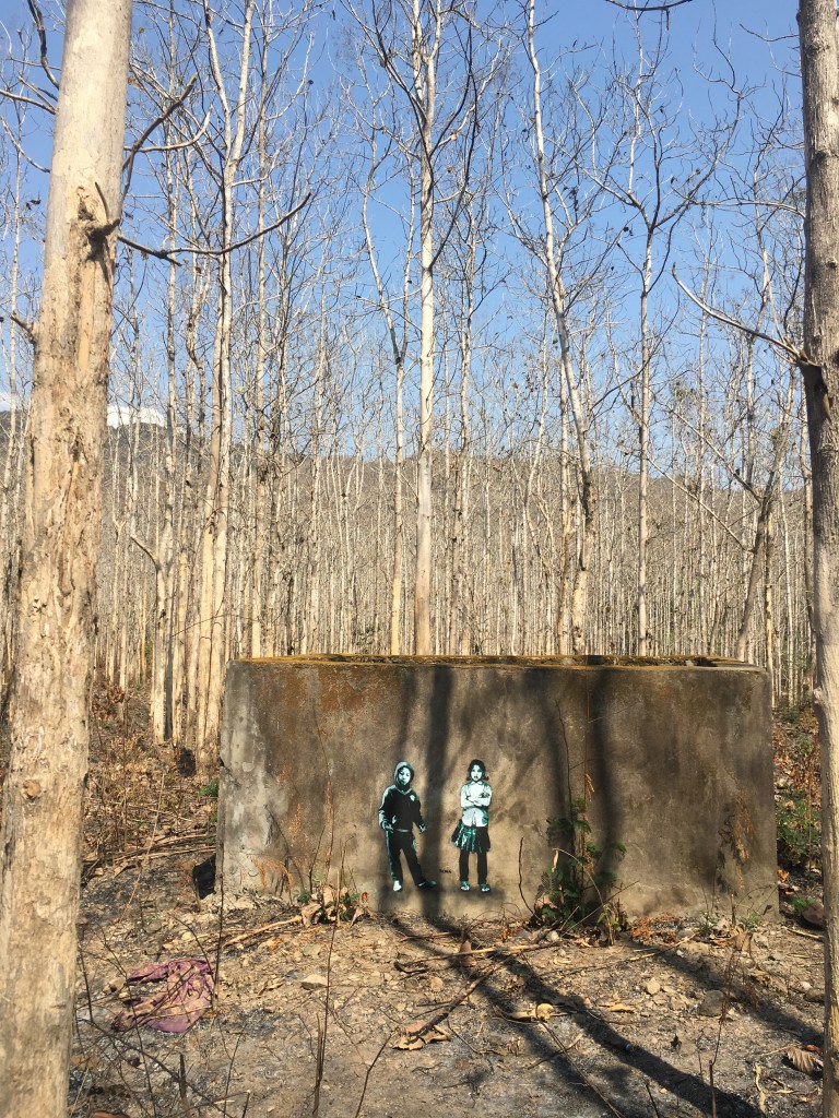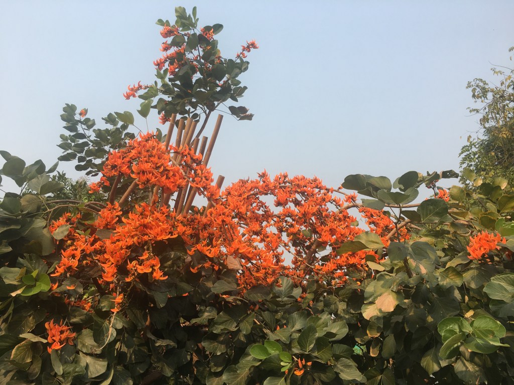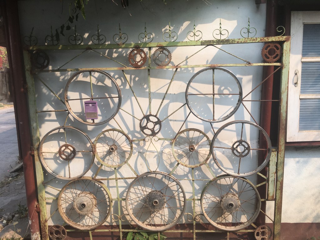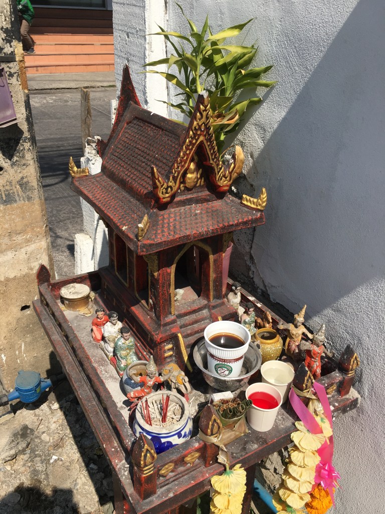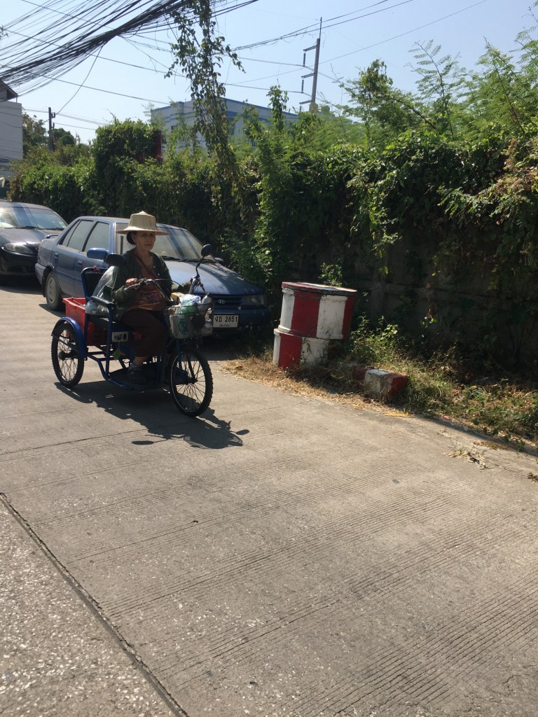 leurs efforts pour les piétons…un abat jour originalun portail pour les amoureux du véloun petit écrin de verdure dans la ville, très rare, trop rareil fallait bien que je vous en mette un 😉le sulfureux nouveau roi de Thaïlande, un régal pour les tabloïds mais pas du tout apprécié du peuple, mais chut, il ne faut pas le dire 🤭 il y a très peu de thaïs chez qui je sois rentrée qui ont changé le portrait, beaucoup ont gardé celui de l’ancien le CCAS mais uniquement pour les séniorsles rares arbustes avec des fleurs, c’est la saison sèche en ce momentj’aime la sérénité de cette photo et le contraste entre la modernité de l’antenne wifi dans le fond et l’ancien avec les barrières en bambou, les barques pour circulerc’est tout moi ça 😇