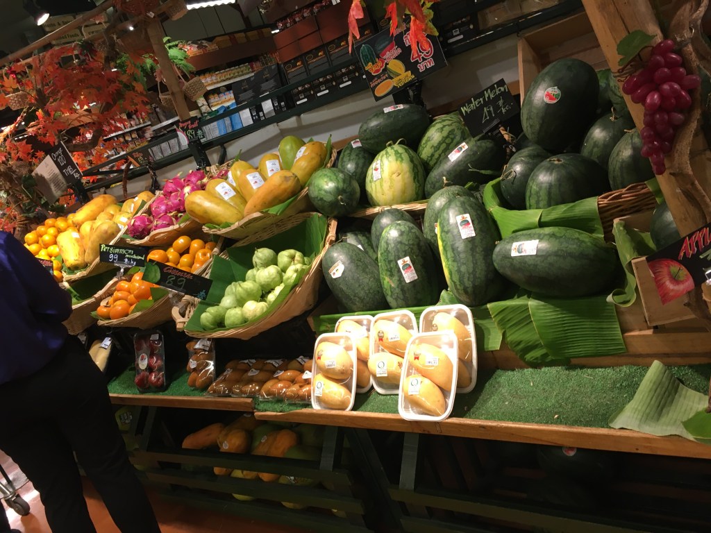 Et les rayons du supermarché sont très différents de ce que je vous ai montré dimanche. Il y avait même des fruits et des légumes qu’on trouve normalement ici, en provenance de Nouvelle Zélande ou d’autres pays proches…