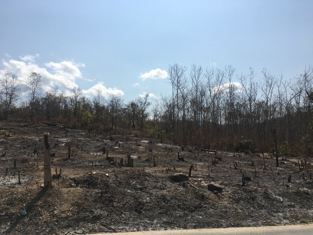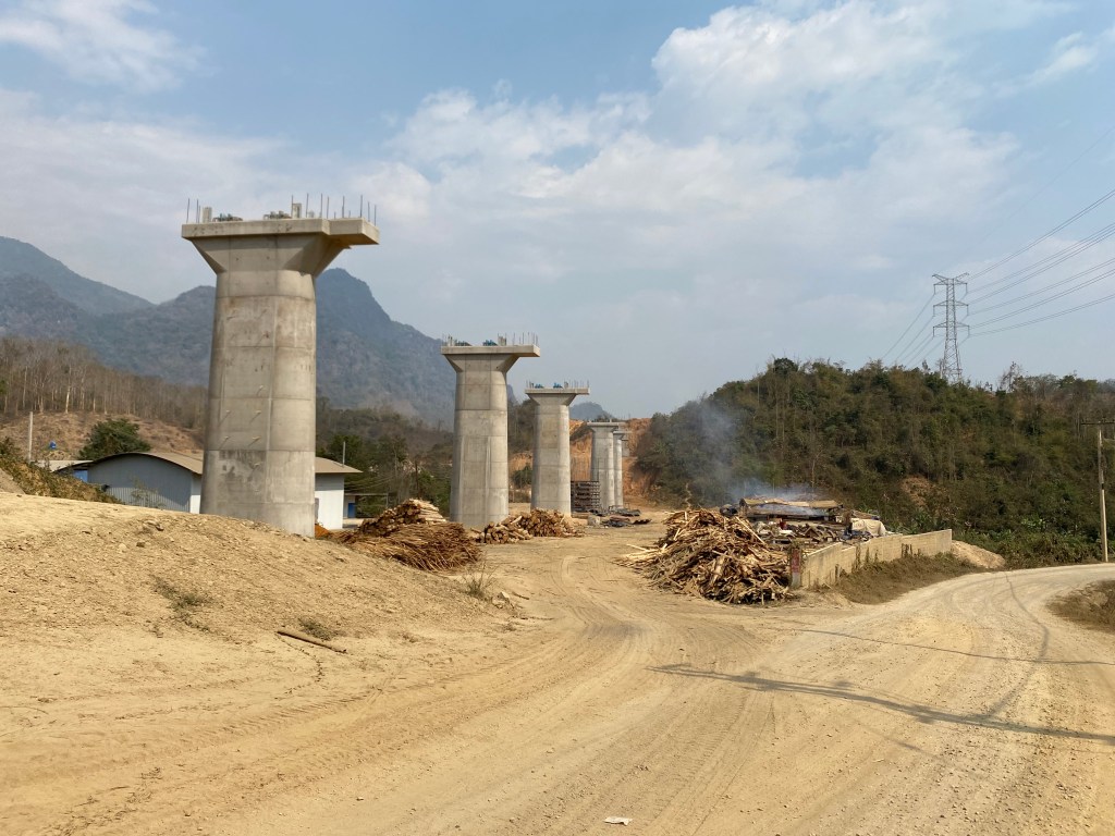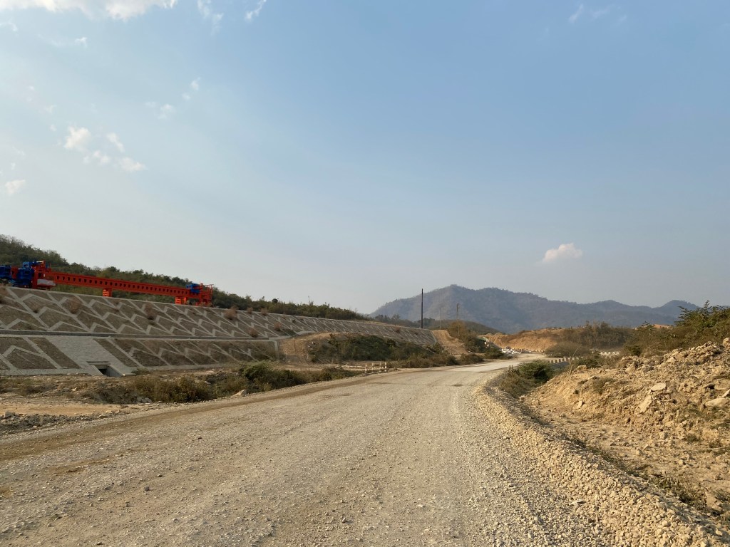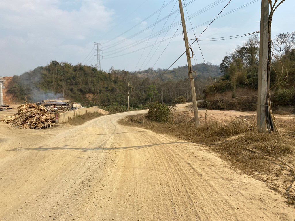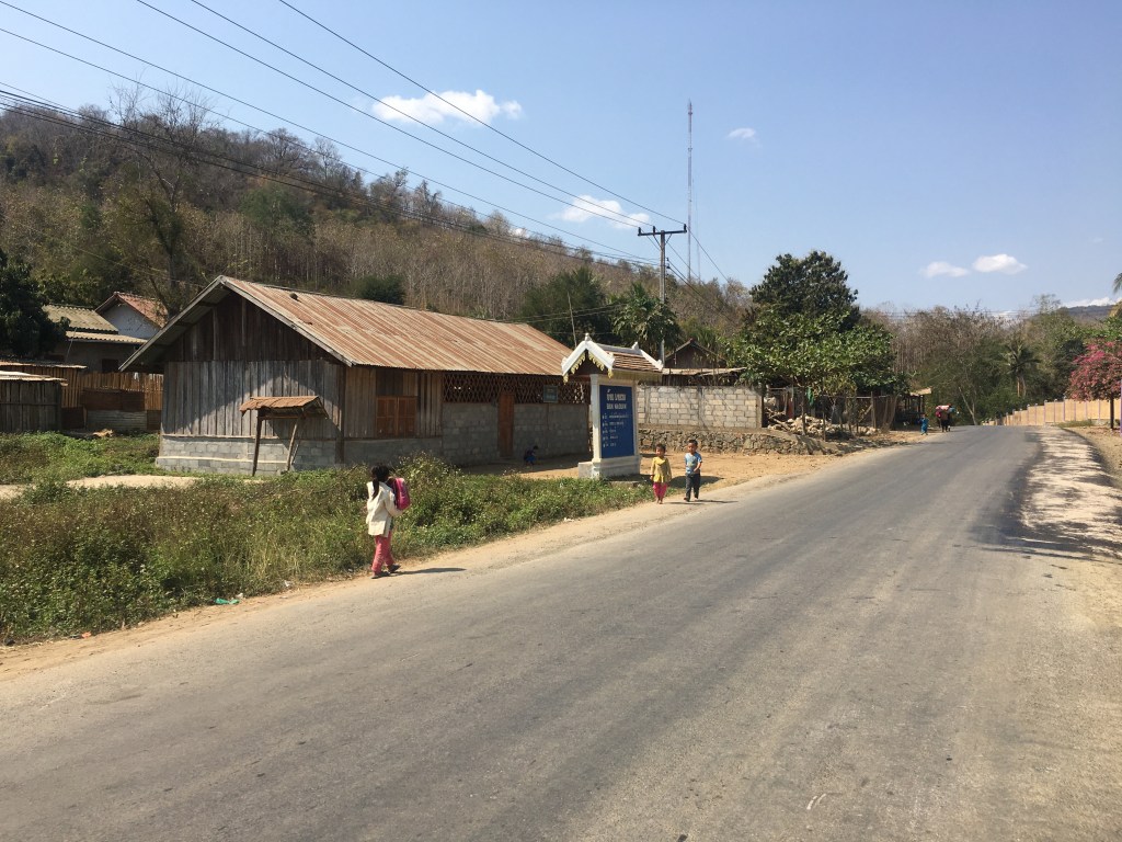 A la quatrième cascade, on abandonne et on décide de repartir voir autre chose dans la région. Donc, re-pirogue et moto. Sur la route, on assiste à la construction d’une autoroute sûrement financée par les chinois, les Laotiens n’ont pas les moyens de payer une telle structure. On imagine assez bien une continuité de leur autoroute, se finissant pour l’instant à Yinhe Toll Gate, dans le Yunnan, qui passerait par Luang Prabang et qui continuerait sur Ventiane, la capitale du Laos. En deux ans, c’est impressionnant le nombre de structures construites par et pour des chinois ici, usines, hôtels, restaurants, supermarchés, parc de loisirs… Après tout, rien de surprenant, la Chine est un pays énorme, communiste comme le Laos, qui lui est tout petit, 6,8 millions d’habitants, soit l’équivalent de la Bretagne et la Normandie réunies. J’ai lu qu’ils avaient signés dernièrement pleins de traités de coopération pour le futur dans pleins de domaines. J’ai constaté qu’ils amènent leur lot de mal-bouffe et comme ça ne coûte pas cher, et que c’est nouveau, les jeunes laotiens se tournent vers cette nourriture au détriment des fruits et légumes vendus par les petits agriculteurs des environs de chaque grande ville. Il y a encore de la marge, mais on m’a dit que certains commençaient à renoncer à se déplacer pour ne pas vendre à perte…Mais bon, c’est la vie ma pauv’e Lucette, ça a été comme ça chez nous il y a quelques décennies…