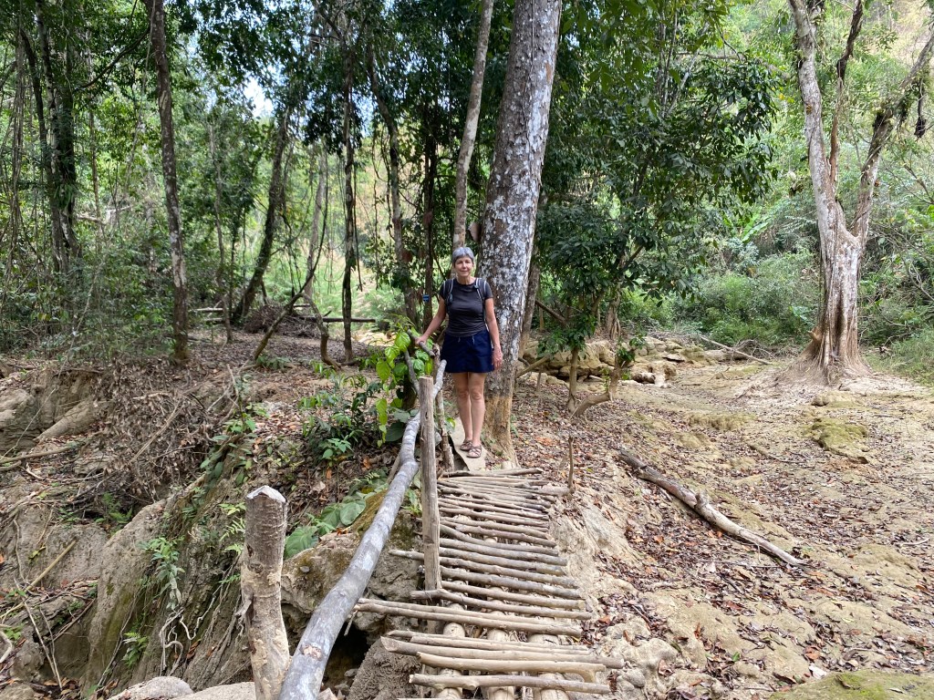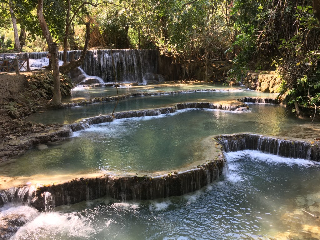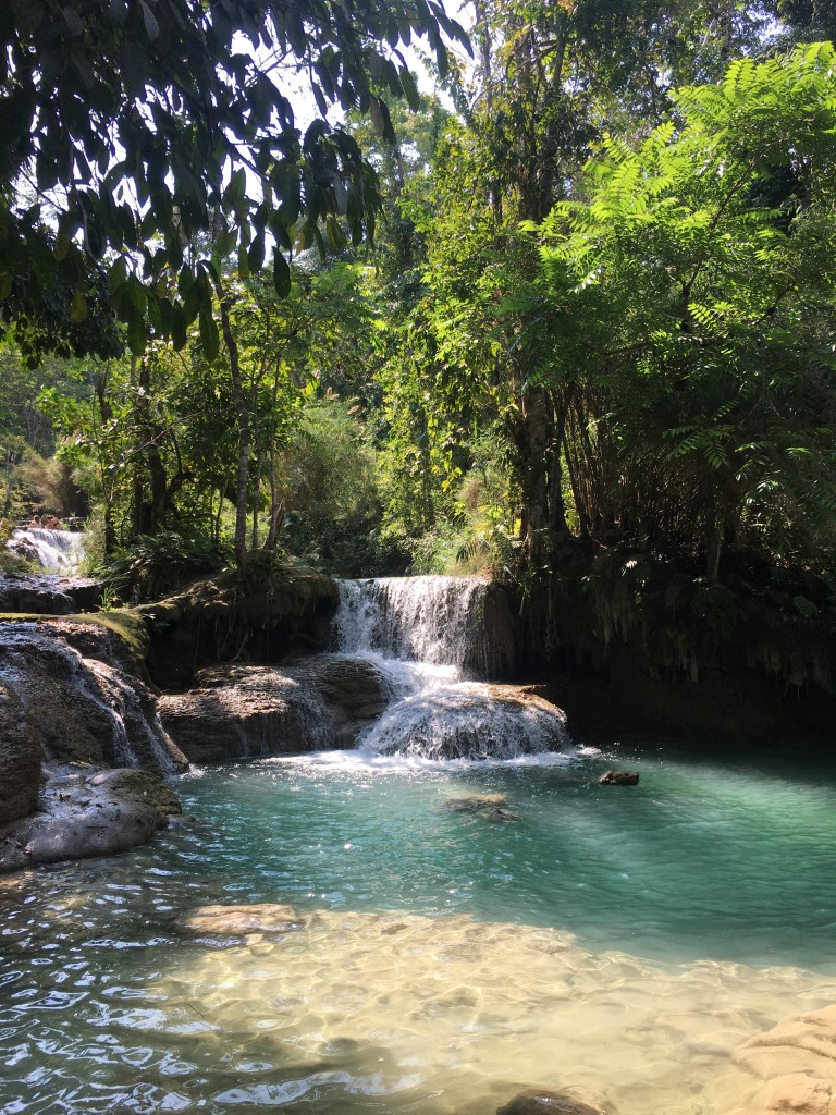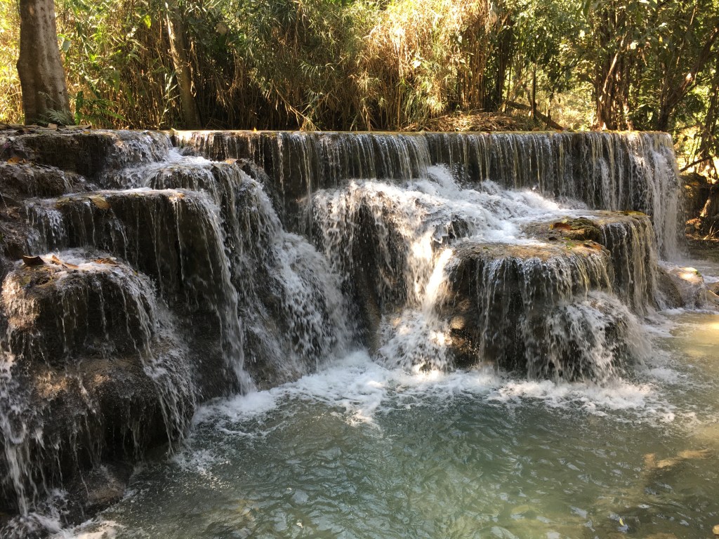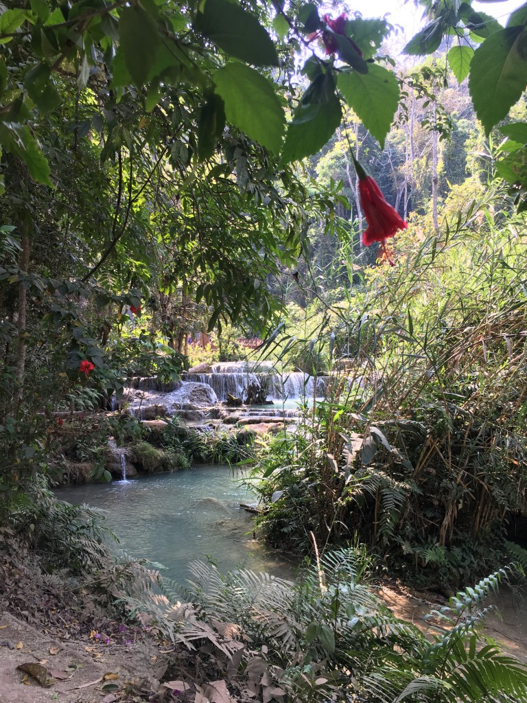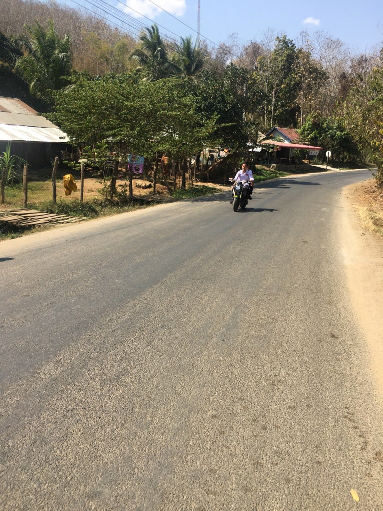 Aujourd’hui, direction « Tad Sae Waterfall », la « cascade de Sae » pour ceux qui ne parlent pas anglais (et « tad » voulant dire cascade en Lao, le titre est donc redondant 😉), située à une grosse demi-heure de moto de Luang Prabang, elle a la particularité de n’être accessible qu’en pirogue pour les deux derniers kilomètres. La route est relativement bonne au départ, et tant mieux parce que je ne suis pas du tout à l’aise avec quelqu’un à l’arrière de ma moto. De toutes façons, je déteste être conduite donc Laurent n’a pas d’autre choix que de supporter ma conduite peu fluide 😬.