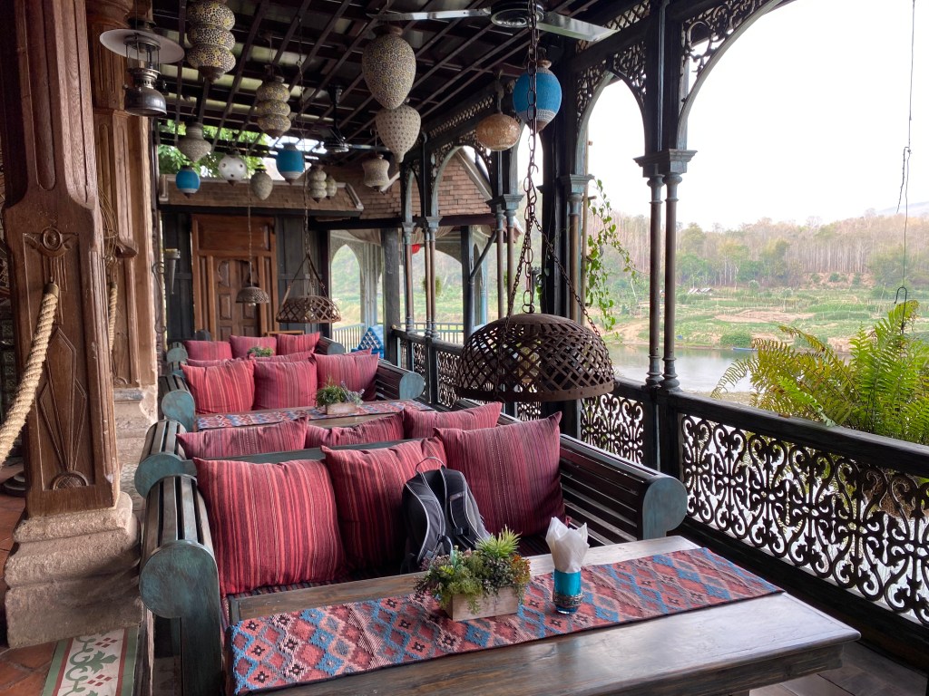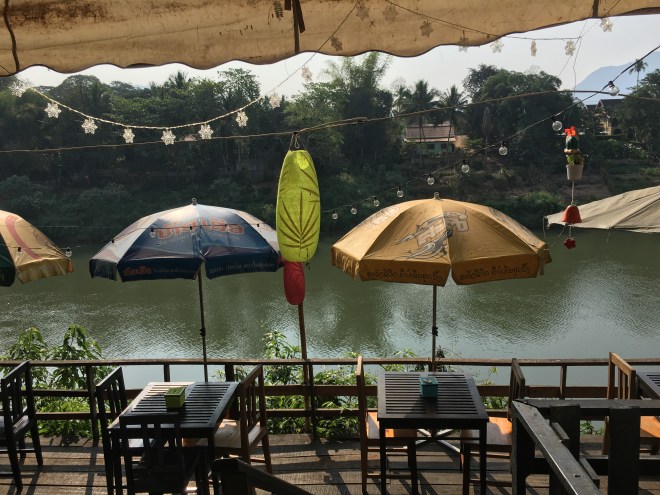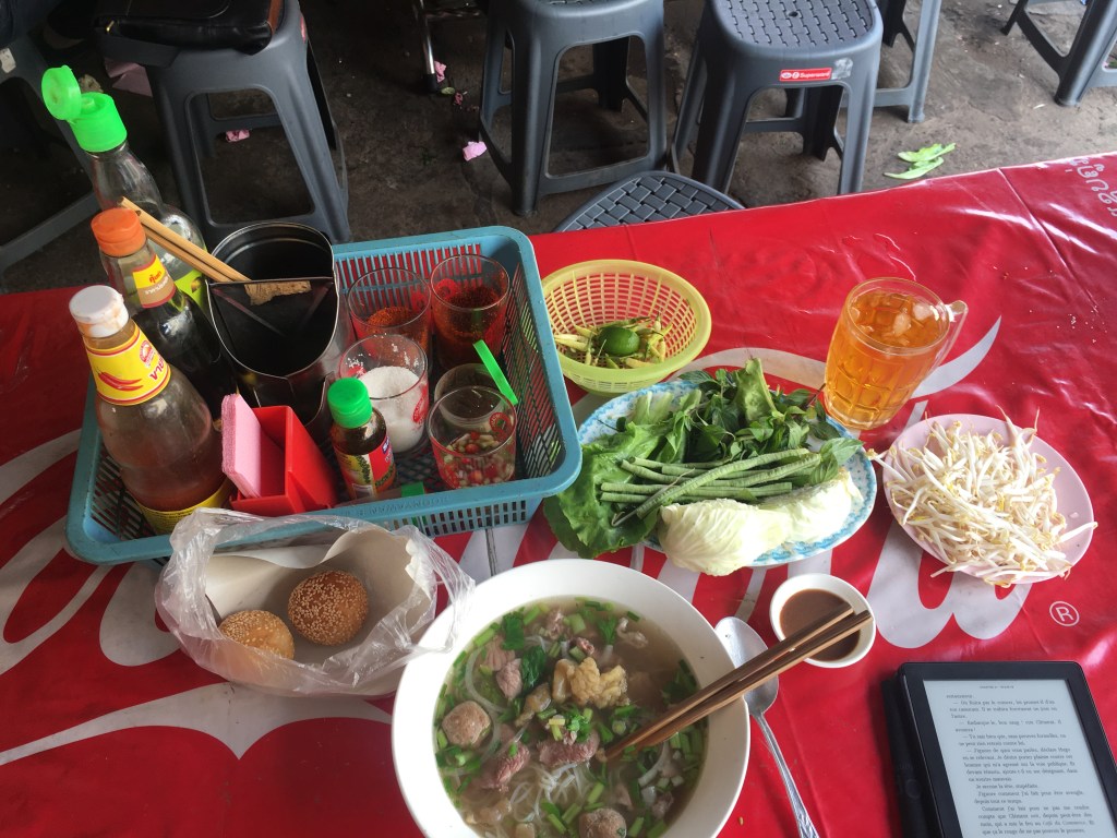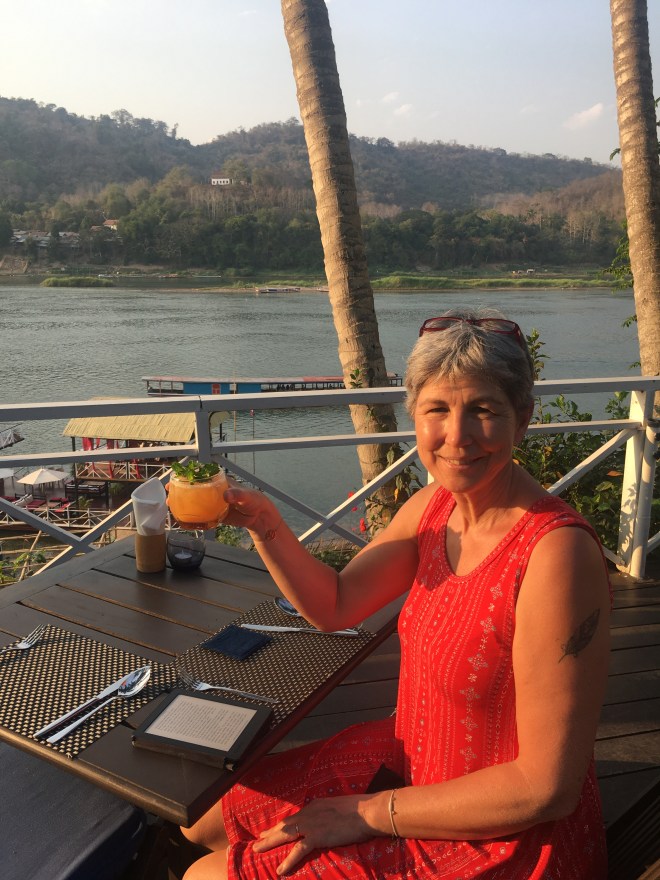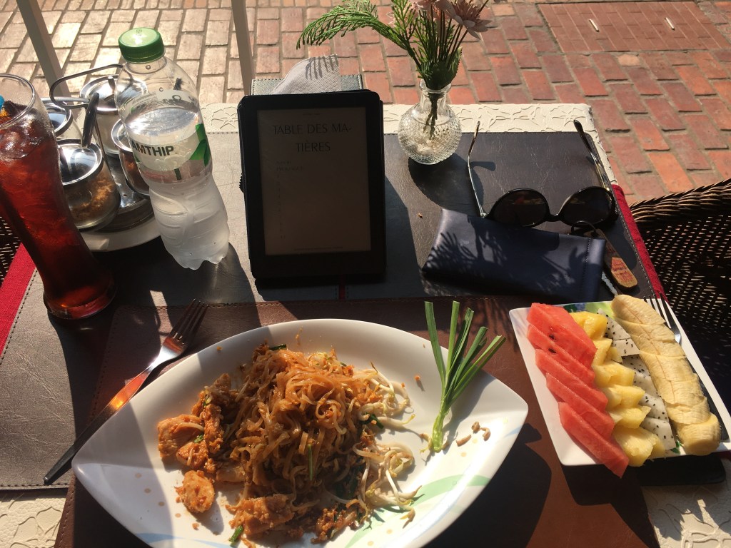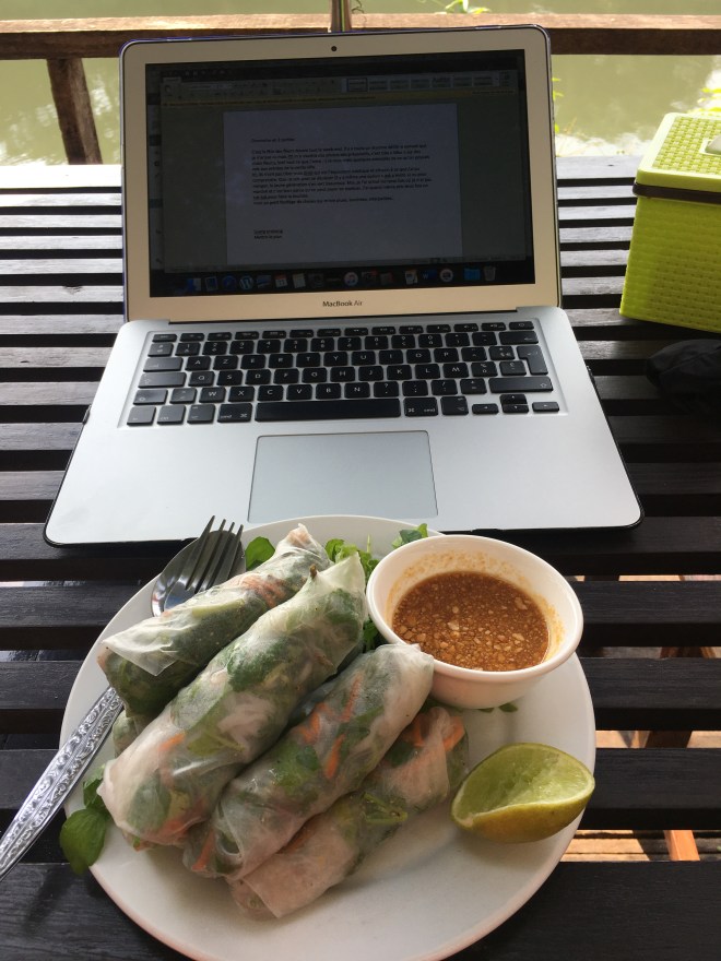 Donc démarrage de la journée en douceur, petit déjeuner de rouleaux de printemps et de fruits shake, face au Mekong, avec mon ordi pour avancer un peu le blog, moment paisible.