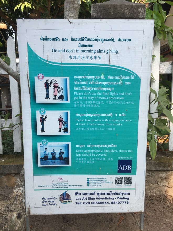 J’ai eu la flemme de me lever tôt (il faut y être à 6h30 !) pour voir la fameuse offrande aux moines dont les photos sont sur toutes les pubs pour Luang Prabang. J’avais déjà fait ça avec Paul à Champassak l’année dernière et en plus, on avait fait partie des gens qui faisaient les offrandes aux moines, c’était encore mieux que de regarder 😃. Ici, apparemment les gens ne sont pas très respectueux de cette cérémonie, voici ce qu’on trouve affiché un peu partout sur les murs des temples :