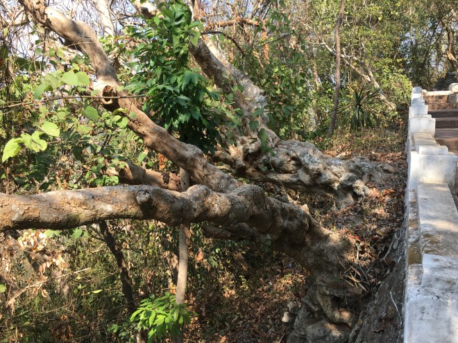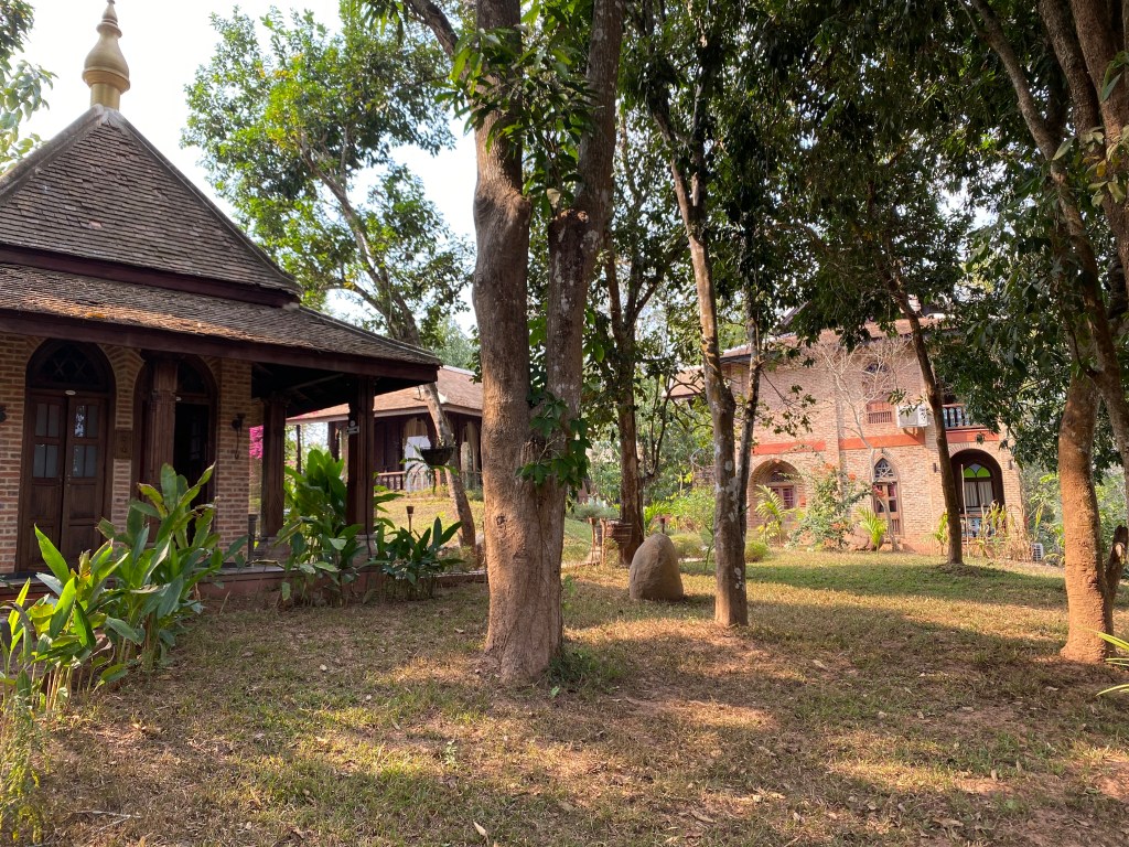 On a bien trouvé un panneau indiquant le début du Trail mais aucune piste qui démarre de là….on décide de remonter sur la moto et de regarder un peu plus loin. On finit par tomber sur un lieu étrange et paisible, « Le Palais Asiatique », on s’est posé là un moment pour déguster un fruits shake. Puis retour sur Luang Prabang avant la tombée de la nuit.