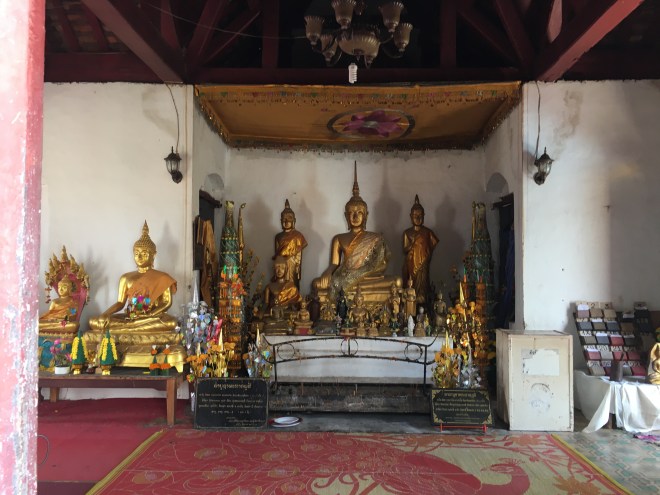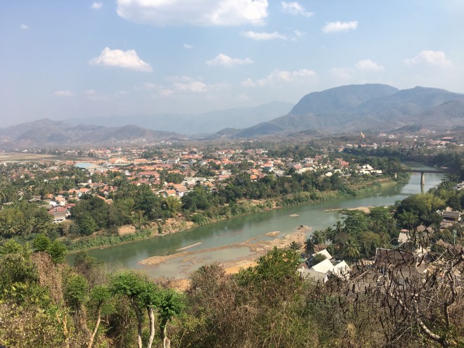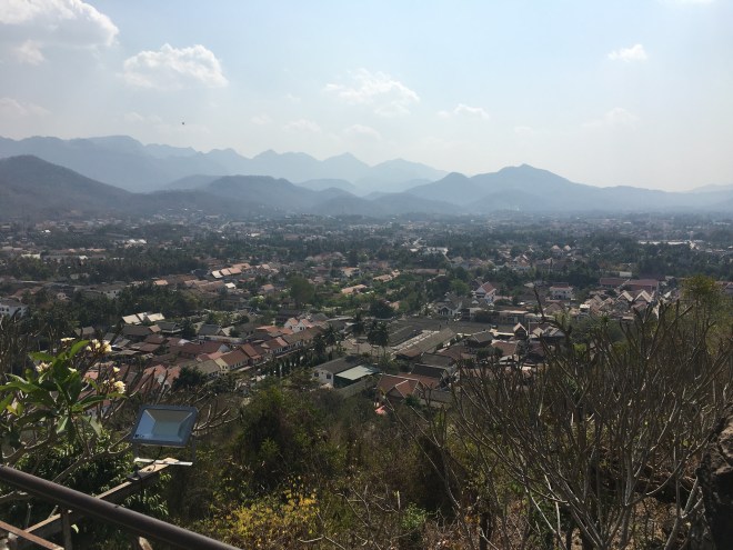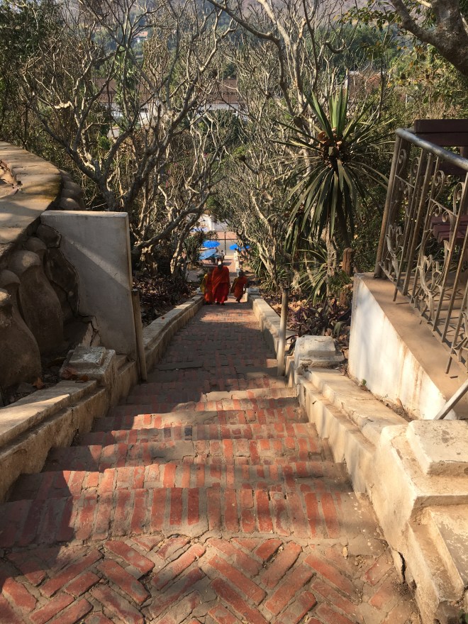 Je décide de continuer mes visites à contre-courant des touristes, du coup, à cette heure, il n’y a pas grand-monde dans la vieille ville. J’en profite pour grimper la « Phou Si mountain », en réalité un tout petit mont. Après 300 marches environ, on accède à un autel. La vue sur la ville est jolie, pas aussi extraordinaire qu’ils le laissent penser dans les guides mais sympa quand même. Il parait qu’il faut venir voir d’ici le lever ou le coucher du soleil sur le Mekong, mais à priori, c’est blindé de monde et l’idée de monter tout doucement en procession, à la queue leu leu, très peu pour moi 😉. Au départ des marches, il y a les éternelles vendeuses de grigris pour Bouddha mais aussi, et, c’est la première fois que je vois ça, une dame qui vend de tous petits oiseaux, par paires, en cage. Quand je lui en demande la raison, elle m’explique que ça porte chance, bonheur, longue vie et richesse (entre autres, rien que ça!) quand on les laisse s’envoler de là-haut. Je me dis que je peux bien risquer 3 € pour l’expérience, et me voilà partie à l’assaut du mont avec mes petits moineaux en cage pour me tenir compagnie…