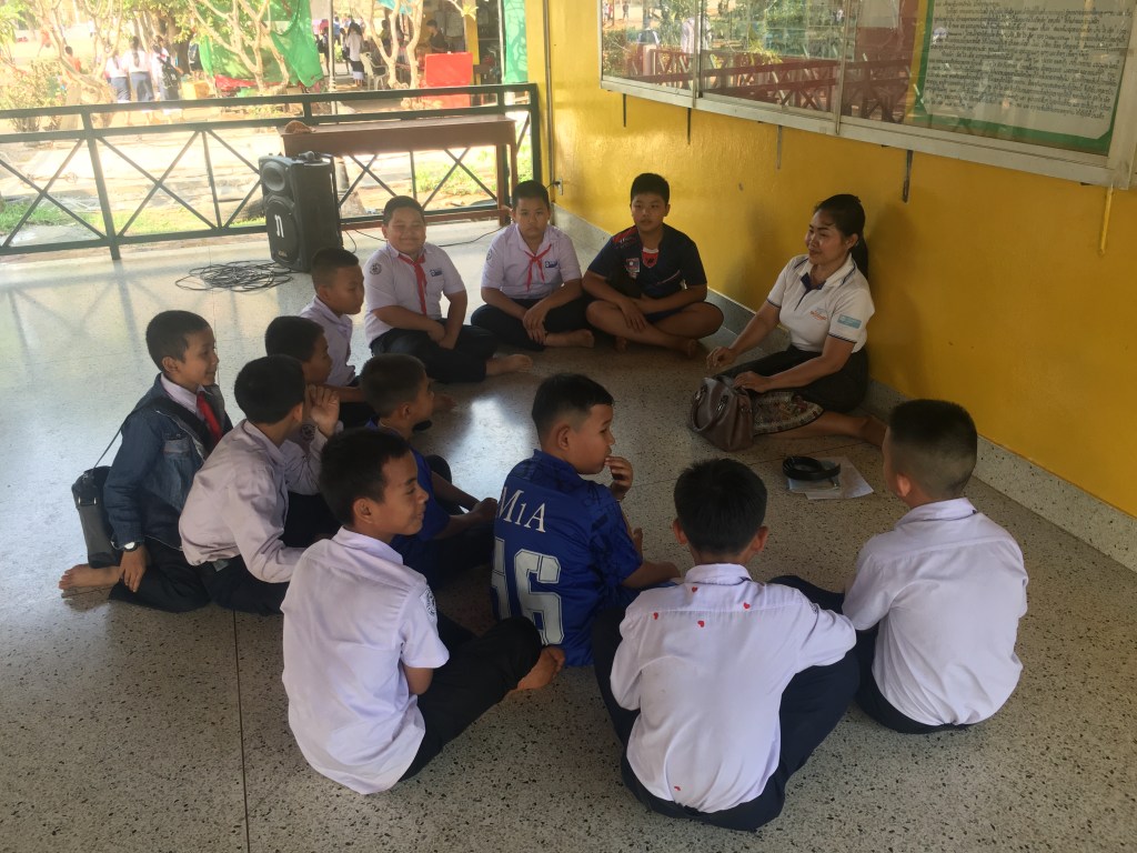 Phonesavanh fait du soutien oral avec un petit groupe, dans le hall.