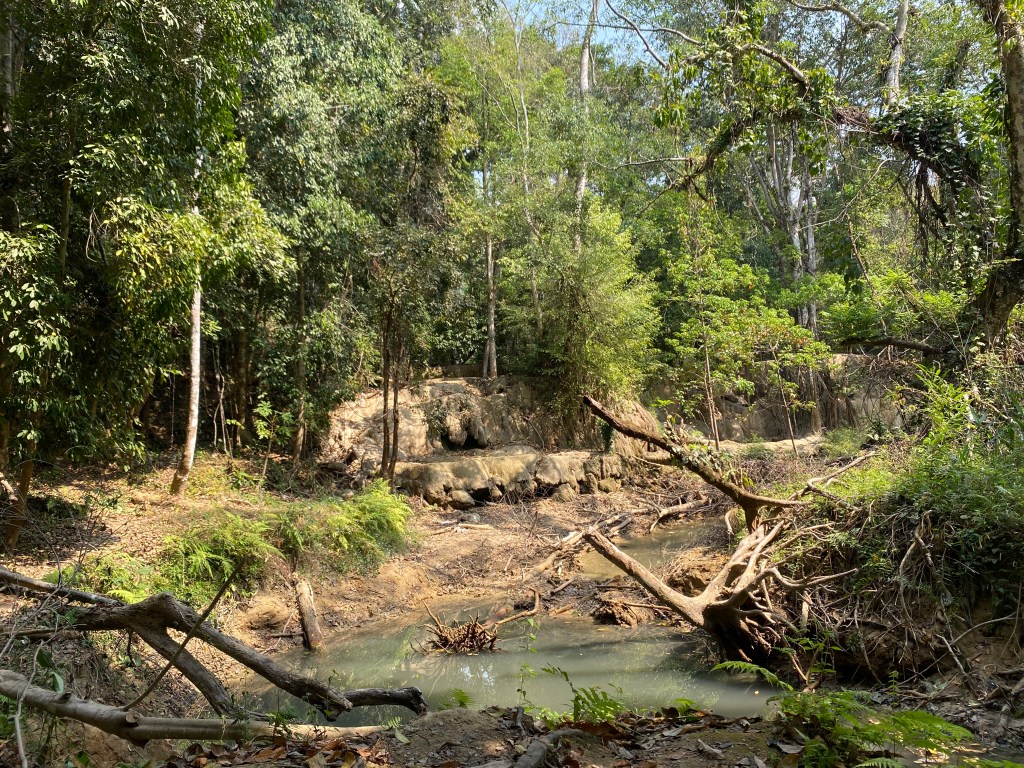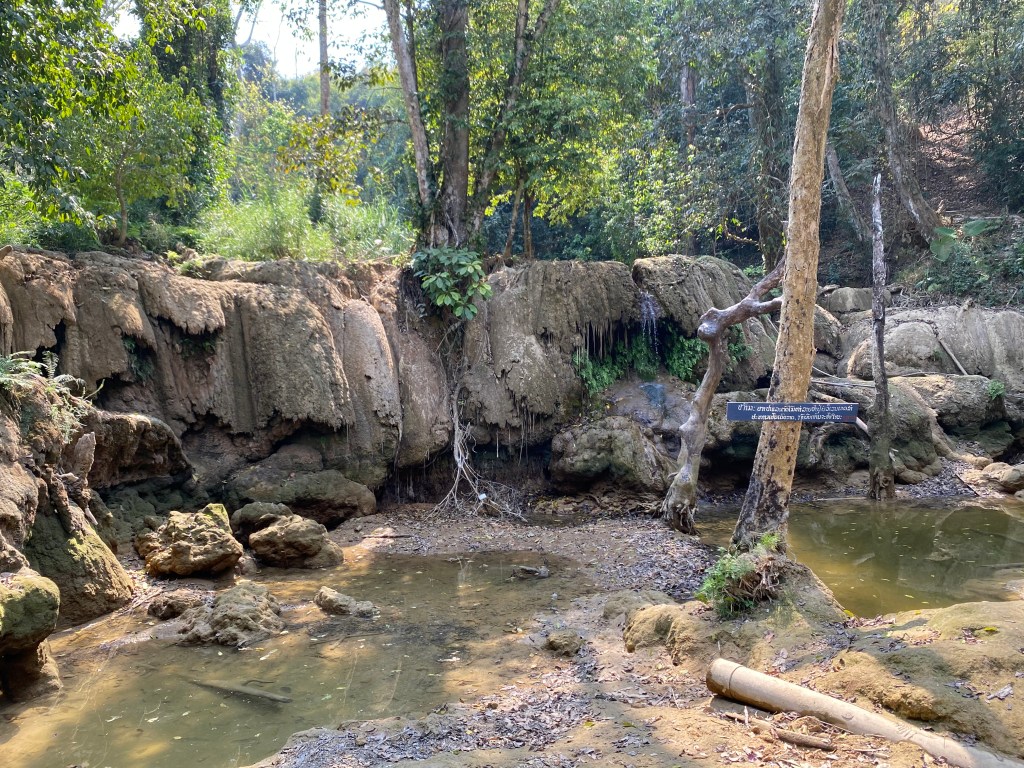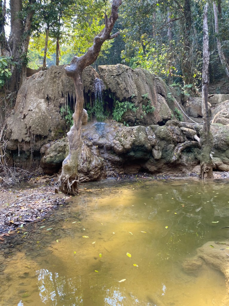 La balade en pirogue dure à peine un quart d’heure et nous voilà déjà arrivés. On paie l’entrée du site, et après quelques mètres, on aperçoit ce qui aurait dû être une cascade mais pas à cette saison visiblement. Seul un tout petit filet d’eau coule et encore, c’est parce qu’ils canalisent l’eau plus haut pour en avoir un peu…