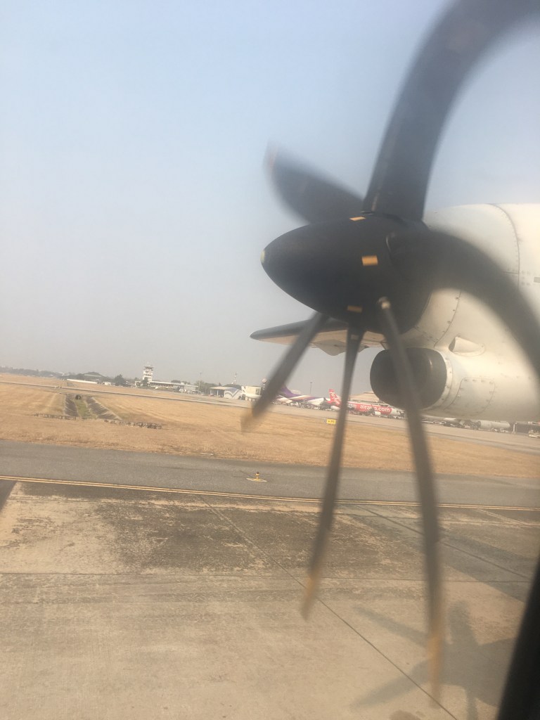 un avion qui pourrait appartenir à RyanAir, pas de place pour les jambes et j’ai un mal de chien à faire rentrer mon sac à dos dans le compartiment, il a fallu que je le vide un peu 😅Adieu Chian Maï, je ne regretterai pas ta pollution 😇La compagnie est, comment dire, tournée vers la Chine 😂Luang Prabang en vue…J’avais une vue imprenable sur l’hélice, pratique, j’ai pu la surveiller pendant l’heure qu’a duré le vol 😜en bas du chariot, on aperçoit ma valise dans le 3ème trou en partant de la gauche !Je vous avais déjà dit, dans le blog l’année dernière, que leurs aéroports étaient construits sur le même moule, ça se confirme 🤣