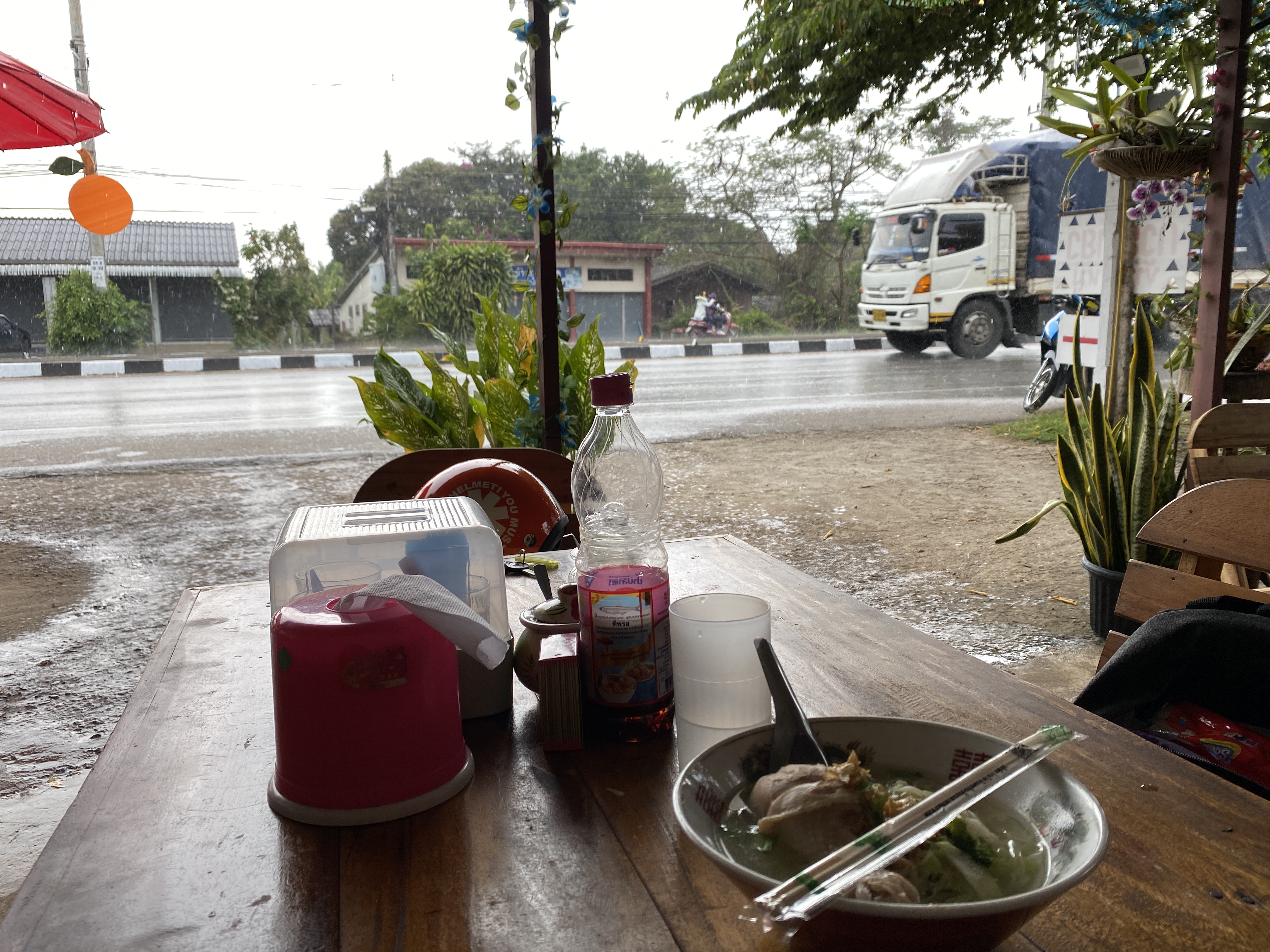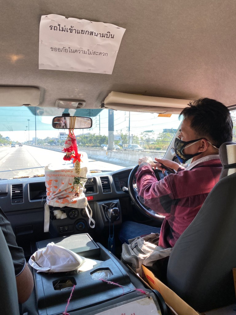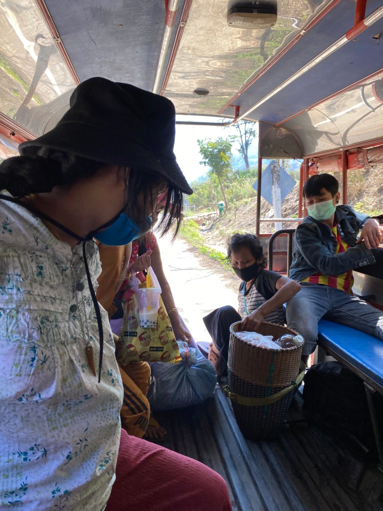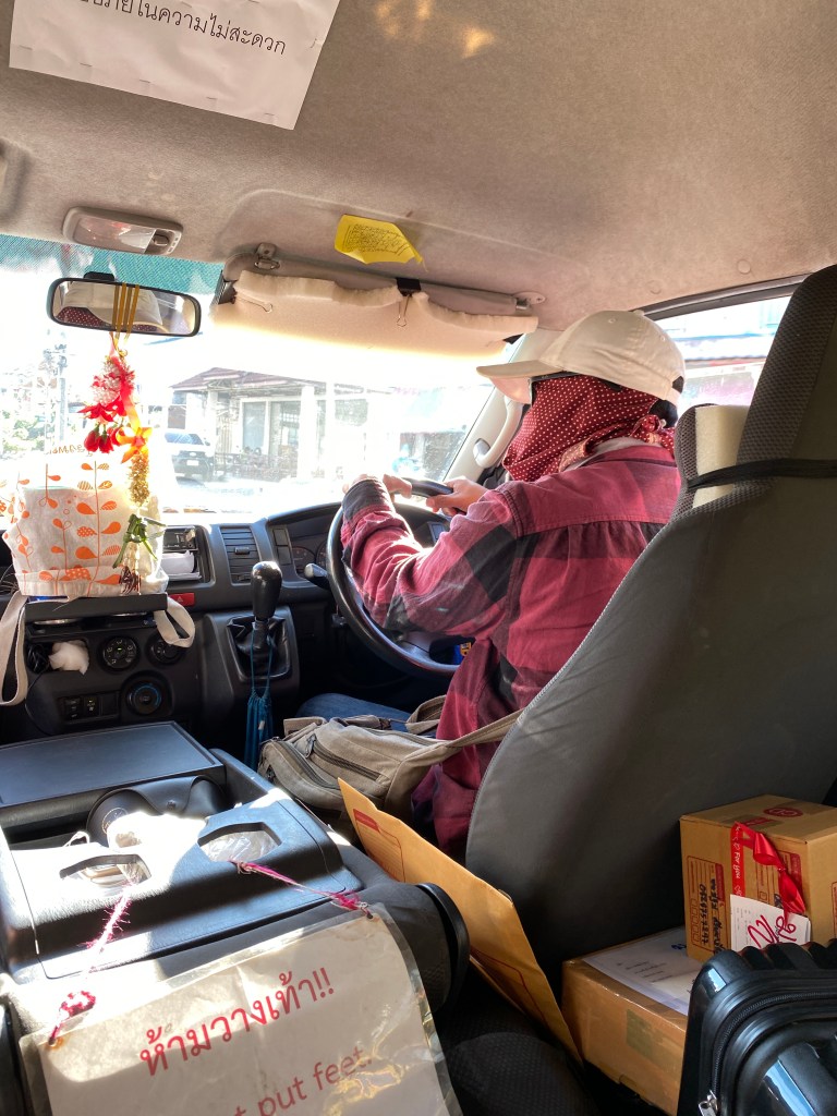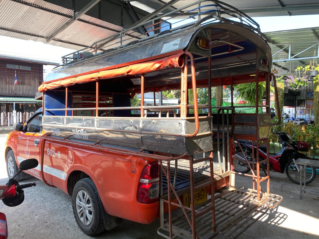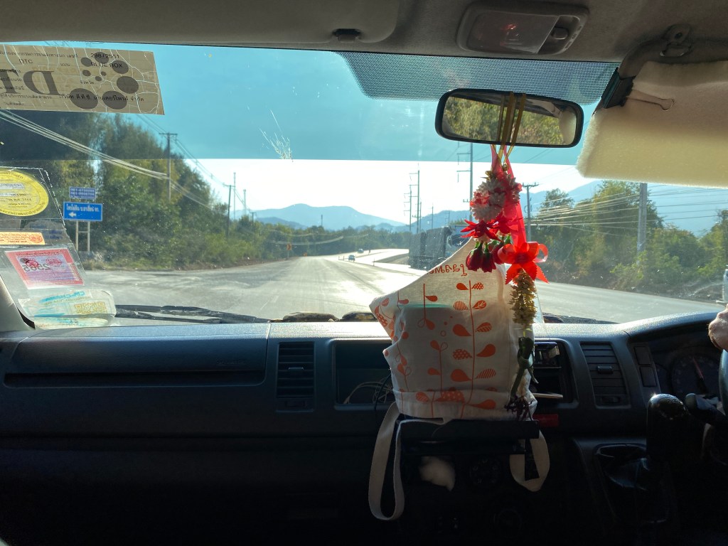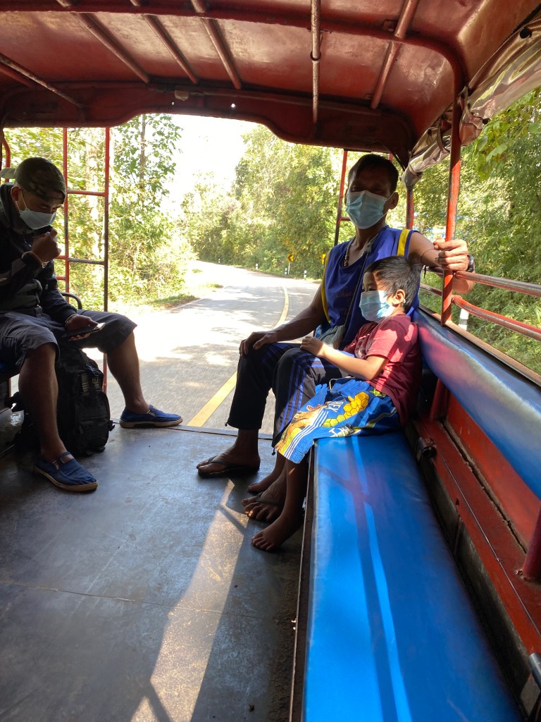Dimanche, me voilà donc de nouveau sur la route, je mets bien mon masque et heureusement, les transports que j’utilise sont « en plein air », les fameux Songthaew.