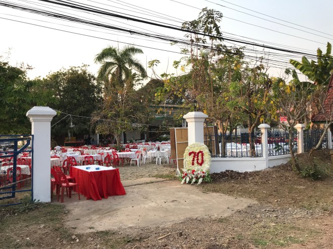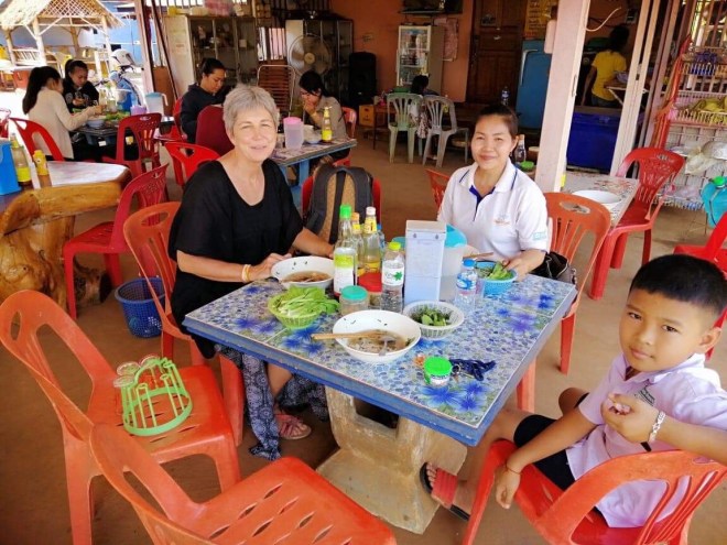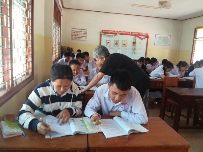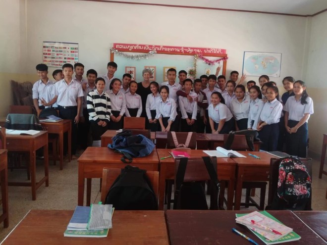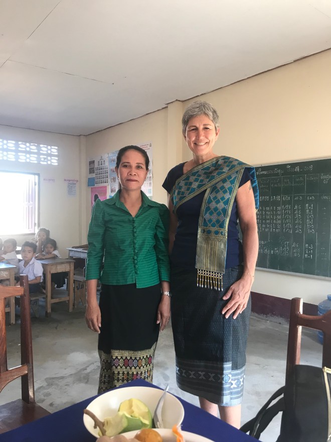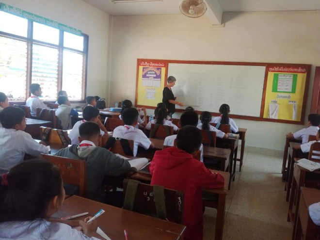 A l’école je n’arrive à faire que deux classes au lieu de trois sur le temps imparti parce que les enfants veulent plus. Je suis toute seule dans la classe, je dois me débrouiller parce que Sophavanh a sa propre classe à faire mais si j’ai besoin, je peux aller la chercher. C’est compliqué parce qu’ils ne comprennent pas ce que je dis, je suis en passe de devenir très douée pour parler avec les mains. A la fin des cours, lors du petit café avec les instits, je demande ce dont elles ont besoin. Elles me disent qu’elles ont besoin de manuels et effectivement, les leurs sont en très mauvais état. Comme je vais à Paksé ce we, je propose de leur en offrir, elles me font une liste longue comme le bras, j’explique que je n’en prendrai que la moitié. Même à 2€ le bouquin, quand elles en commandent 200, ça fait cher. Mais elles ont raison, qui ne tente rien, n’a rien 😉