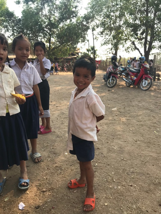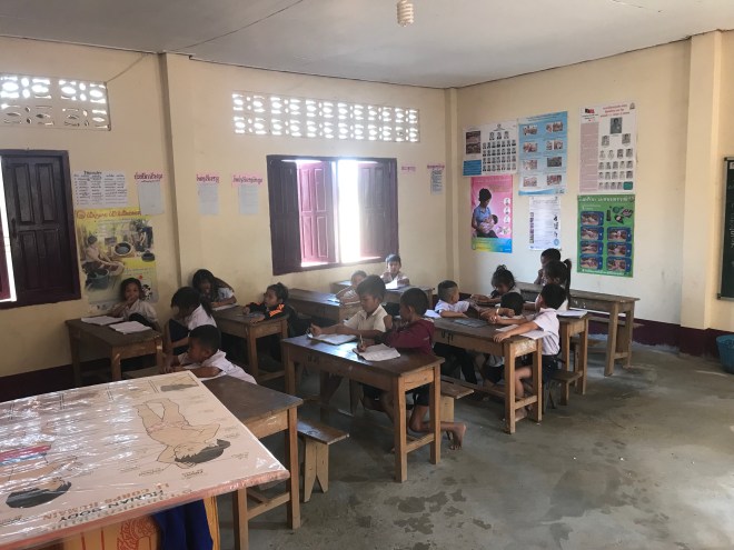 Elle m’explique que je vais faire cours à des 7-8 ans, ils doivent être en équivalent CE1. Je demande à voir le livre et à savoir où ils en sont, et je comprends que ce ne sera pas la même chose que l’année dernière à SOS Children Village où j’avais eu des collégiens et lycéens, et où, je pense, que le niveau en première devait être meilleur. Ici, ils savent répéter les mots, mais ne comprennent pas les phrases, même toutes simples. Sophavanh reste avec moi, mais ne m’aide pas beaucoup, je pensais qu’elle traduirait au moins un peu, en fait elle suit mon cours comme une élève ! Je transpire beaucoup, entre le stress et les presque 40° dehors…Il n’y a pas de ventilateurs dans la classe, je ne parle même pas d’une clim 😉 Les fenêtres n’ont pas de vitres et on fait courant d’air en laissant les volets ouverts de chaque côté de la classe. Je finis par trouver un semblant de rythme, en tous cas les enfants aiment et ne veulent pas que j’arrête. J’explique à Sophavanh que si elle veut que j’aie le temps de faire les trois classes, je dois m’arrêter là.